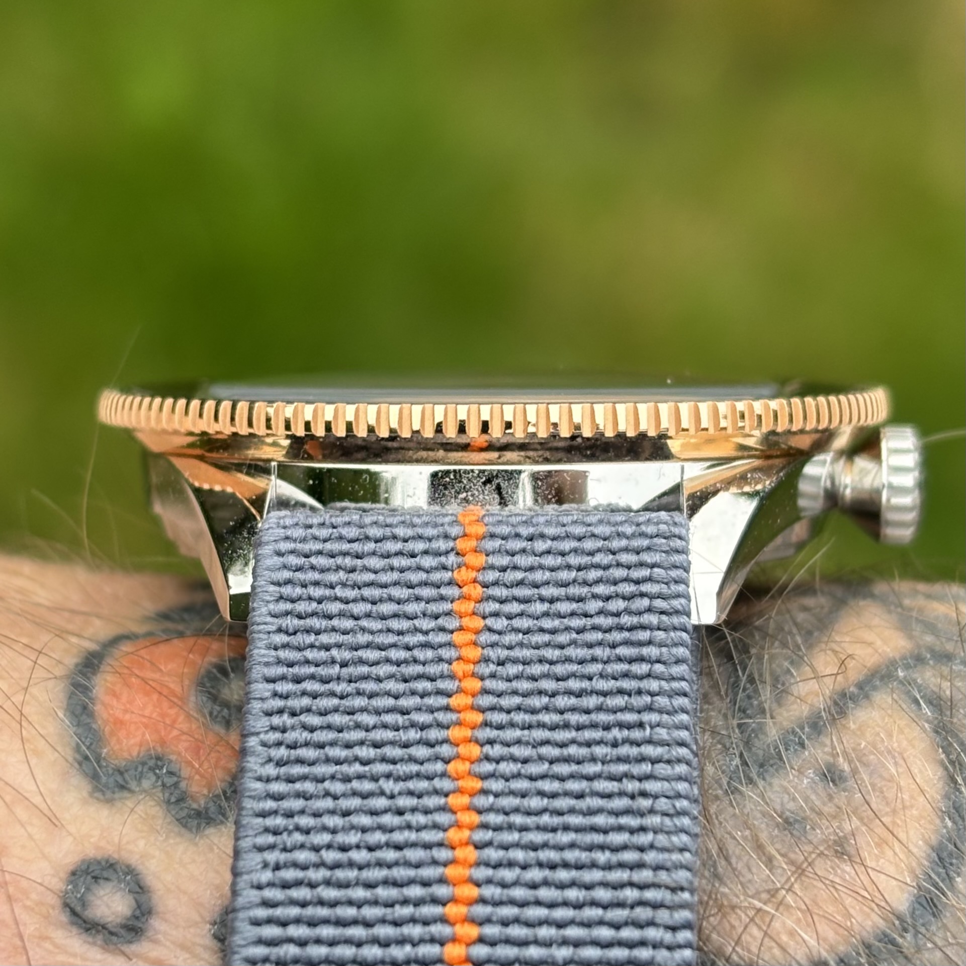 Bandjes besteld, voor nu is dit de enige elastische 20mm in huis … geen geweldige combi maar het doet wat het moet doen , klokkie om de pols houden .