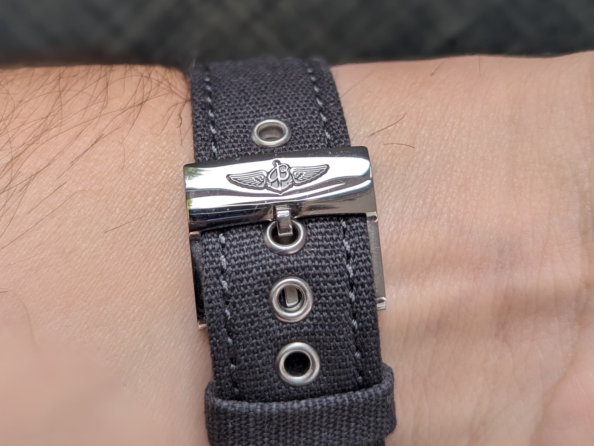 Even een nieuwe testopstelling. Glimband eraf, grijze 18mm canvasband erop. En wie wat bewaart, die heeft wat: een 18mm Breitling gesp!