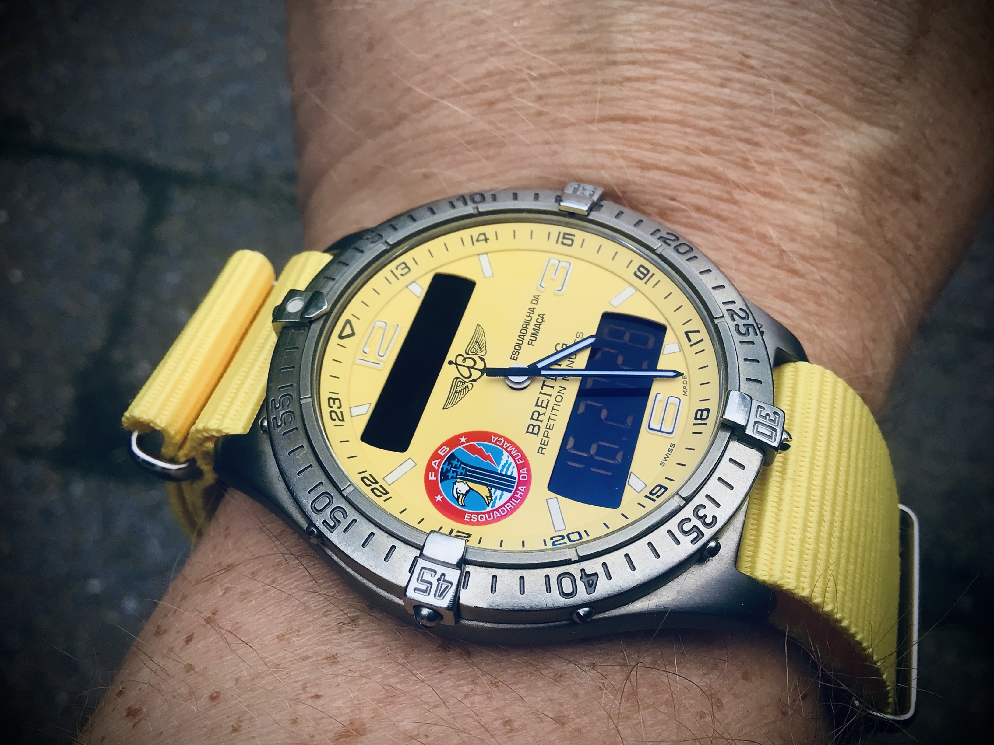 Oprecht jammer om te lezen dat er zo veel gedonder is met die nieuwe Aerospace uurwerkjes. Terwijl die oude modellen nu juist uitzonderlijk betrouwbaar waren! Online genoeg voorbeelden van 30 jaar ouden Aerospaces met nog het fabrieks-uurwerk en na tien+ batterij-wisseltjes nog steeds lopen als een zonnetje. Over zonnetjes gesproken, deze zeer vrolijke unieke aerospace met originele uurwerk ook alweer ruim 20 jaar oud en still going strong! ![]()