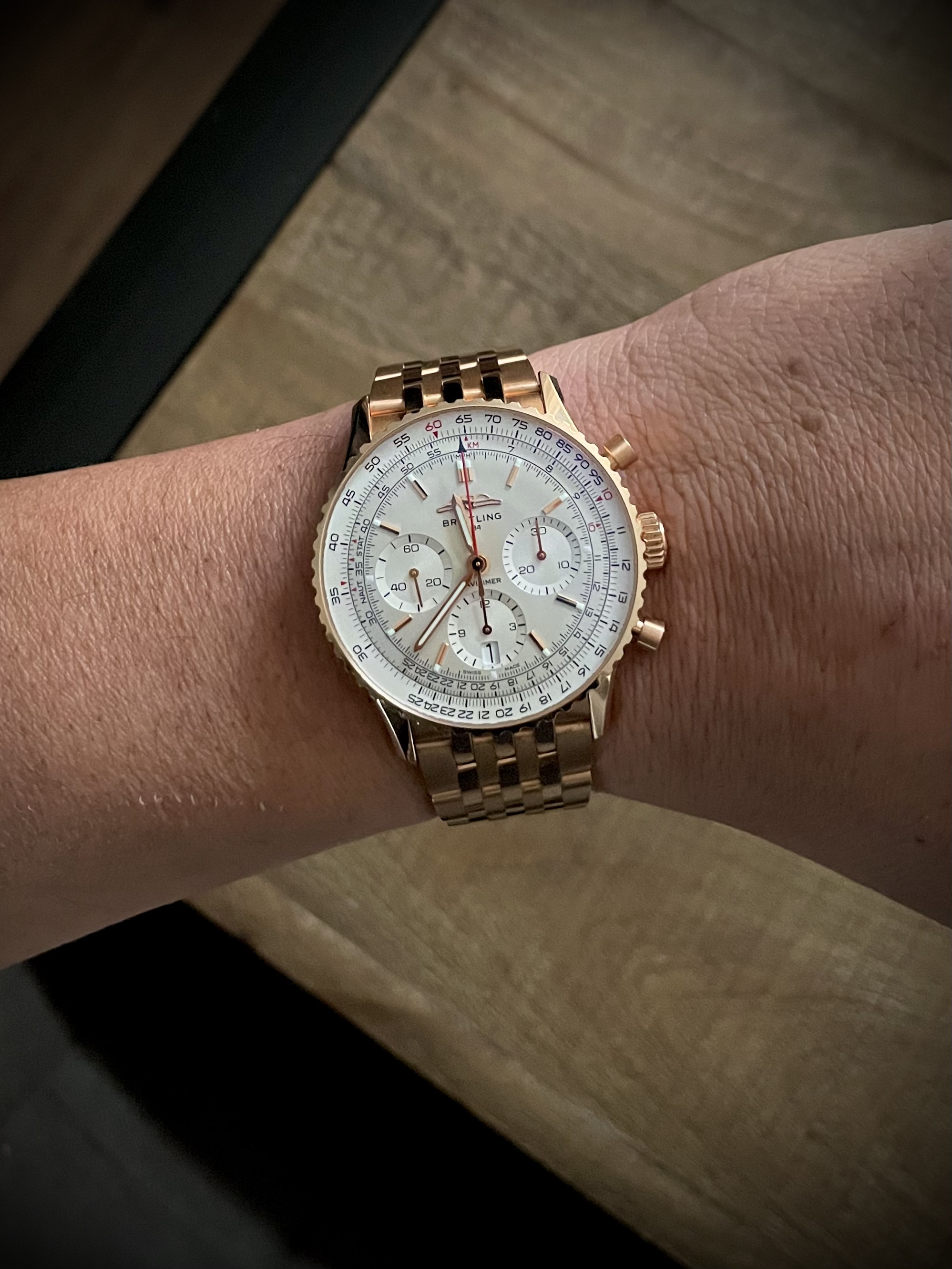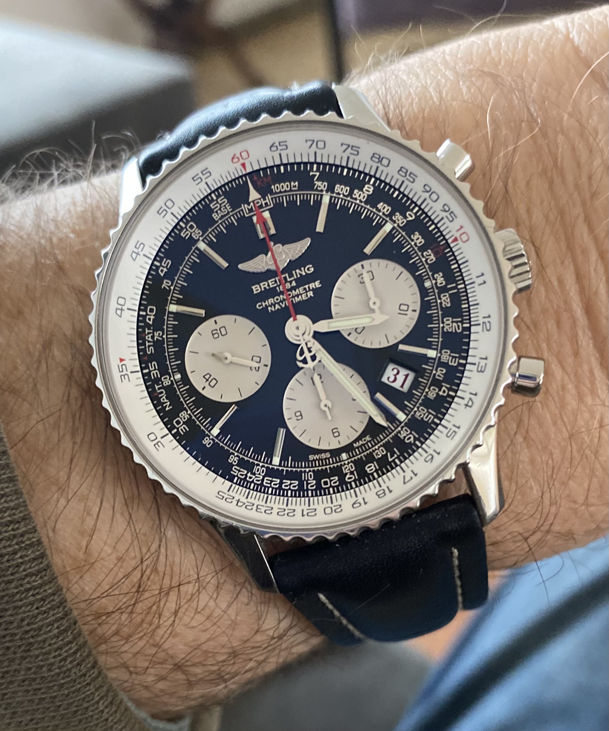 Dit weekend mijn nieuwste Navitimer nog eens gedragen. Eerst de metalen band er terug op gedaan. Een totaal andere look dan met de zwarte croco band. Ik draag ze de laatste tijd veel te weinig. Maar dit blijft toch een prachtig horloge. De ene moment zie je de blauwe schijn goed, onder een andere hoek is het weer meer zilvergrijs.