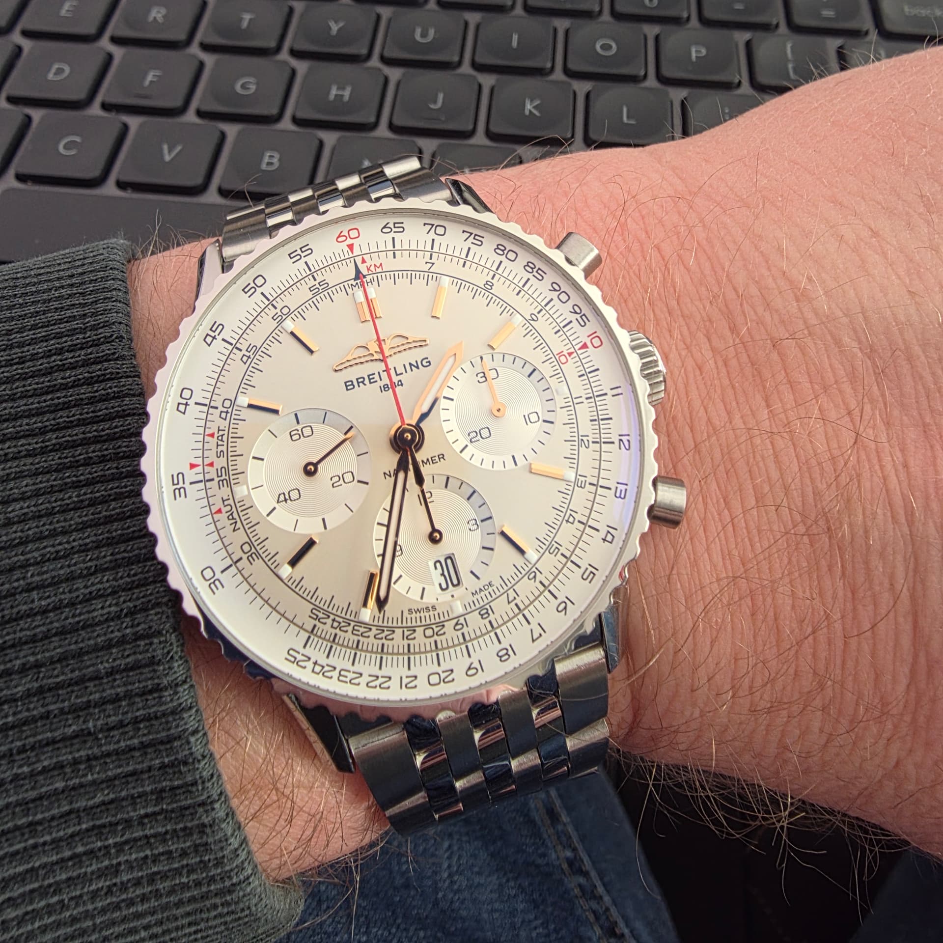 Wat ik mij heb laten vertellen is dat de naam Navitimer niet helemaal overeenkomt met de specs die hij zou moeten hebben(voor Navitimer begrippen). Vandaar dat na een periode al gekozen is voor Aviator. In-en uiterlijk nauwelijks tot geen wijzigingen.