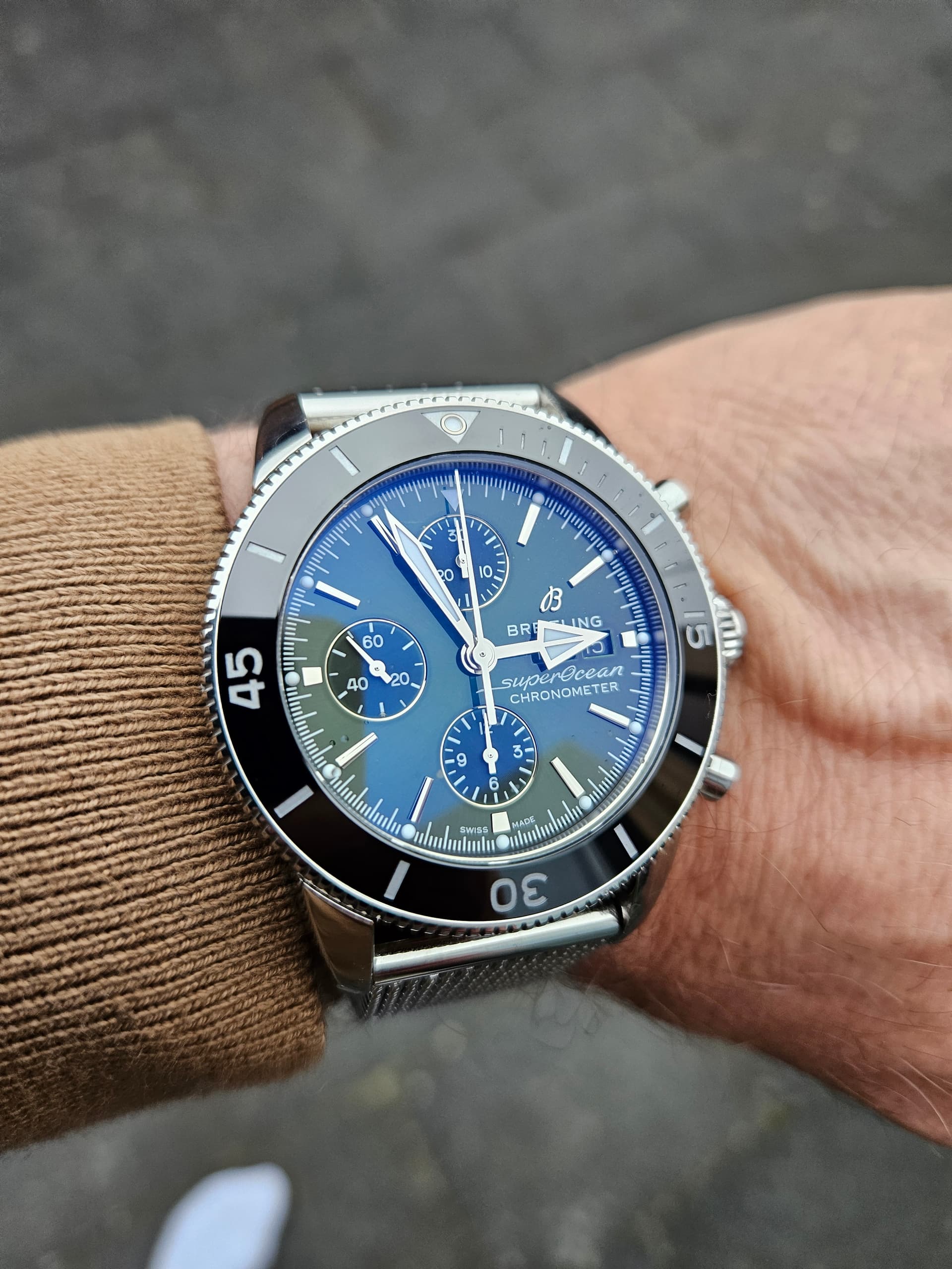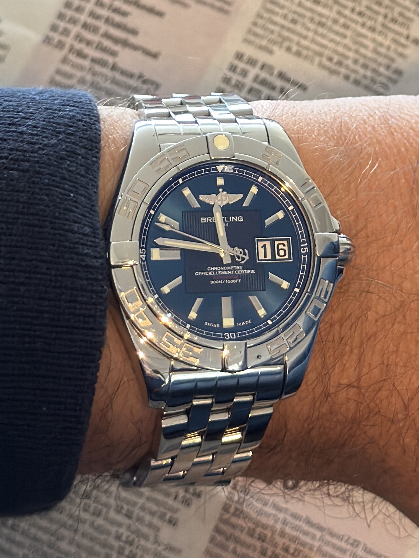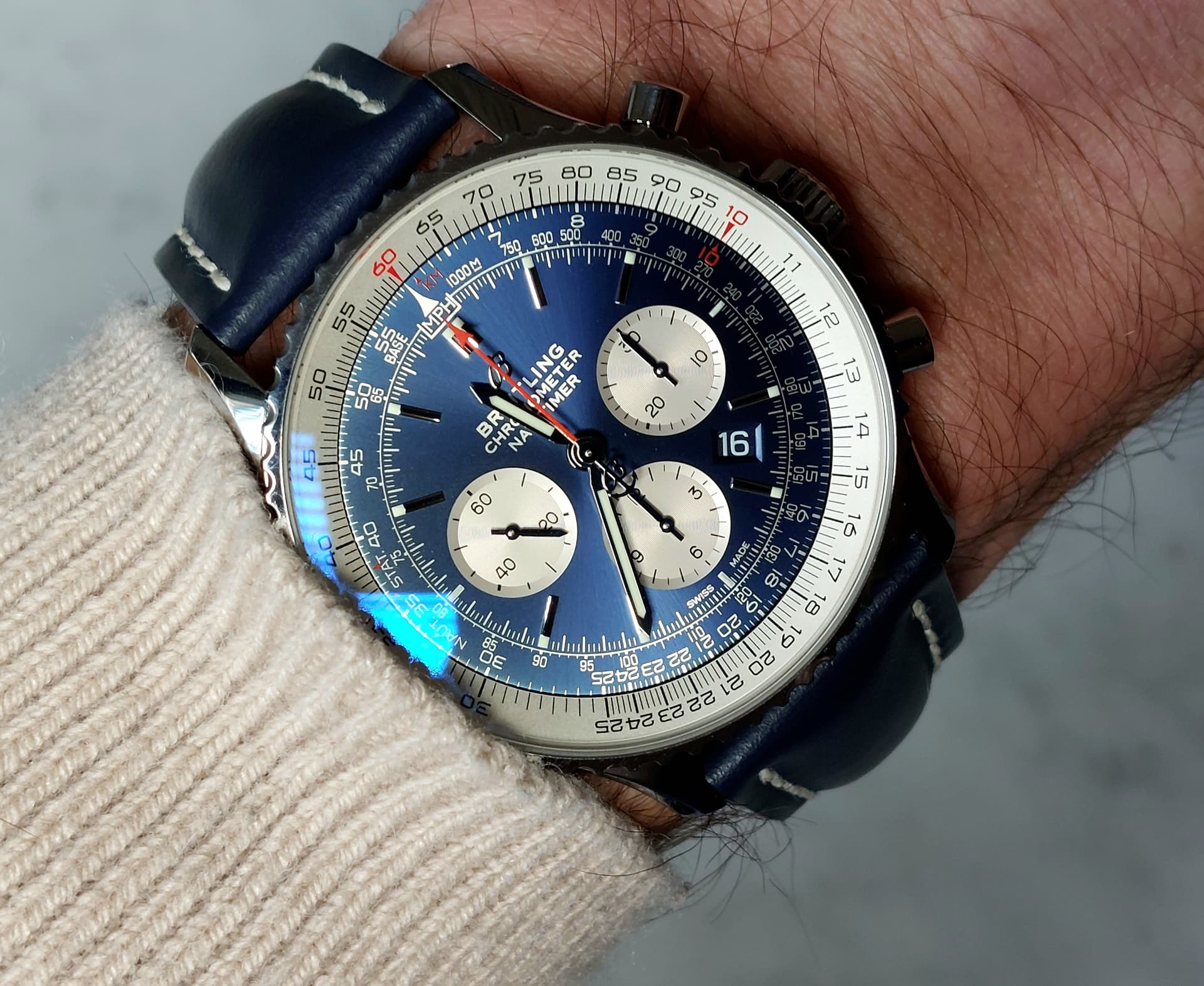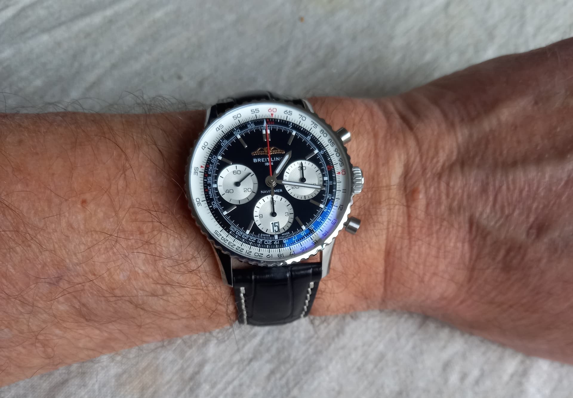 Ik heb het horloge gekocht met de stalen band, maar vind hem op deze band veel mooier. Een Navitimer hoort eigenlijk gewoon op leer is mijn mening.