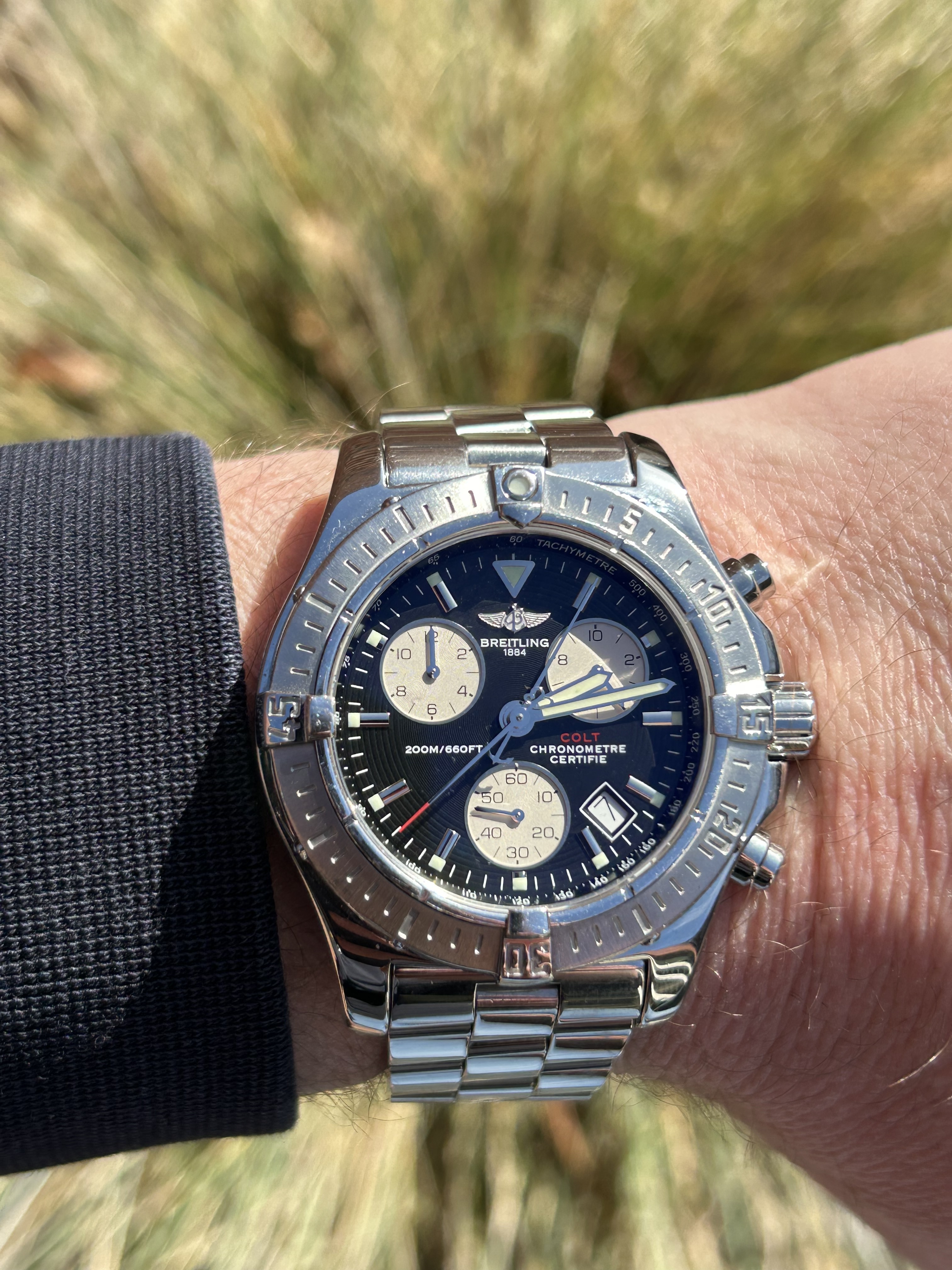 De oude Colt maar weer eens omgeslingerd. Ik draag deze het minst van de verschillende Breitlings maar de sporadische keren dat ik hem om heb vind ik hem toch weer mooi.