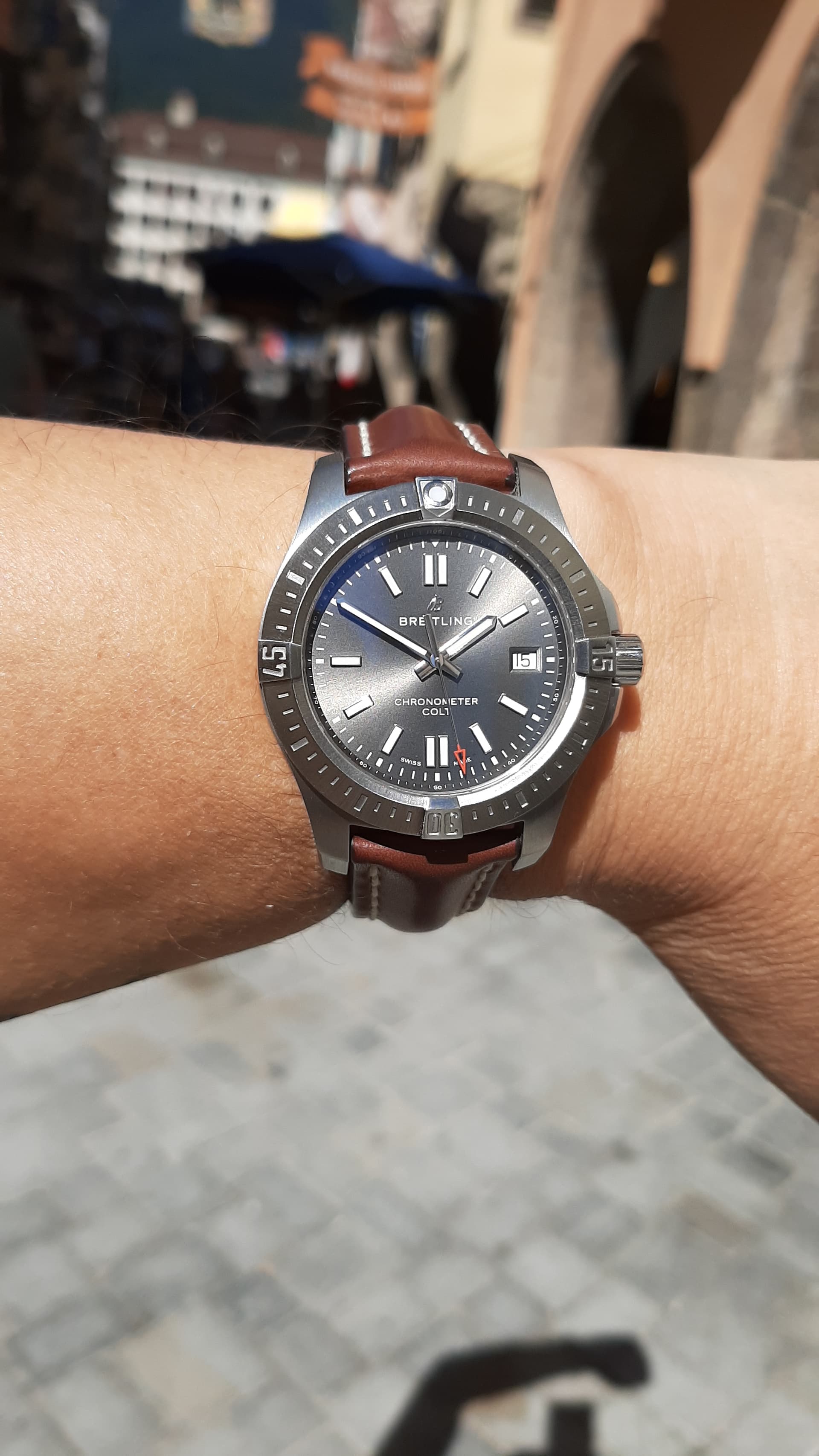 Vandaag bij Dallinger in Innsbruck het bestelde Breitling leren horlogebandje met vouwsluiting voor mijn Colt opgehaald en gelijk maar laten monteren. Dus wissel van staal naar leer. Het leer moet nog soepel worden, maar zit nu al lekker. Heel andere look en, vind ik, bijzonder geslaagd.
