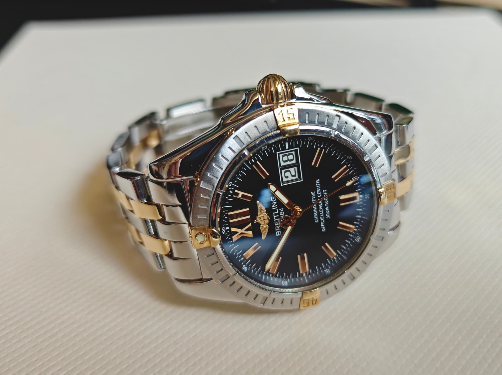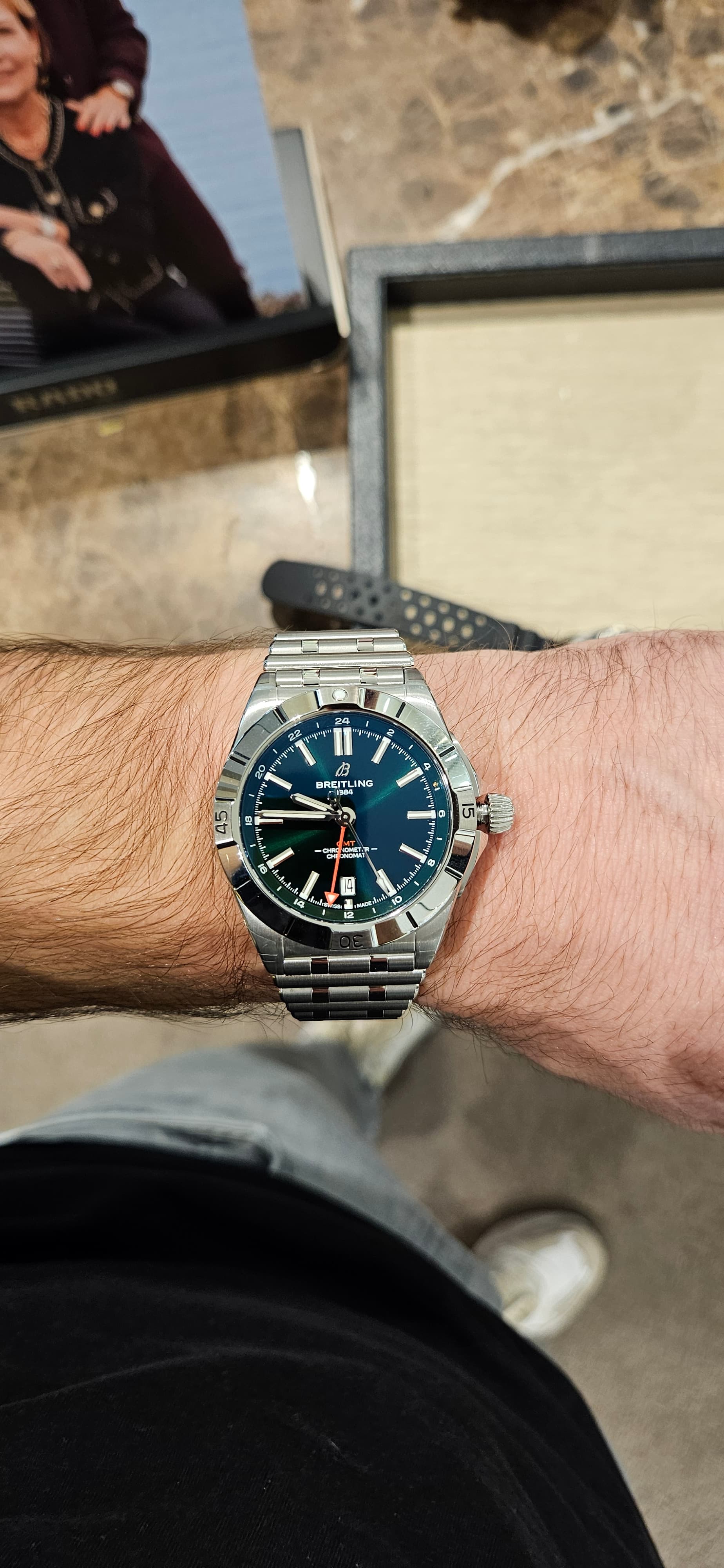 . Het horloge is best zwaar. Met de Navitimer heb ik dat niet. Ik heb de Chronomat B01 ook in het groen en de kleur is echt fantastisch. Dan weer donkergroen, of zwart of sunburst.