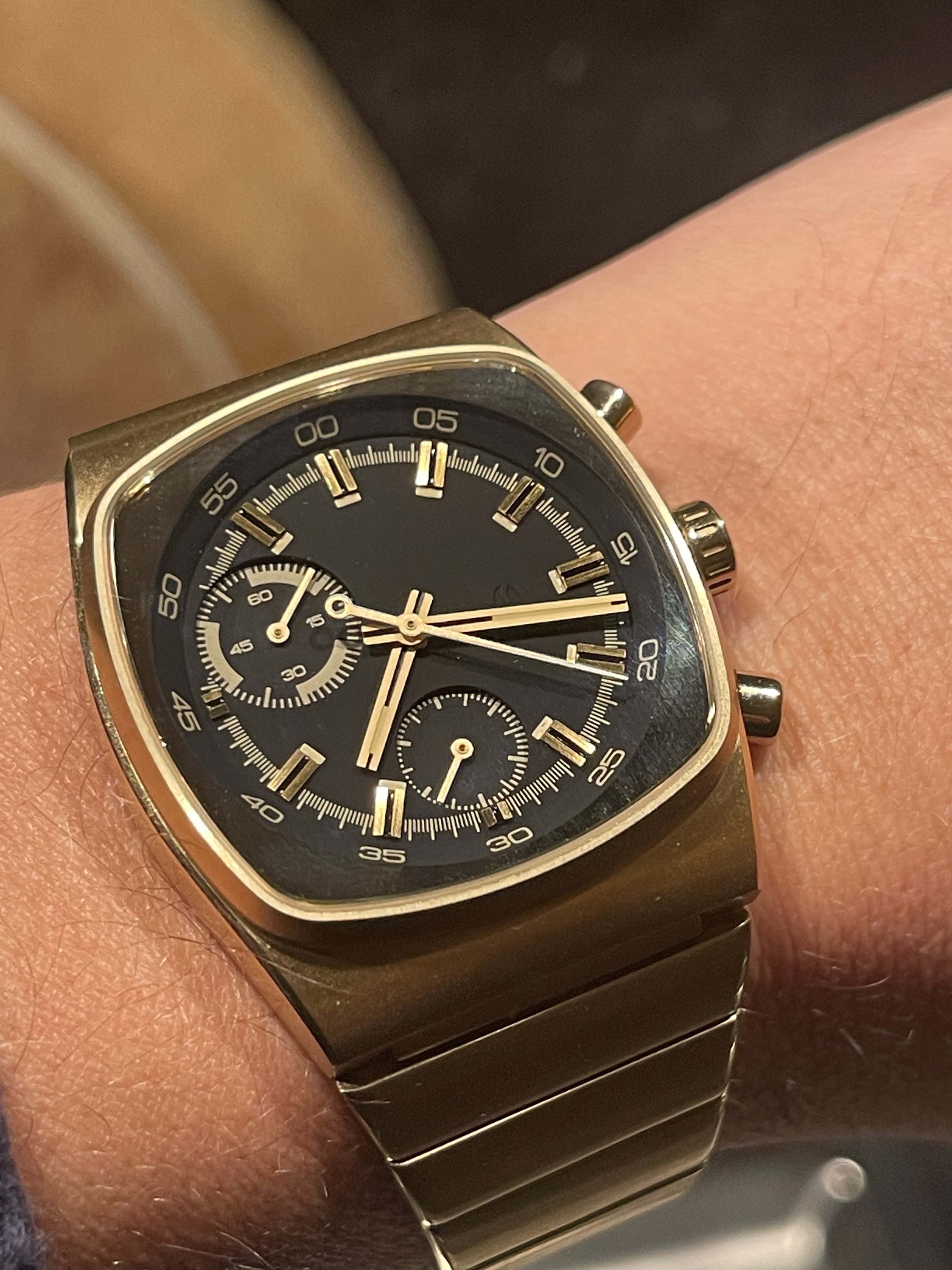 Al m’n andere horloges leggen het af qua tijd dat ze om m’n pols zitten. De stalen band met z’n gigantische taper zit super comfortabel en de wijzerplaat met z’n kleuren en afwijkende layout blijft interessant. En de chronograaf wordt uiteraard dagelijks gebruikt bij het zetten van de koffie