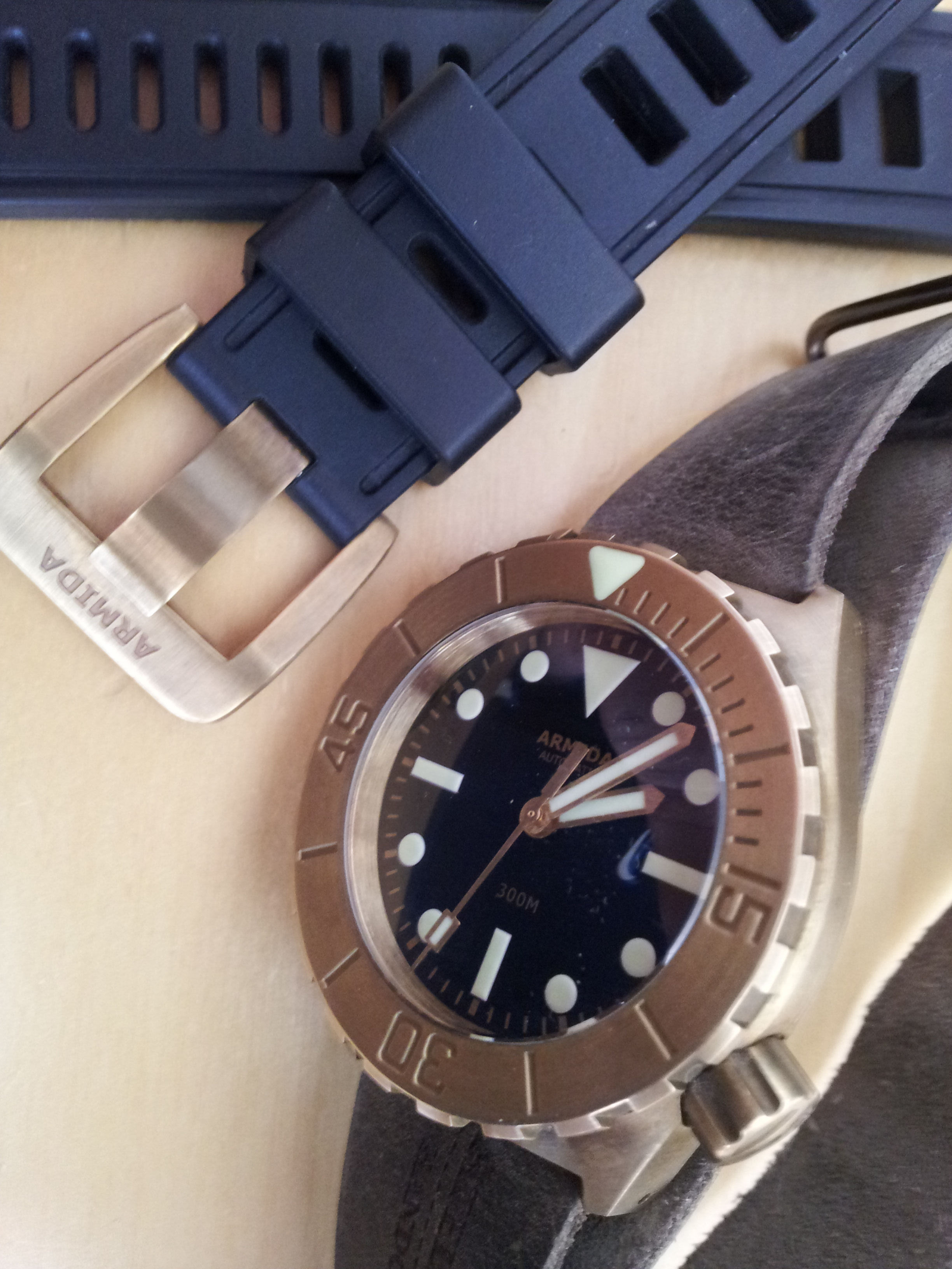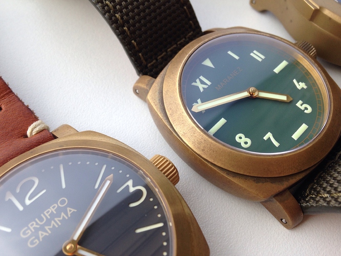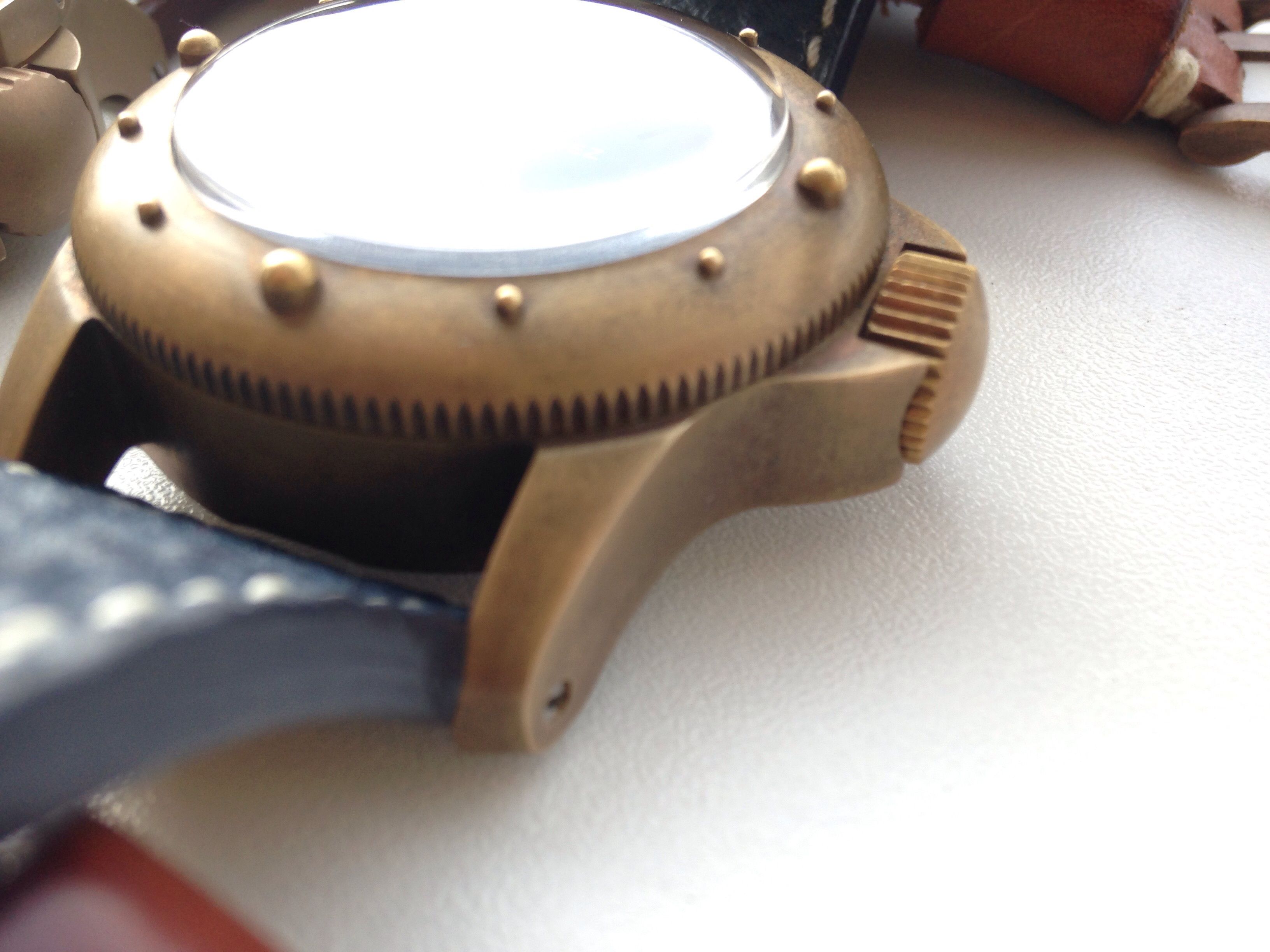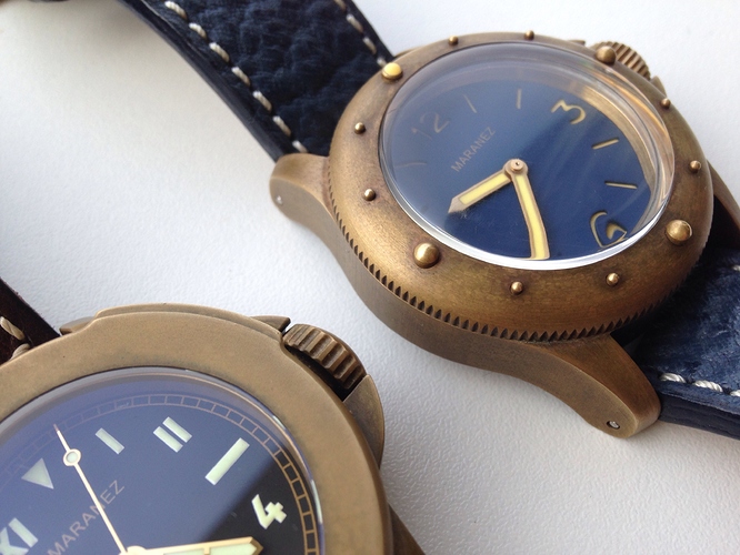 Ik heb een Magrette Bronze, eigenlijk wannabe brons want het bleek later meer brass te zijn, maar het effect is een beetje hetzelfde…de verkleuring…vind ik juist gaaf, ook de reden waarom ik überhaupt die klok kocht, ik zou de patina zijn werk laten doen, als je een smetteloos bronzen klokkie wilt met dus een hoog goudkleurig bijna glimmende kast dan zou ik gewoon een klokkie kopen met een rosé gouden coating…blijft mooi. Nee, mijn voorkeur heeft een mooie robuuste bronzen duiker…hoef je je ook niet druk te maken om een vlekje of krasje meer of minder:-)