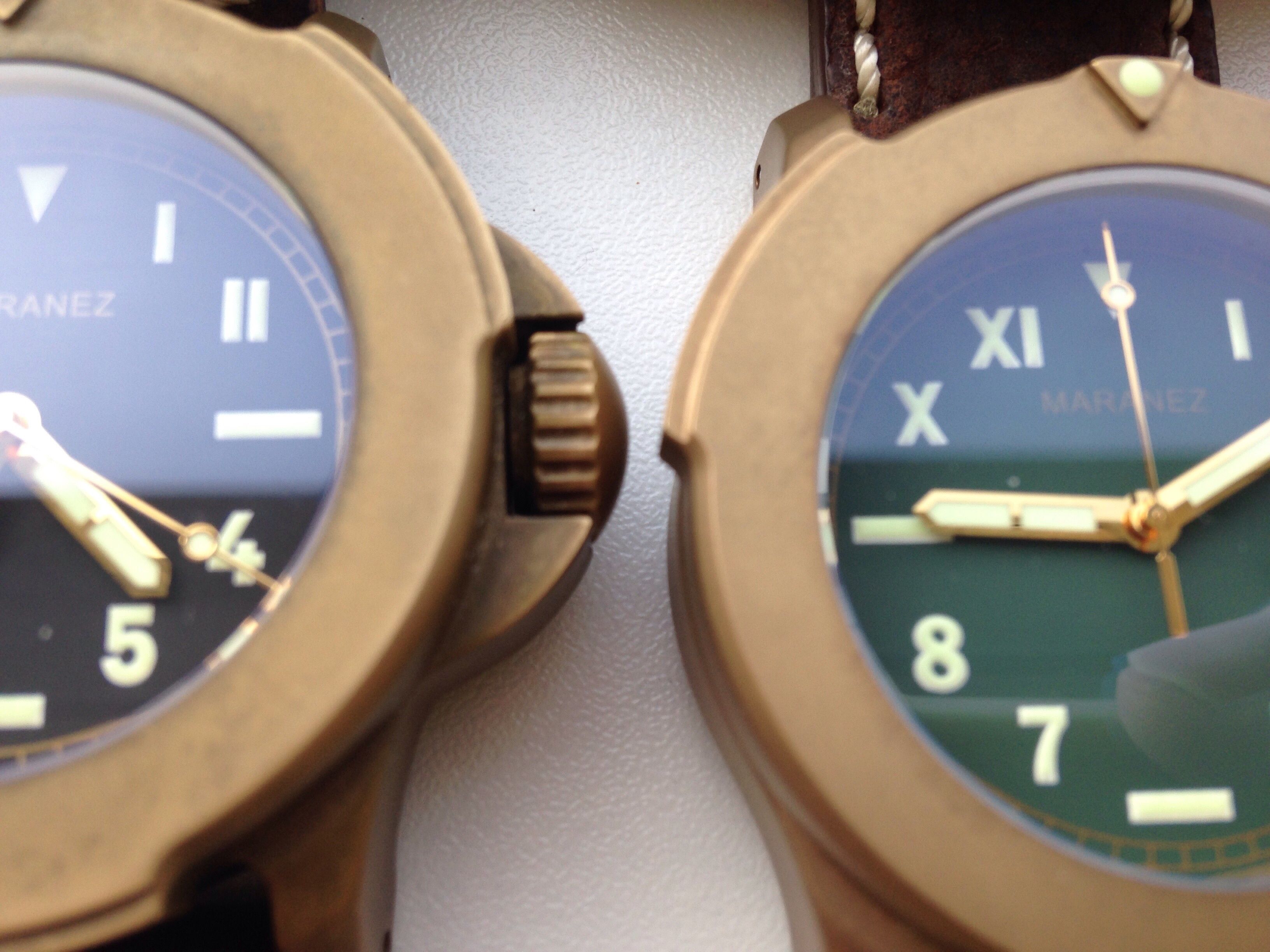 De Banglas die ik heb zijn 44mm, daardoor vallen ze eigenlijk best klein, de Rawai valt een stuk groter. En de Banglas zijn gestraald, de Rawai is net als de Layan gebrushed, wat zorgt voor een andere patina.