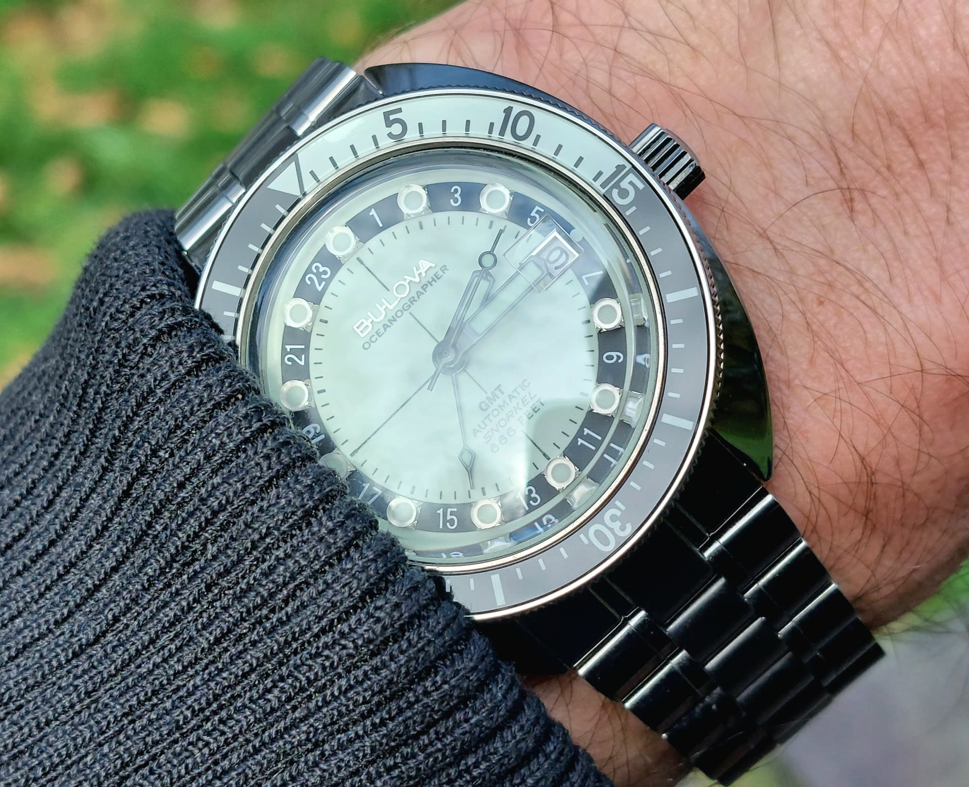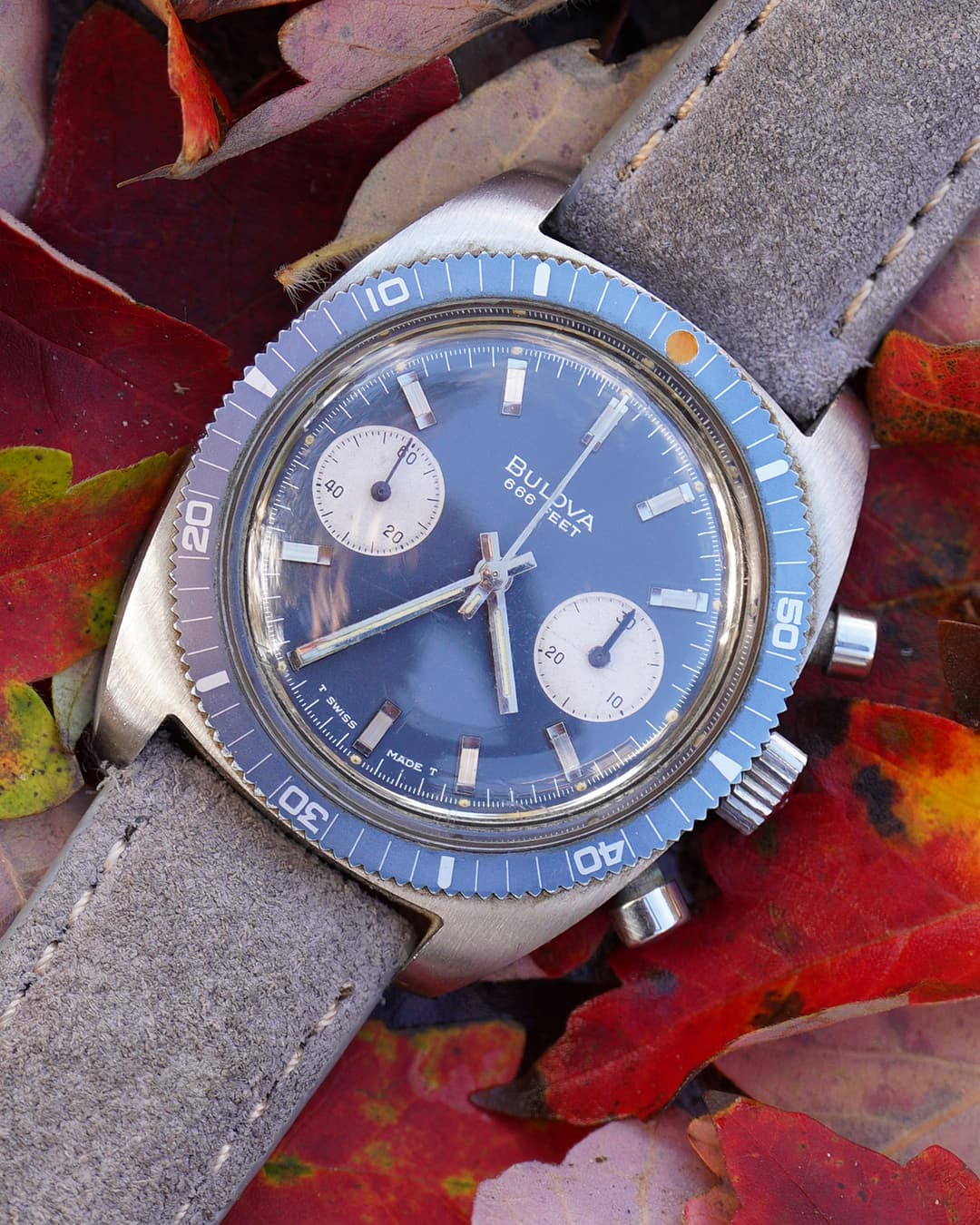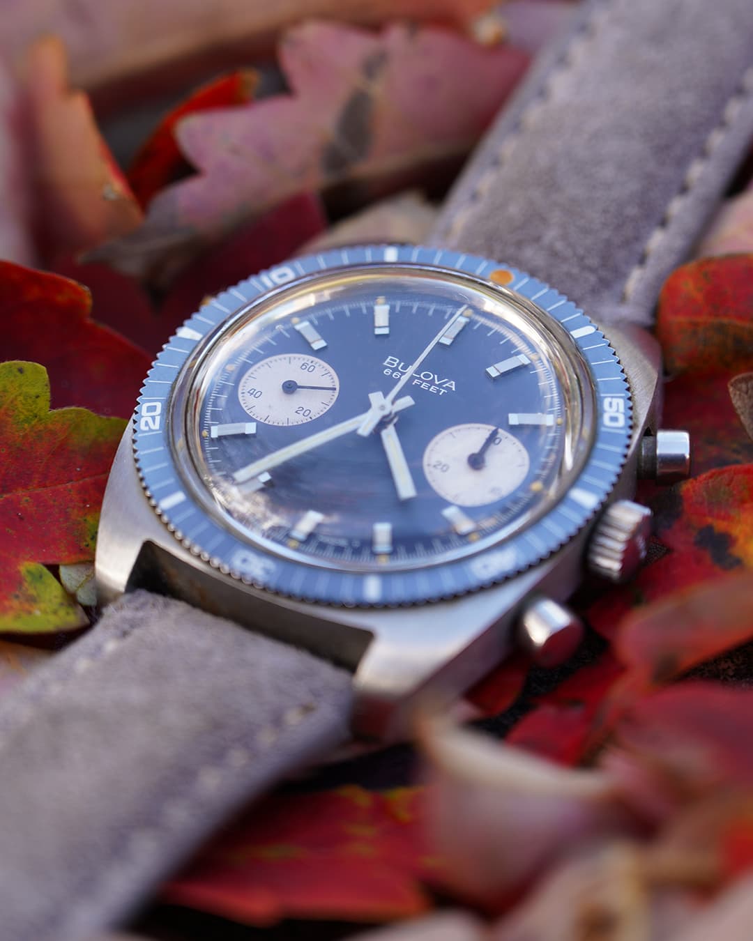Vandaag van het herfstzonnetje gebruik gemaakt om m’n nieuwe aanwinst op de foto te zetten. Bulova Deep Sea Chronograaf van 1971, ook wel bekend als de Devil Diver. Mooie orginele staat met een prima werkende Valjoux 7733 handwinder. Zal 'm binnenkort wel even een beurtje geven want dat was al wel een tijdje geleden volgens de vorige eigenaar.