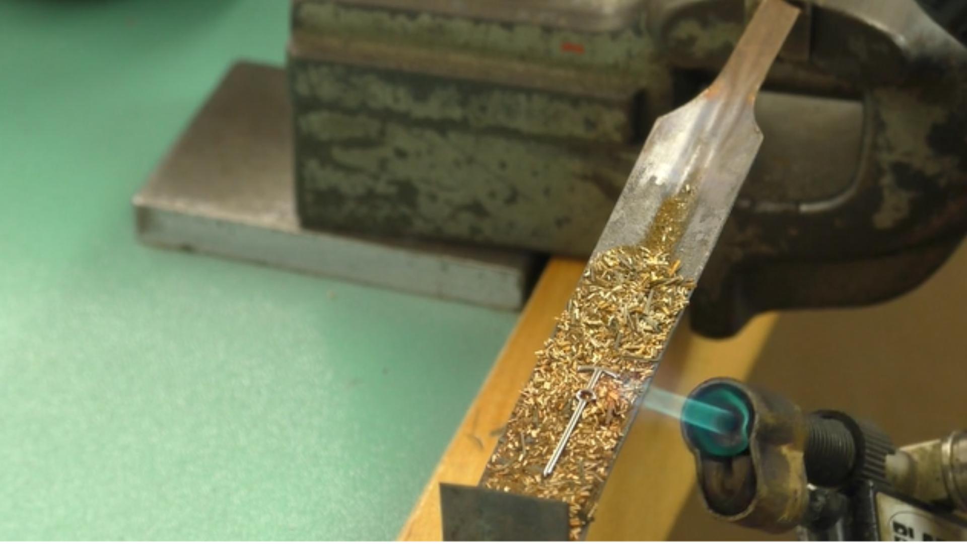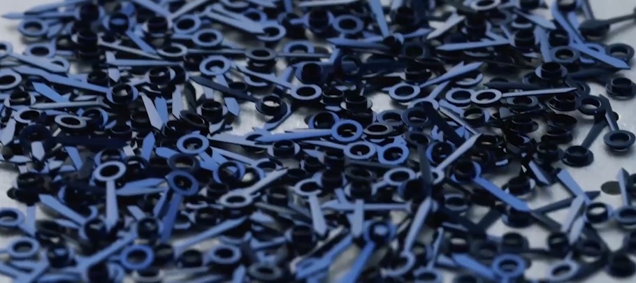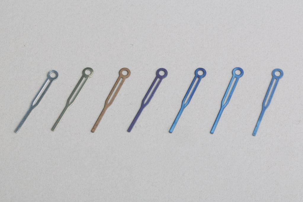 De wijzers worden gemaakt van staal, gevormd en perfect gepolijst waarna ze worden verhit tot ongeveer 290 - 300 °C**