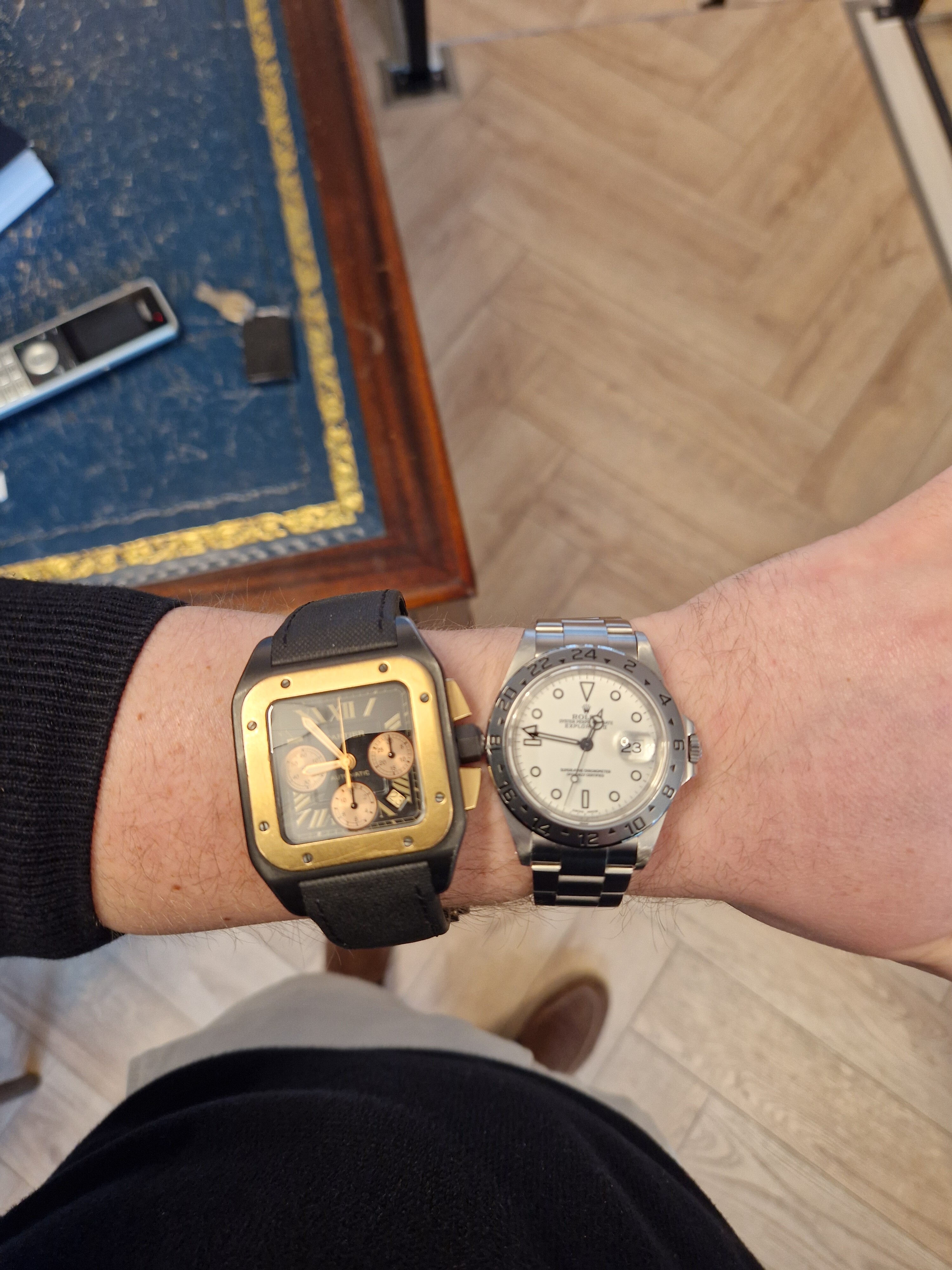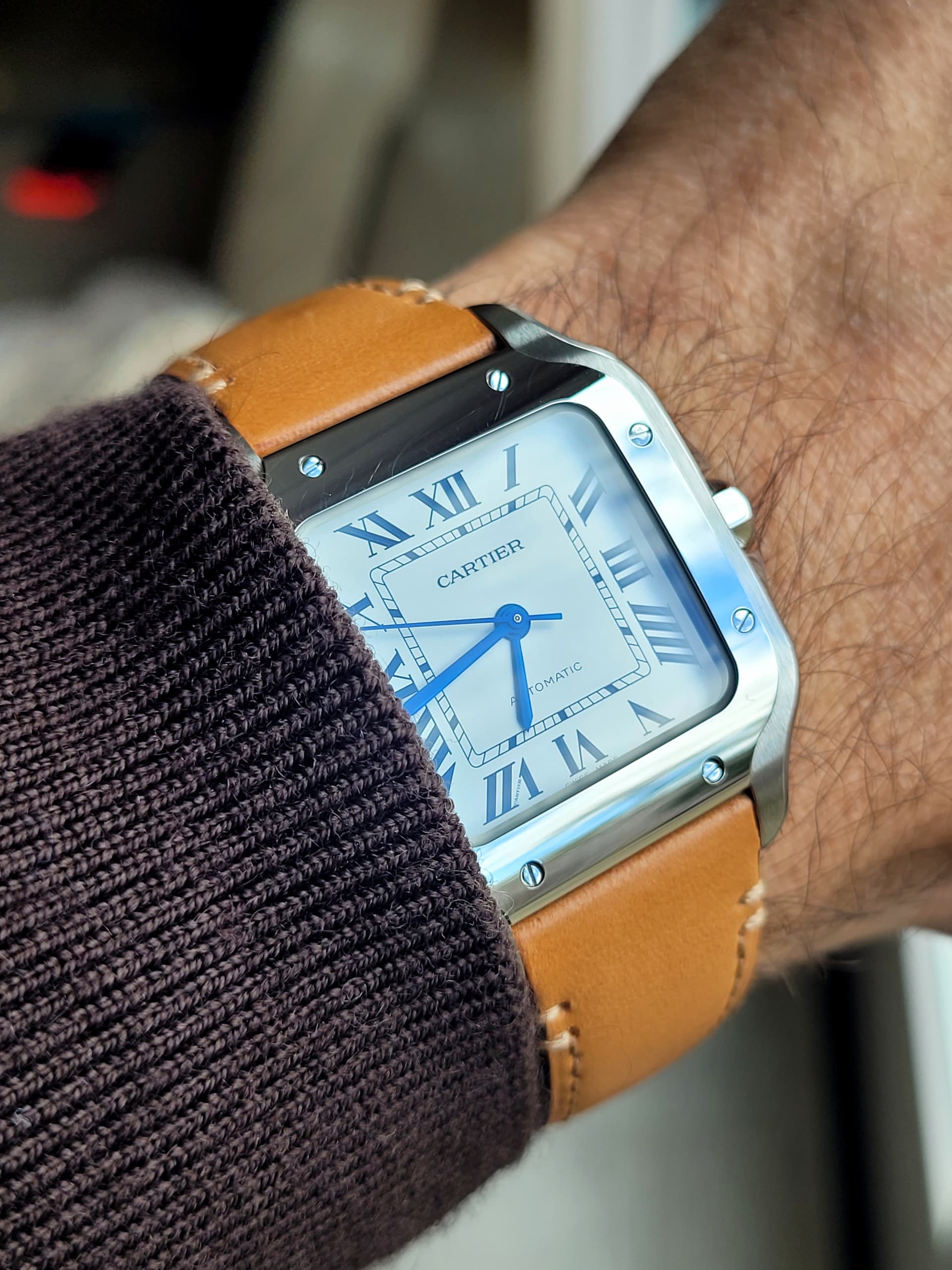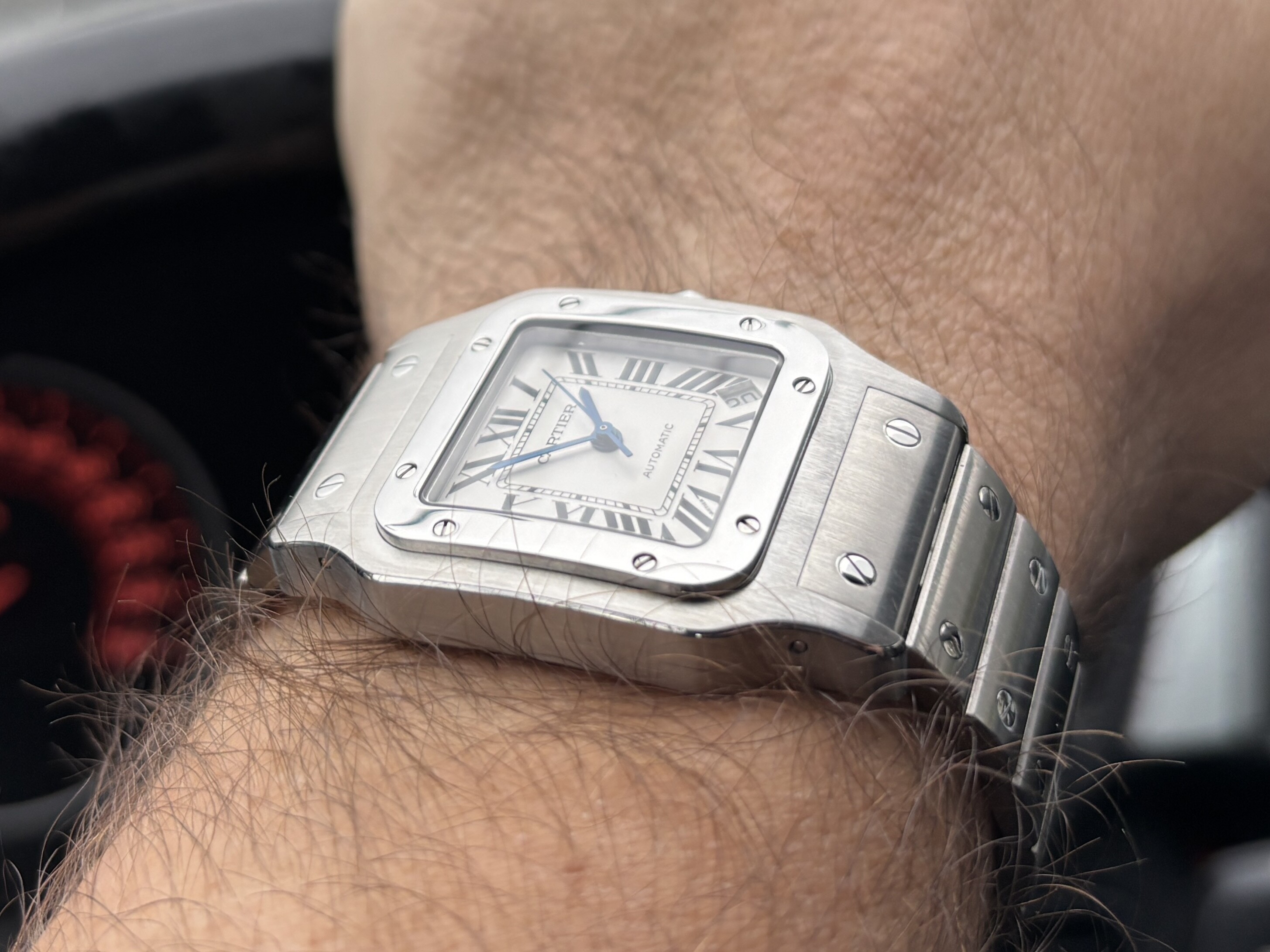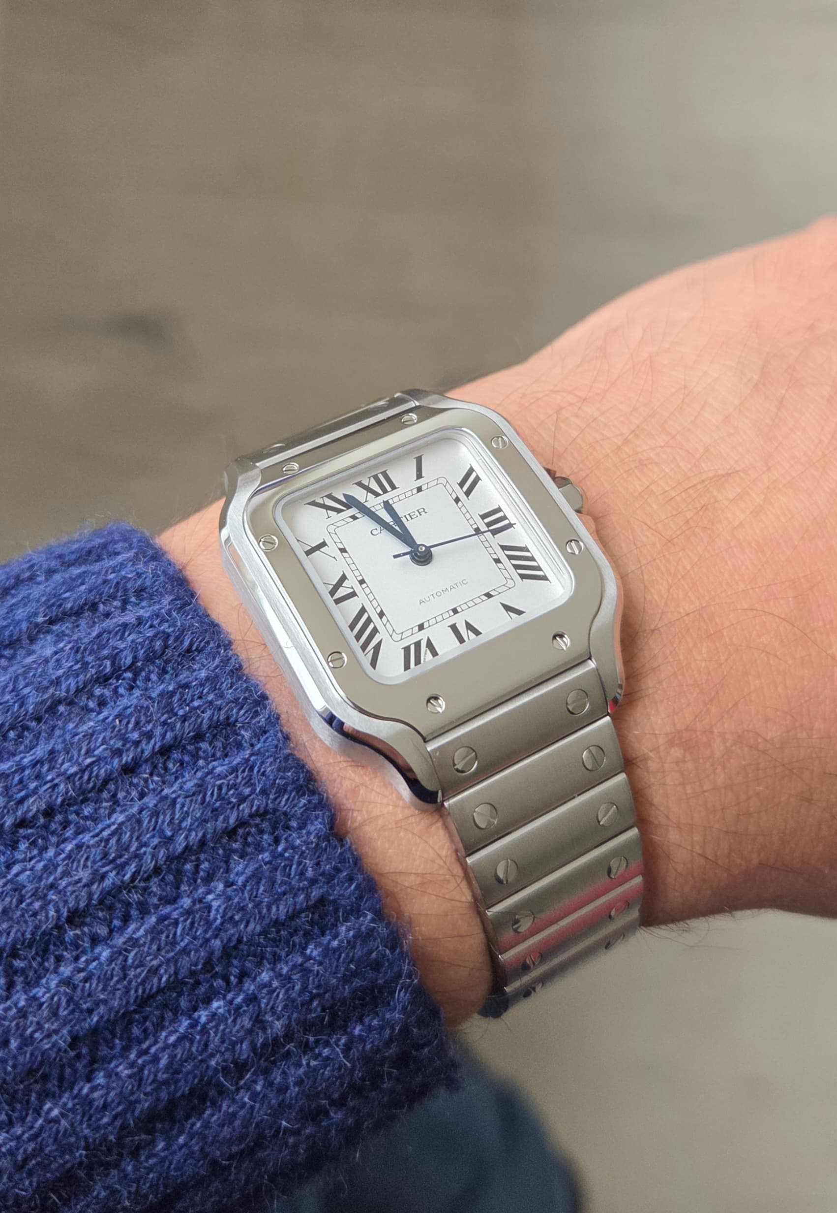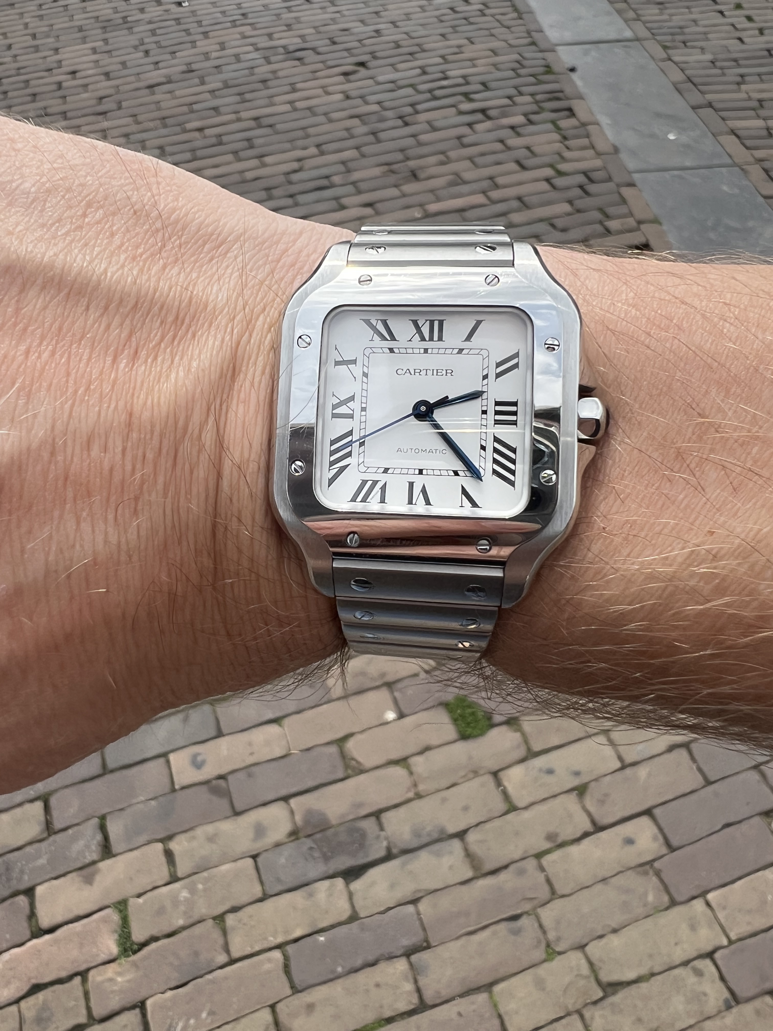 De Santos 100 staat altijd wel vrij groot. Aanzienlijk dikker dan de huidige Santos, een beetje alsof je een vierkant blok op je pols hebt.