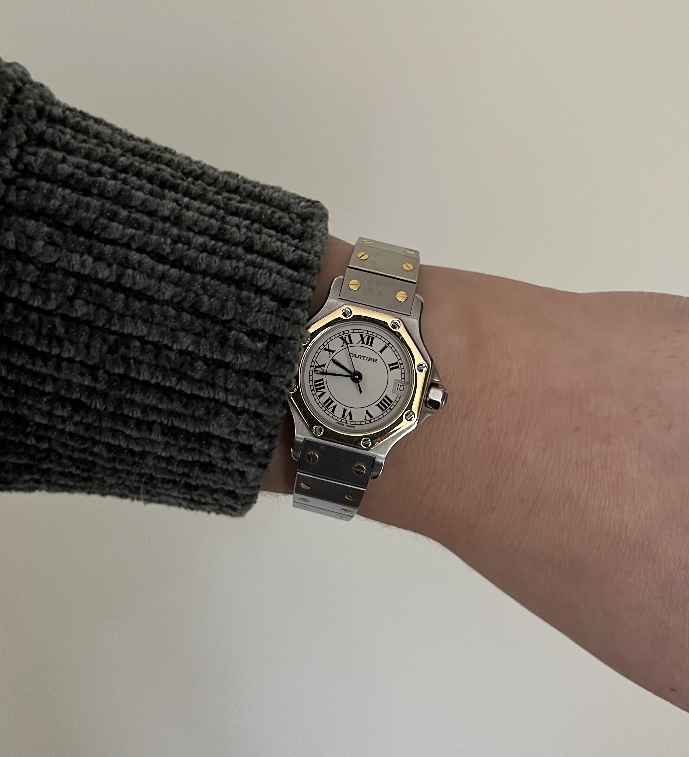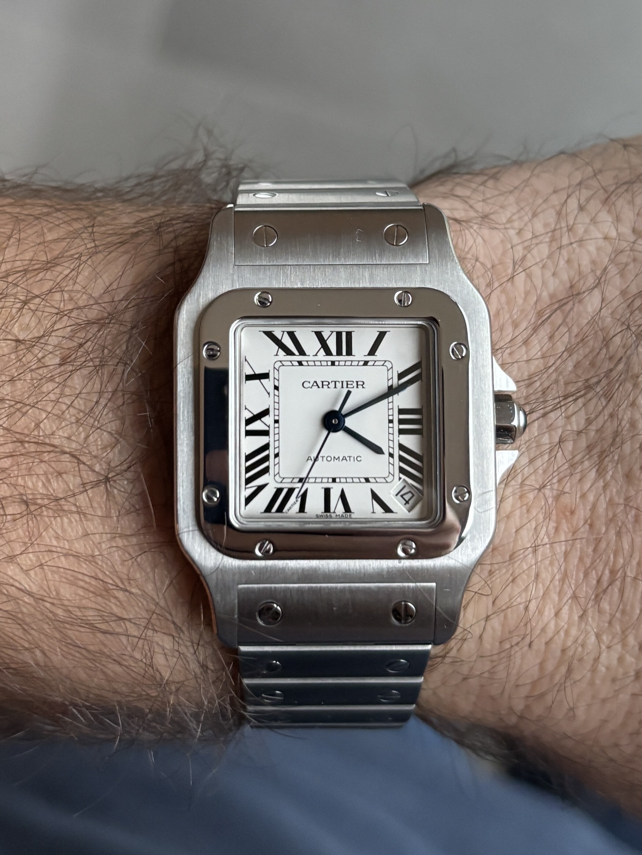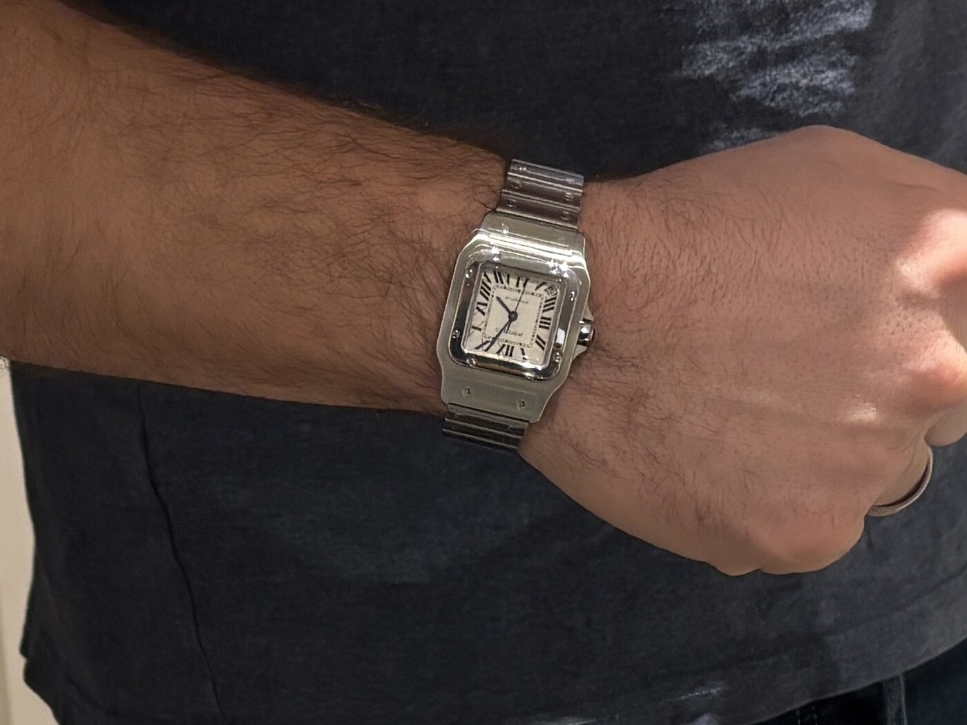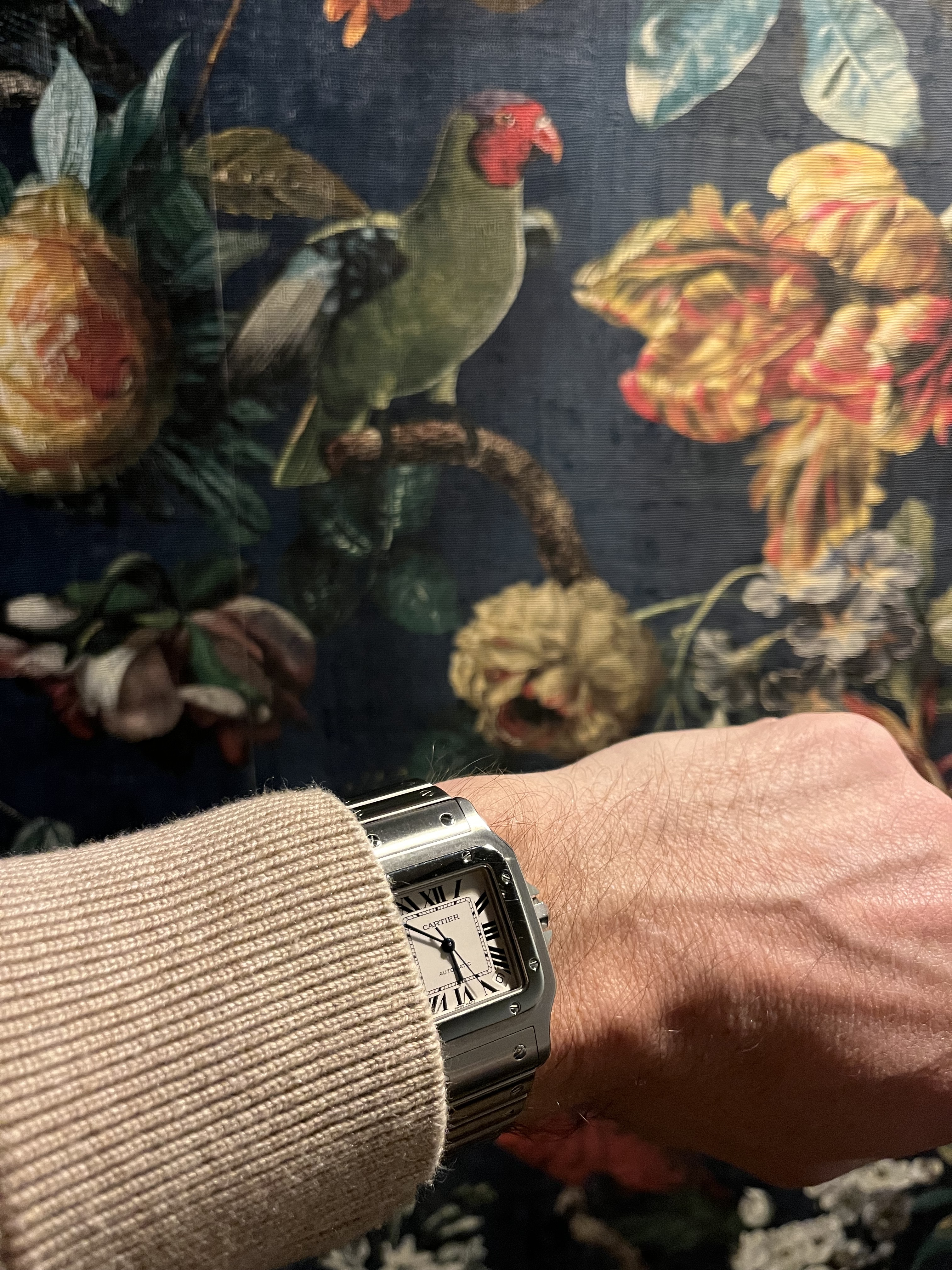 Hier een ingezoomde foto van mijn 17,5cm pols met de Santos in de spiegel.