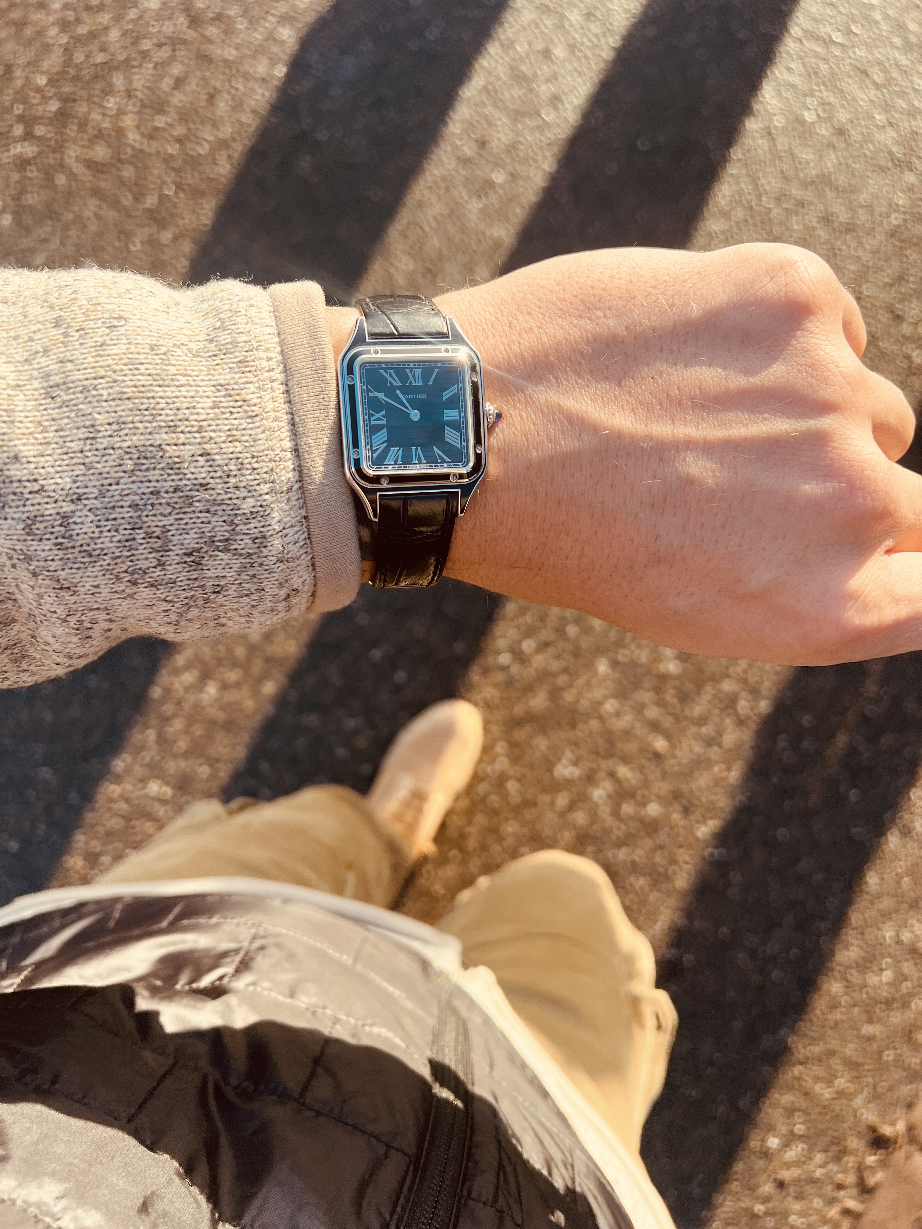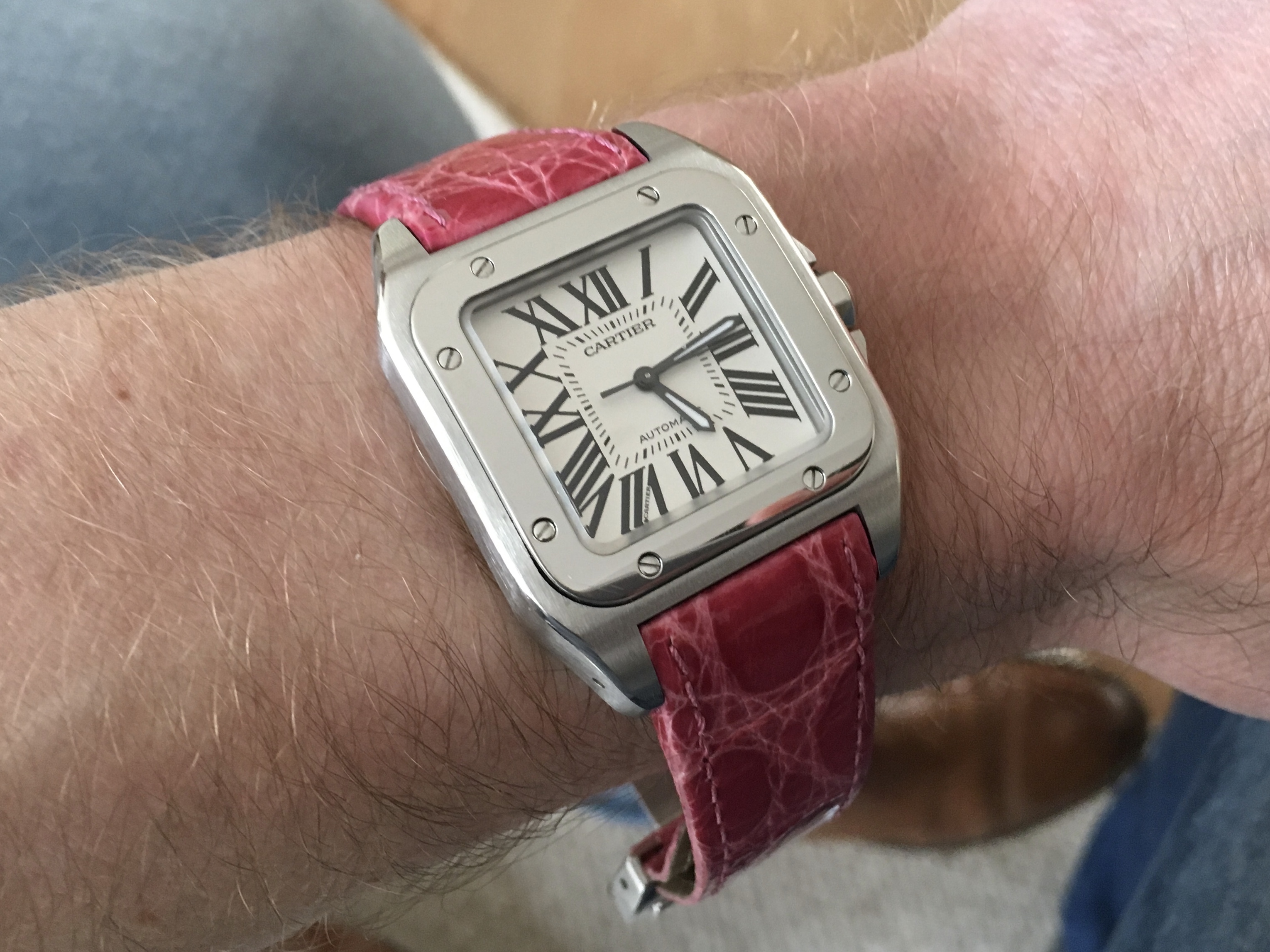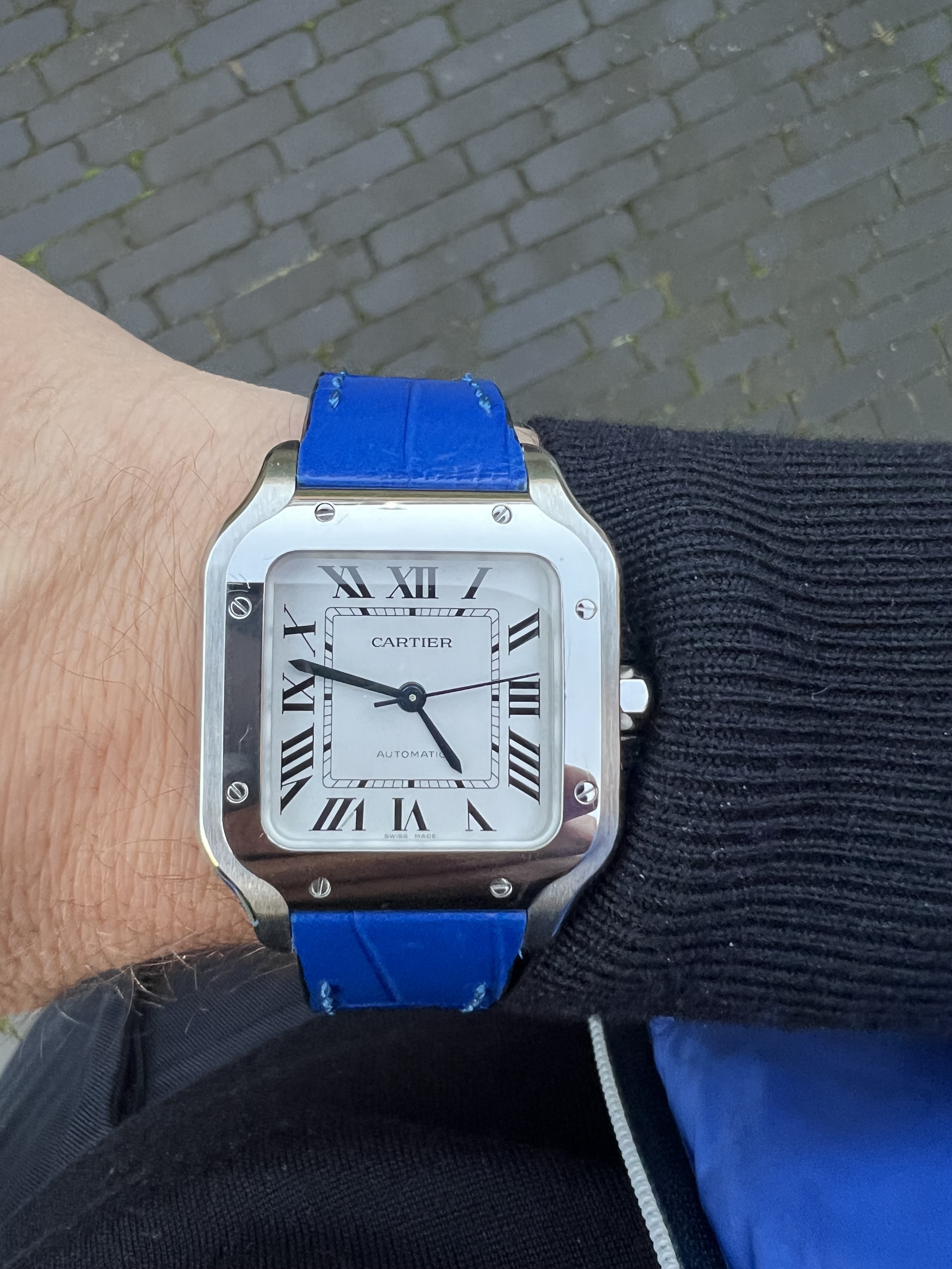 Ik vond de Santos toen te klein en heb deze niet gekocht. Jaaaaren later ben ik alsnog tot inkeer gekomen en heb ik een Santos (maat M) met bruine wijzerplaat gekocht.