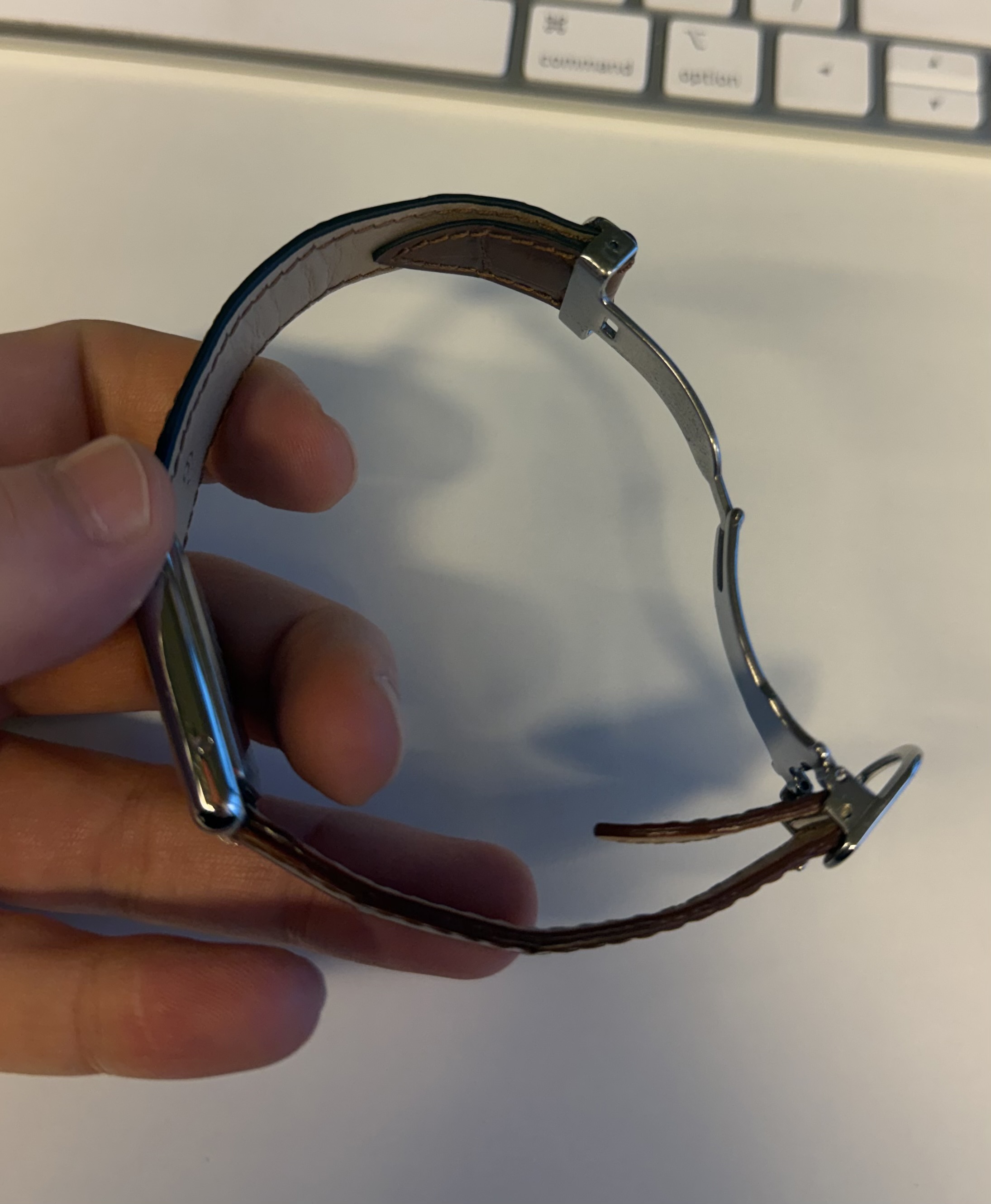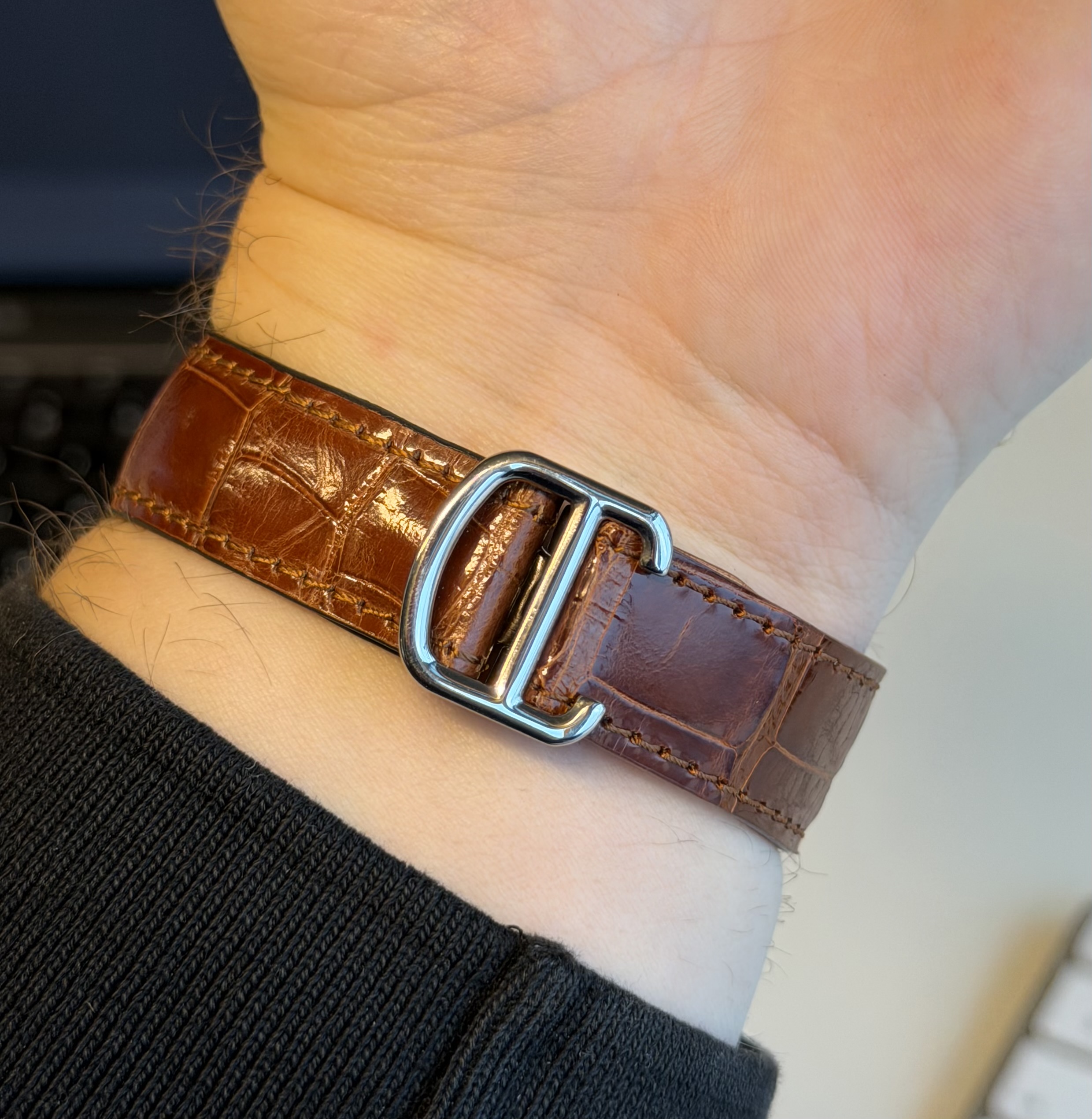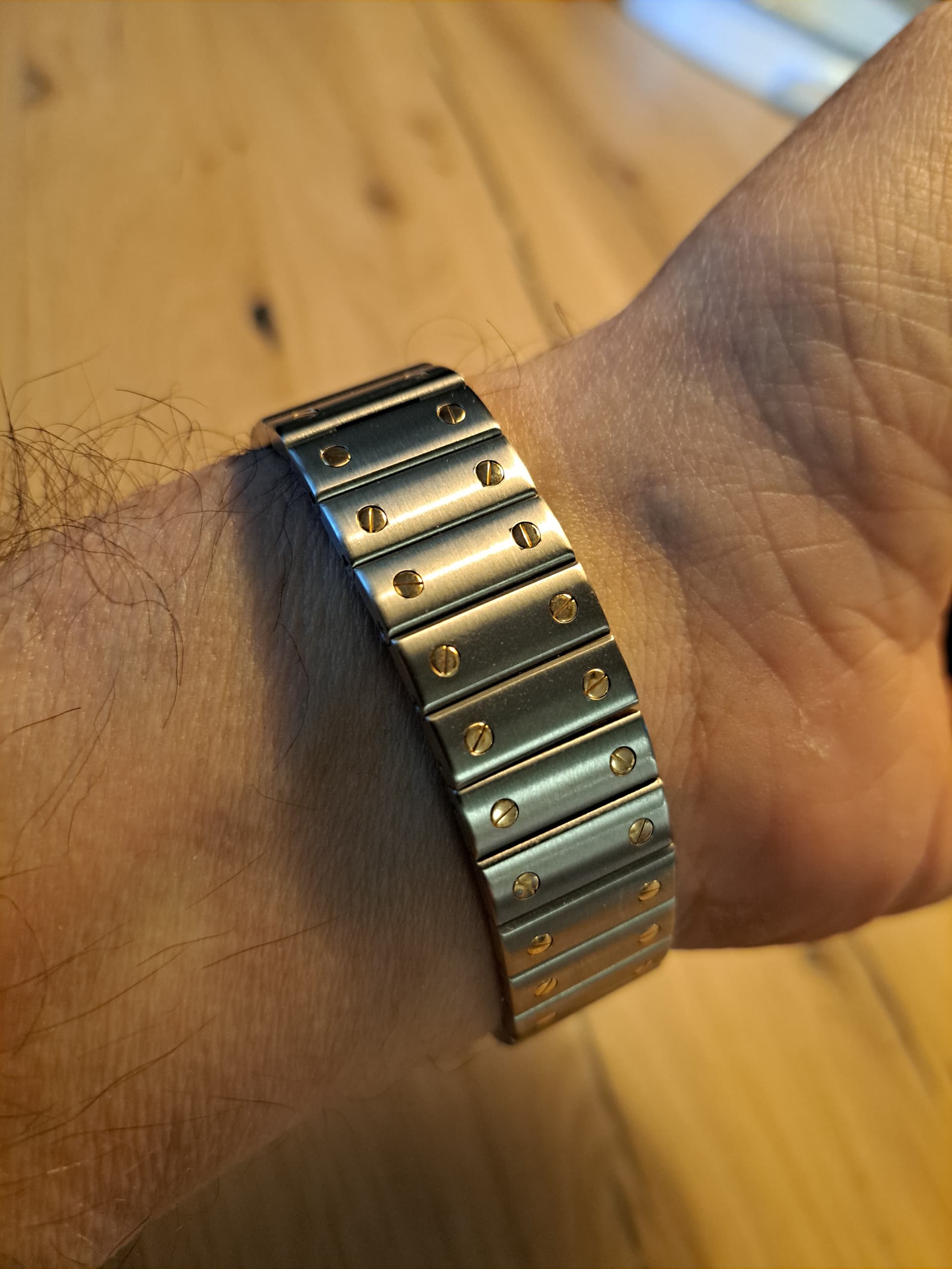 In de zoektocht naar een nieuwe sluiting even een tijdelijke Cartier sluiting erop met er combinatie van 2 verschillende banden erop die toevallig op elkaar lijken. Zal eens bij Cartier langs gaan met deze als voorbeeld om te kijken wat de opties zijn. Zoek er wel een waar de band maar aan 1 kant dubbelvouwt, dus gaan zien of ze die kunnen regelen.