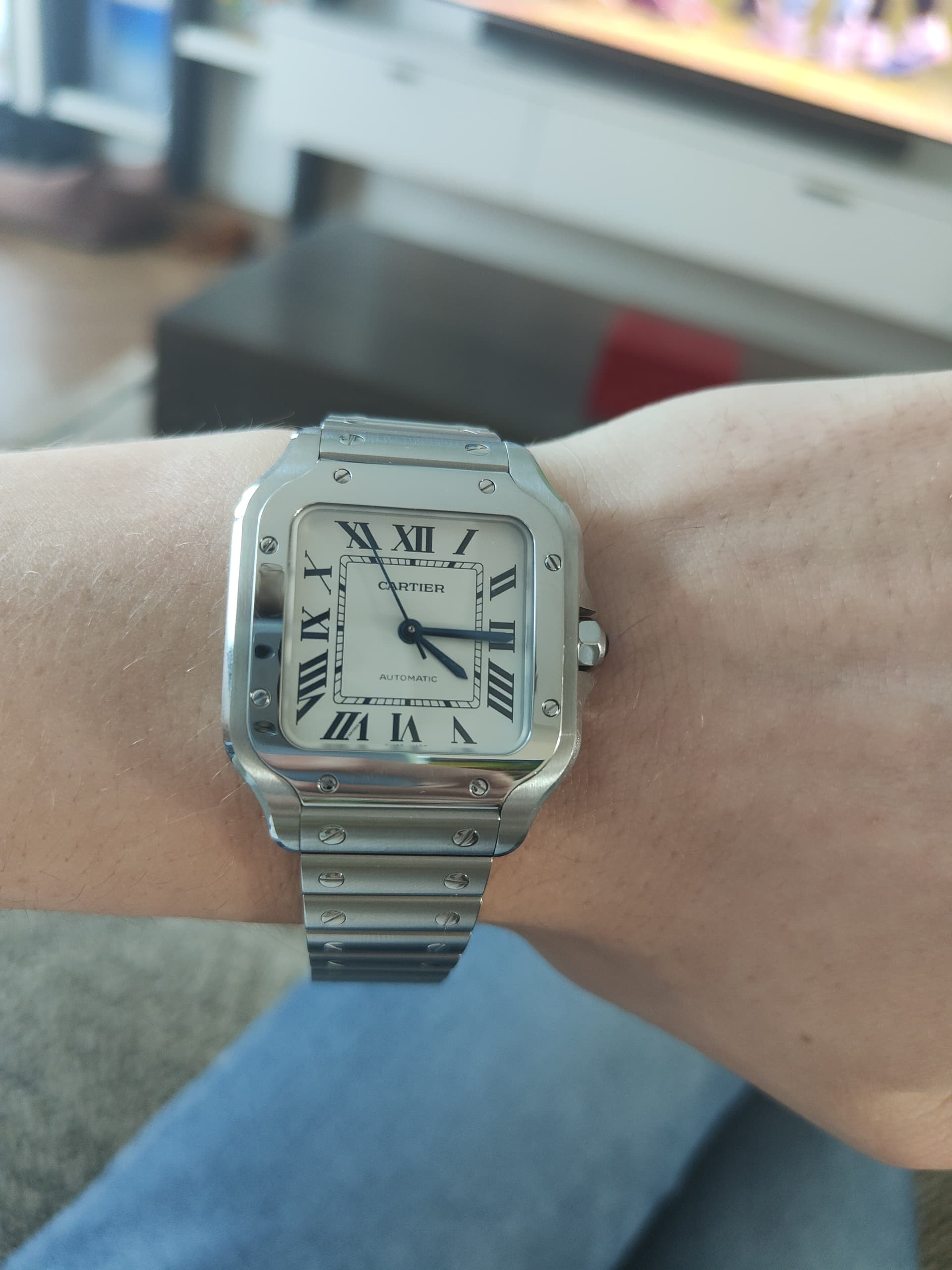 Santos 100 is echt dikkertje. Bijna niet vergelijkbaar met de Dumont daardoor. Qua breedte zijn ze misschien gelijk op papier, maar de Santos 100 draagt veel groter en meer aanwezig