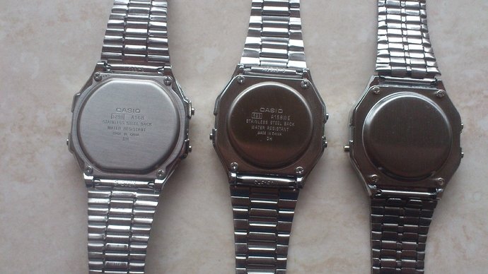 Ook heb ik nog een Chinese hommage gekocht (zie: NA: horloge voor de prijs van een saucijzenbroodje). De afwerking hiervan is uiteraard beduidend minder (scherpe randen aan de band en de knopjes zijn een stuk minder prettig in gebruik), de functionaliteit is verder hetzelfde en het lampje werkt even goed/slecht als de Casio A158. Wel liep deze na een week 75 seconden achter, dus ook het uurwerk is minder nauwkeurig. Horloge is goed bestand tegen schokken en ook tegen vochtige ruimtes (bijvoorbeeld als klokje voor in de douche ;)). Er zit echter geen rubberen ring ter afdichting in het horloge, dus denk dat het minder goed tegen water kan dan de Casio’s. Voor de prijs al met al best indrukwekkend, maar uiteraard inferieur aan de Casio’s.