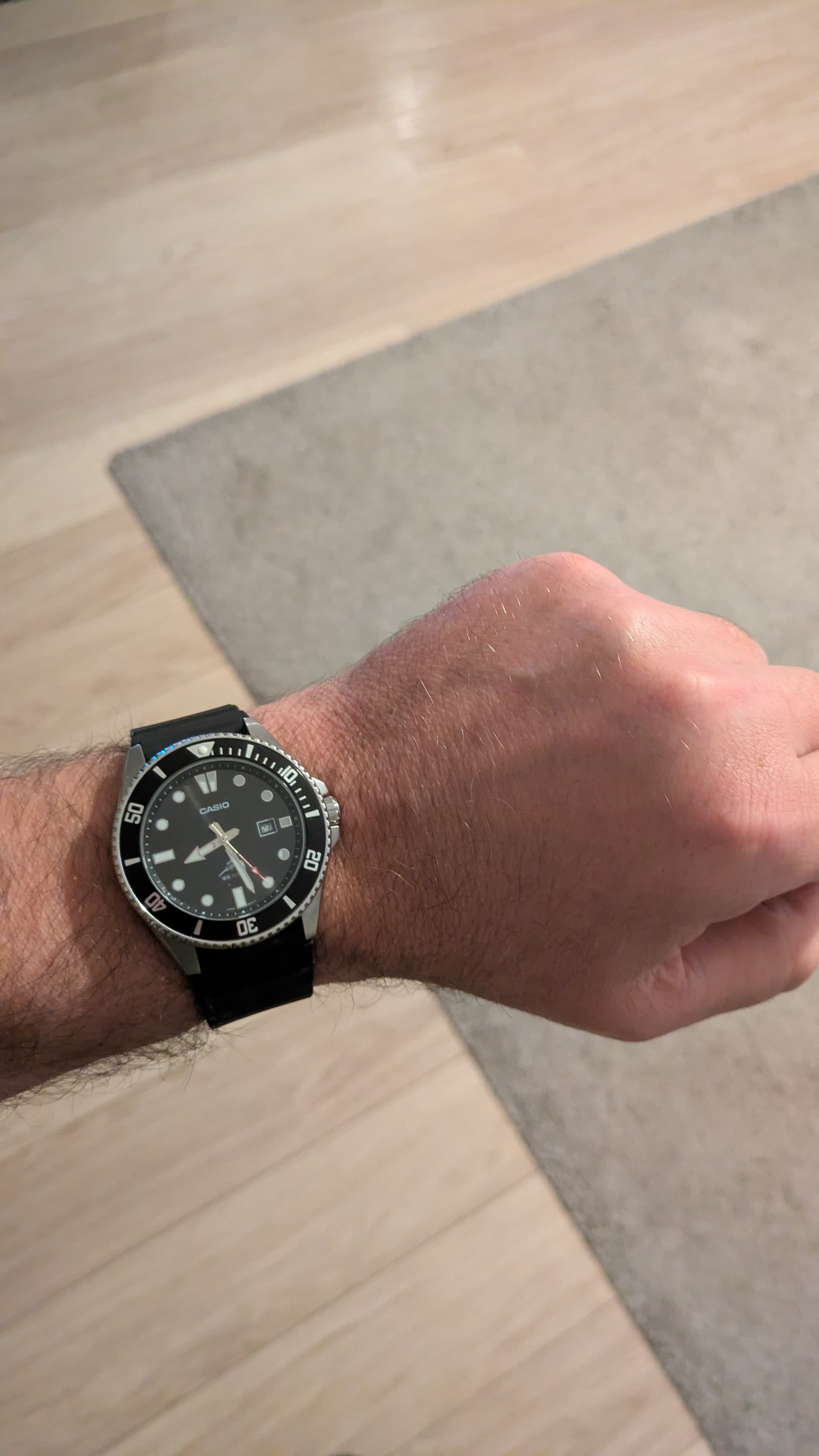 Je kan 'm prima hebben qua maat. Ik draag 'm op mijn 17,5 cm pols en door de relatief korte lugs die ook nog eens redelijk gebogen zijn past dat prima. Ik heb geen saffier, ben niet zo’n ruw type, nog steeds geen krassen. Een stalen band doet wonderen, geeft 'm nog meer uitstraling.