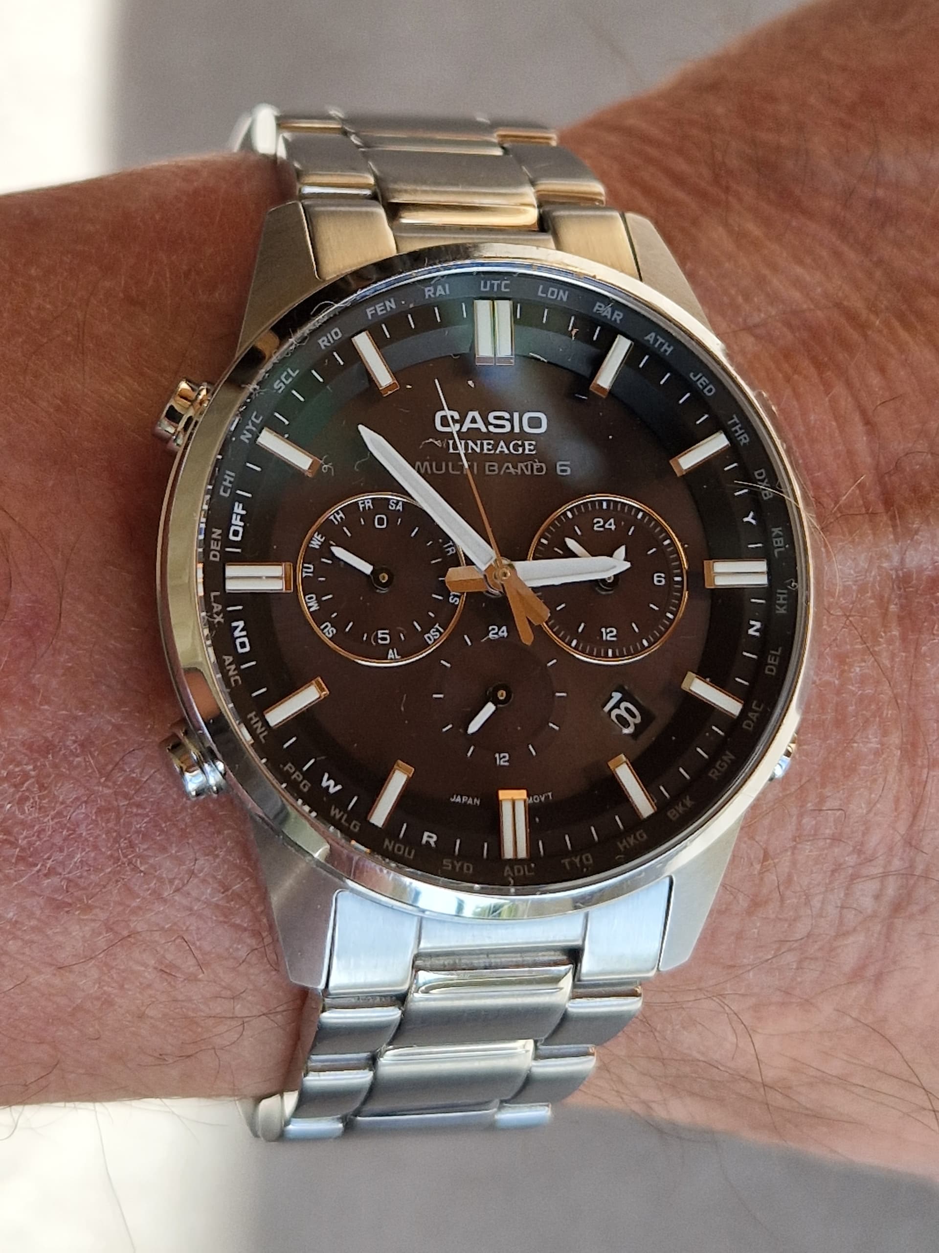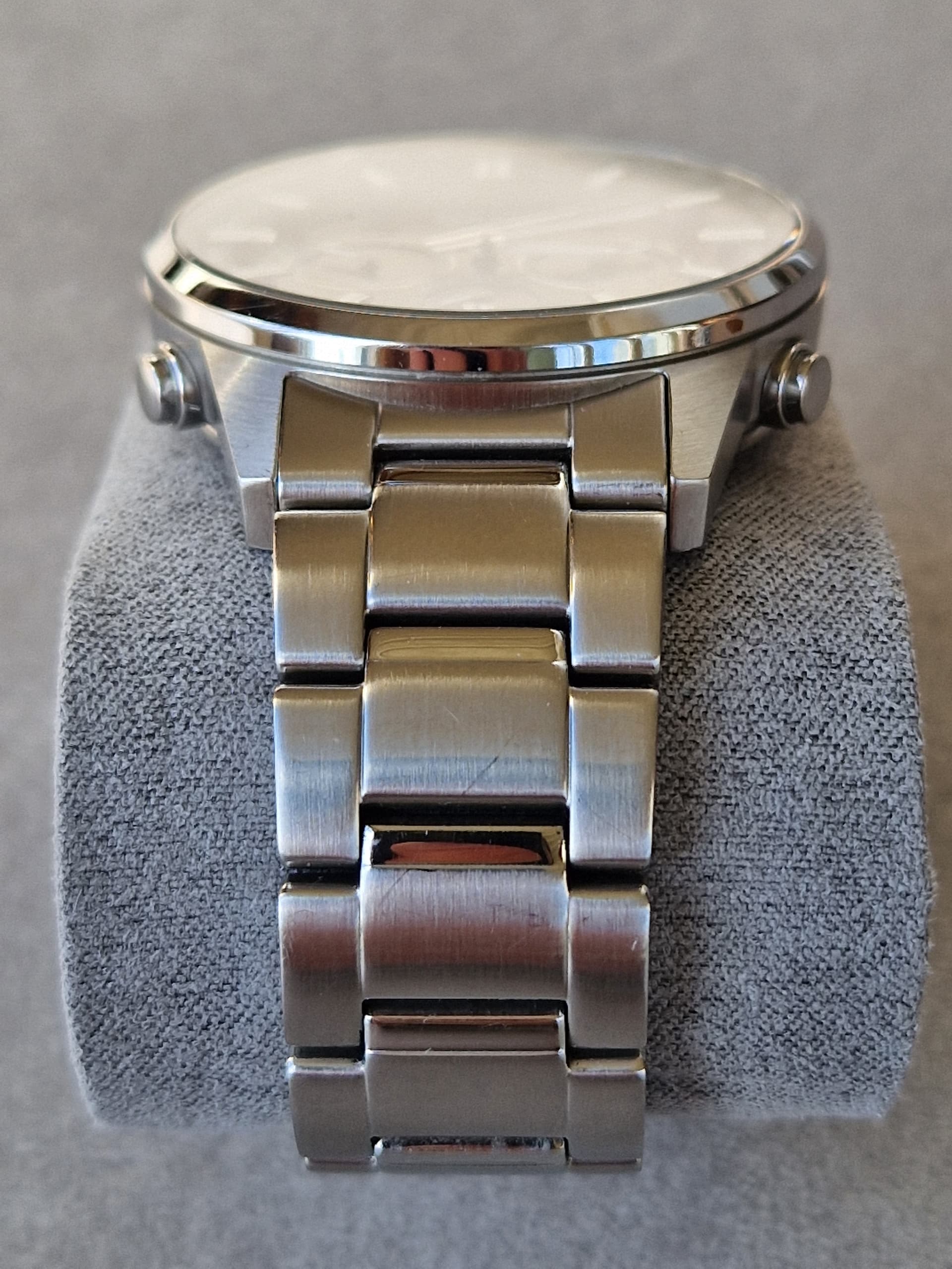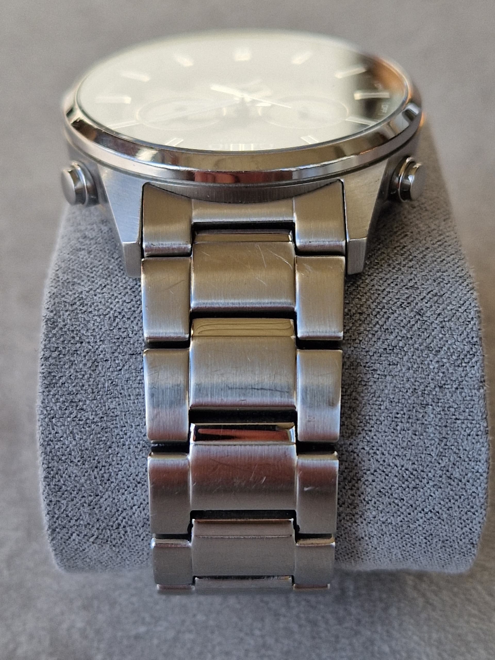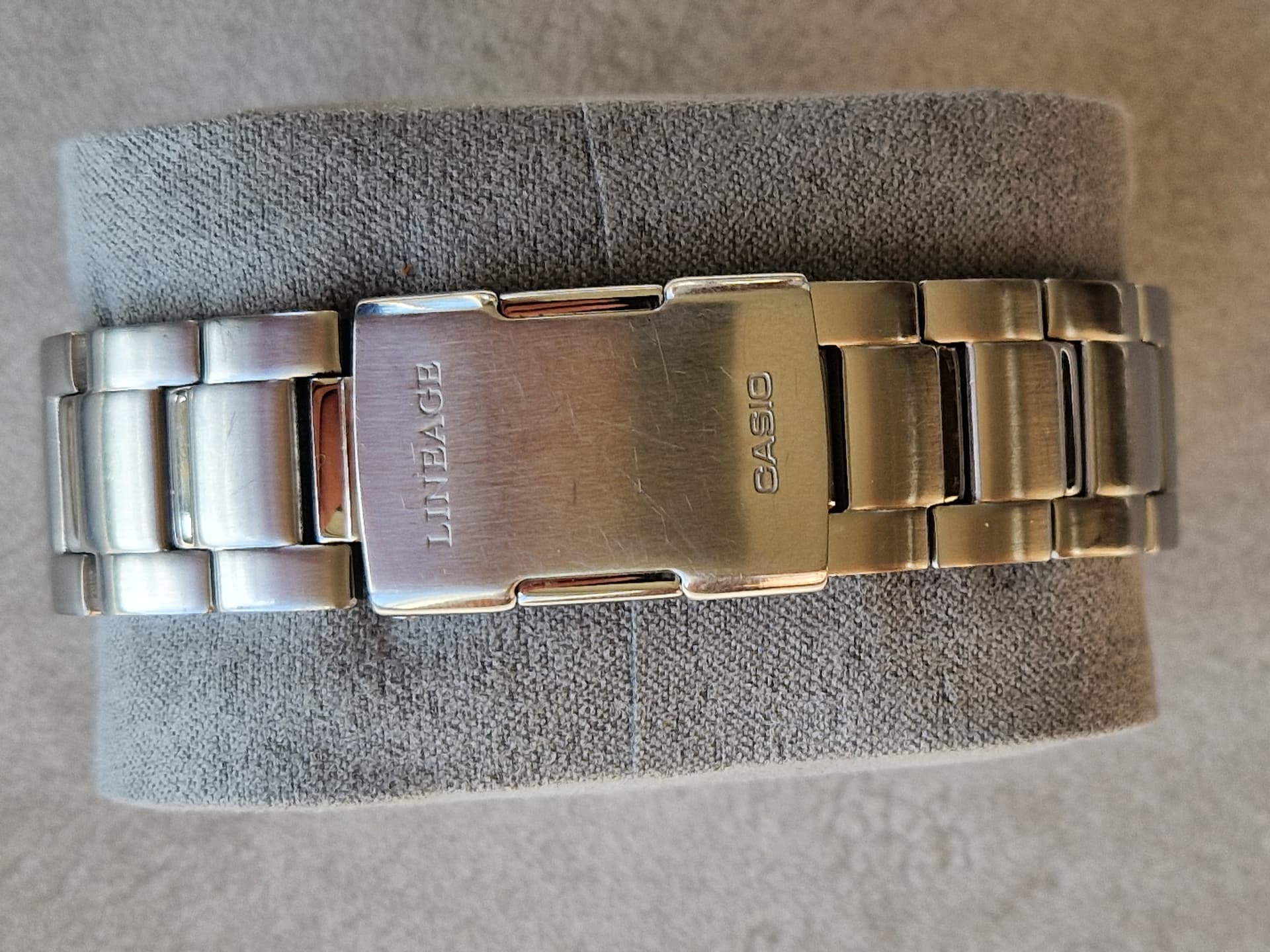 Conditie (krassen, werking etc): werking 100%, lichte krasjes, met name op de band/clasp, bracelet met pin & bush systeem waarvan enkele busjes ontbreken. Horloge staat nu op 17,5 cm polsomtrek. Bij een grotere polsomtrek is dat op te lossen met klempinnetjes (ik gebruikte er eentje om de band op 17,5 te krijgen).