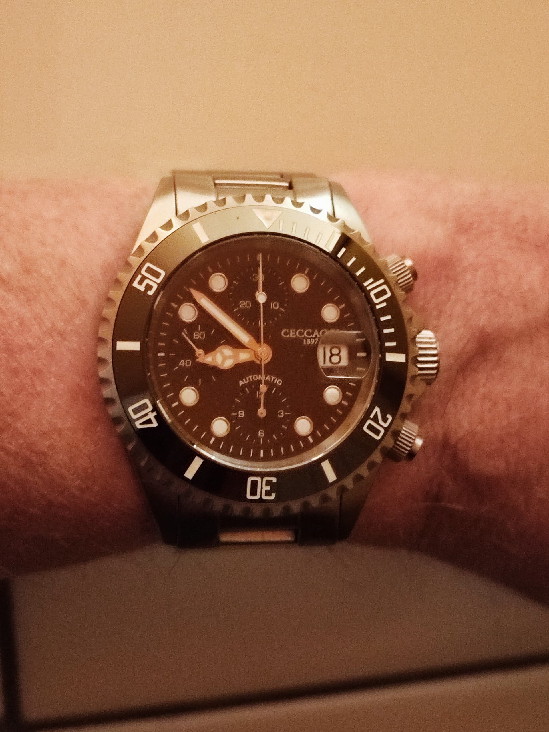 Het merk bestaat van 1897, opgericht door Geovanni Ceccucci. Een Italiaanse zakenman uit die periode toen men nog een sigaret opstak bij het vullen van kerosine aan een F1 wagen, dat kon toen nog. Ik denk zelfs dat dit stamt uit de tijd daarvoor! Hij begon met zakhorloges, later klokjes en nog later horloges. Zijn ontwerpen ontwikkelde hij uit Italië maar de werken kochten ze aan in Zwitserland. Nu nog steeds, daarom dat ik hem kocht. Een Italiaan met een Zwitser onder de motorkap. (Valjoux 7750). Het jammere is dat ik nergens een referentie nummer of serienummer of modelnummer kan terug vinden, ik weet enkel van de zaakvoerder dat er van deze slechts 27 gemaakt zijn. Ik kocht deze voor zijn uitstraling, schroefkroon en knoppen en loopt haar juist. Momenteel bestaat dit merk nog steeds en concentreren ze zich vooral op polshorloges. In heel wat modellen zie je andere topmerken terug komen zoals IWC, Tudor, Rolex… anderzijds geen peperdure horloges. Deze kost 1950€ maar je krijgt wel een mooie korting zoals heel wat merken doen… Kortom, ik ben er blij mee. ![]()