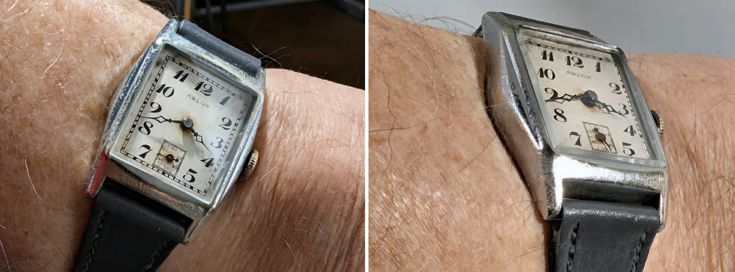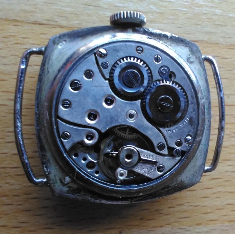 Het ding was behoorlijk verwaarloosd, het celluloid glaasje was erg vergeeld en niet meer te redden, maar inmiddels heb ik wat ervaring met het op maat maken van rechthoekige glaasjes, dus dat kwam in orde. De rest van het horloge was nog heel en het uurwerkje liep, na enige ‘doping’ met een paar druppels wasbenzine. Daar moet dus nog een keer een servicebeurtje overheen, maar er liggen inmiddels zó veel horloges, die niet stuk, maar wel vuil zijn, dat deze nog even in de wachtrij mag voor een logeerbeurtje bij Bas.