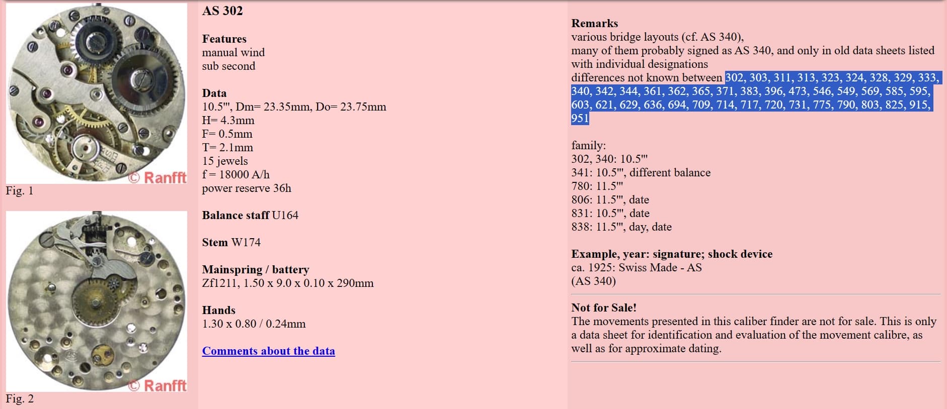 Van de AS 302 bestaan er dan - volgens Ranfft - ook nog eens zo’n 40 varianten met kleine verschillen, dus welke het dan precies is… wie het weet mag het zeggen. Het verklaart wel waarom Google Lens me een behoorlijk groot aantal plaatjes laat zien van uurwerkjes die er erg op lijken.