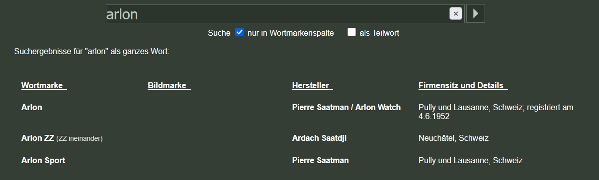 Wat de heren Saatman en Saatdji met het merk hebben uitgespookt vóór ze het in 1952 lieten registreren is me dan een raadsel. Mogelijk is er van voor die tijd nog een relatie met een eerdere registratie uit 1932 van Numa Jeannin uit Fleurier, zoals in het hierboven vermelde postje uit Watchforum UK werd gesuggereerd. Verdere info over een relatie tussen Arlon en Numa Jeannin is echter niet te vinden.
