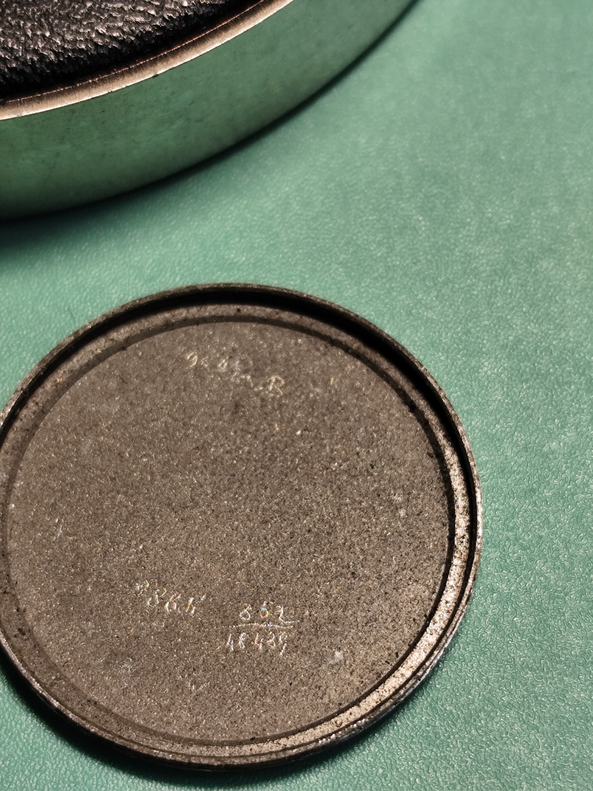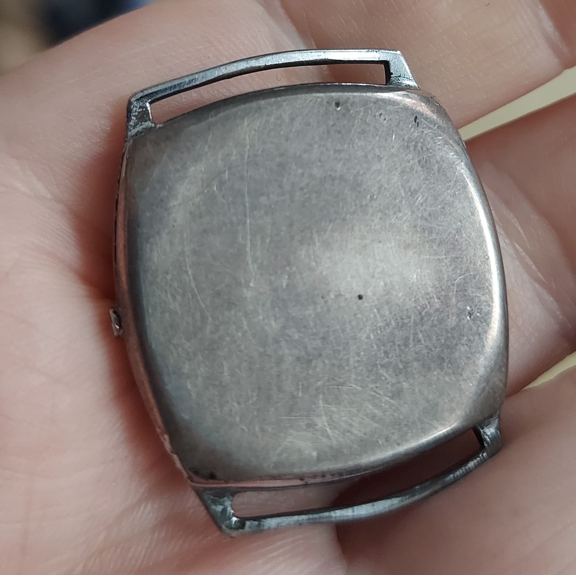 Je ziet aan de voorzijde overigens langs het glas en op de lugs nog de resten chroom zitten, de rest is donker geworden en lijkt me blank zilver. Als dat een onedel basismetaal was geweest was zou dat niet zo mooi glad meer zijn maar ruw en aangevreten.