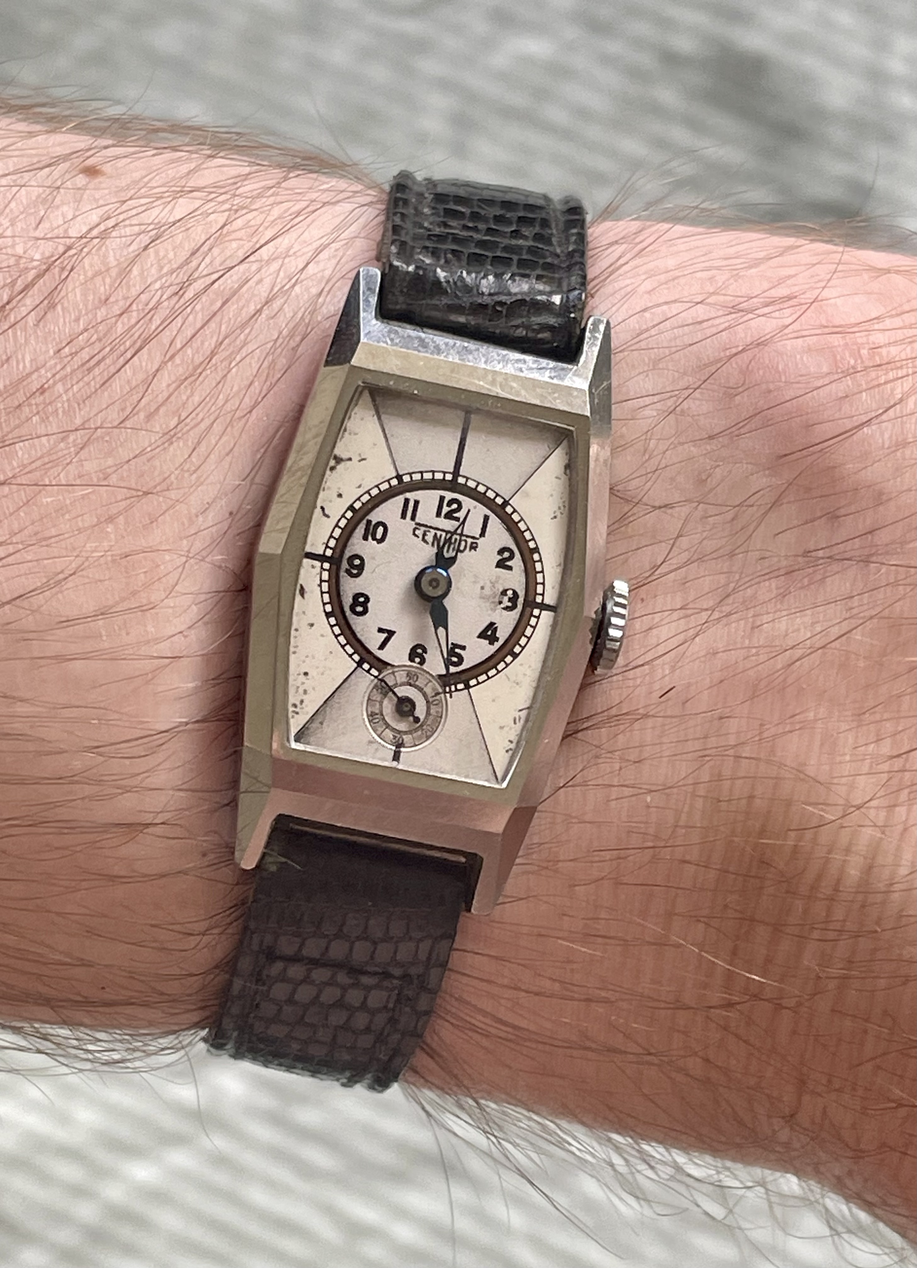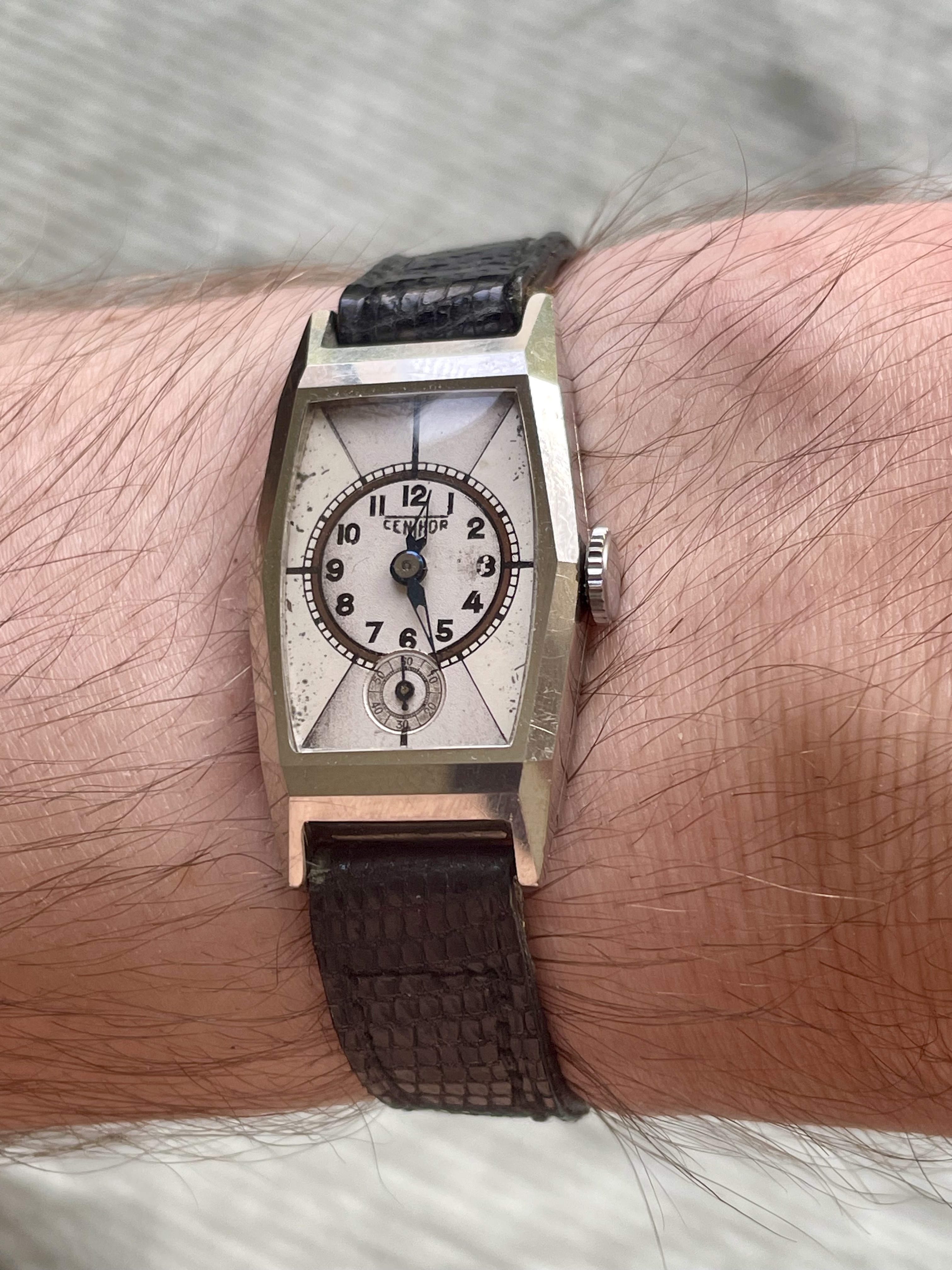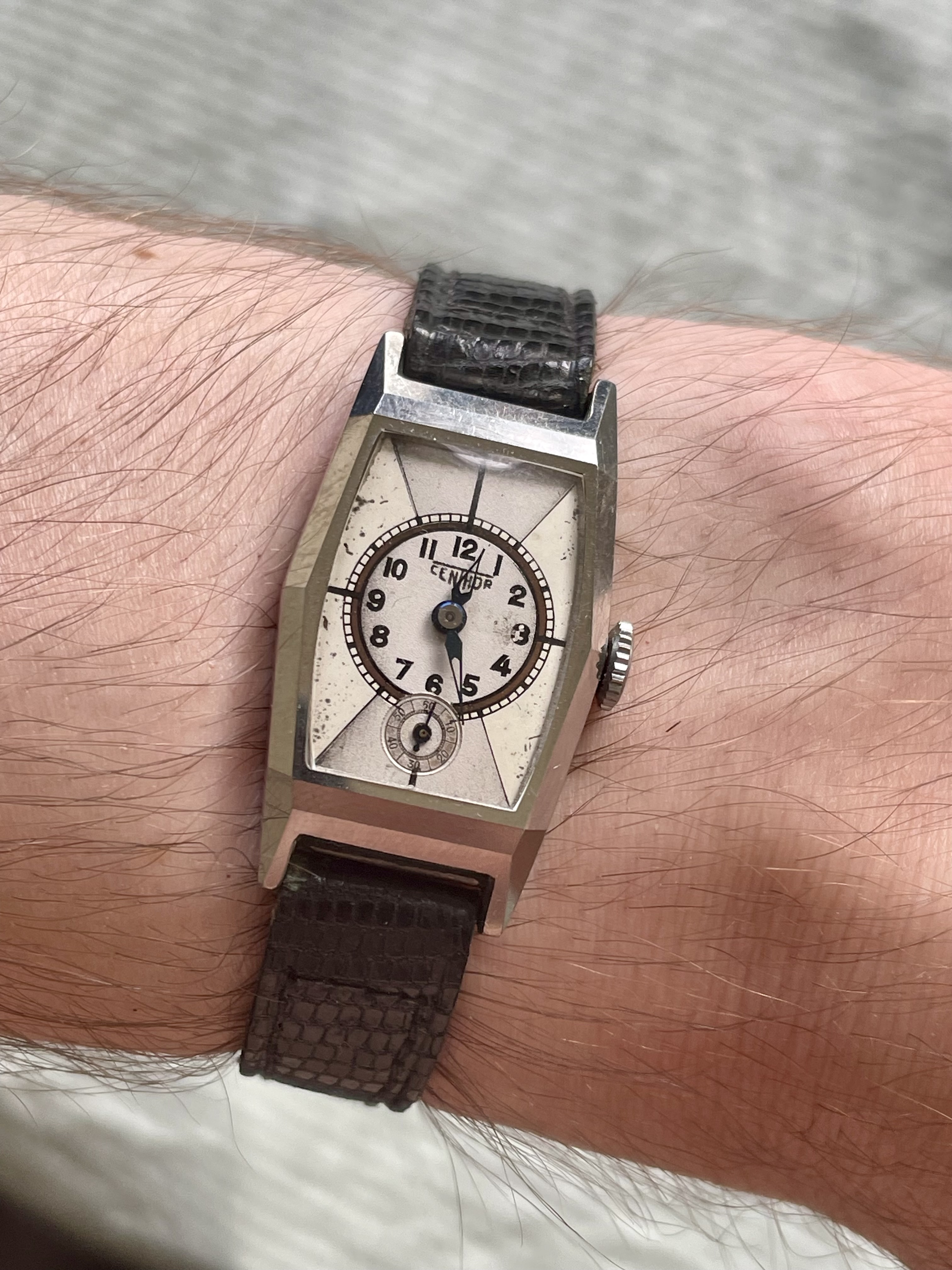 Conditie (krassen, werking etc): hele scherpe kast, zie foto’s. Bandje is zo goed als nieuw. Lichte patina op de wijzerplaat. Uurwerk loopt paar minuutjes per dag voor