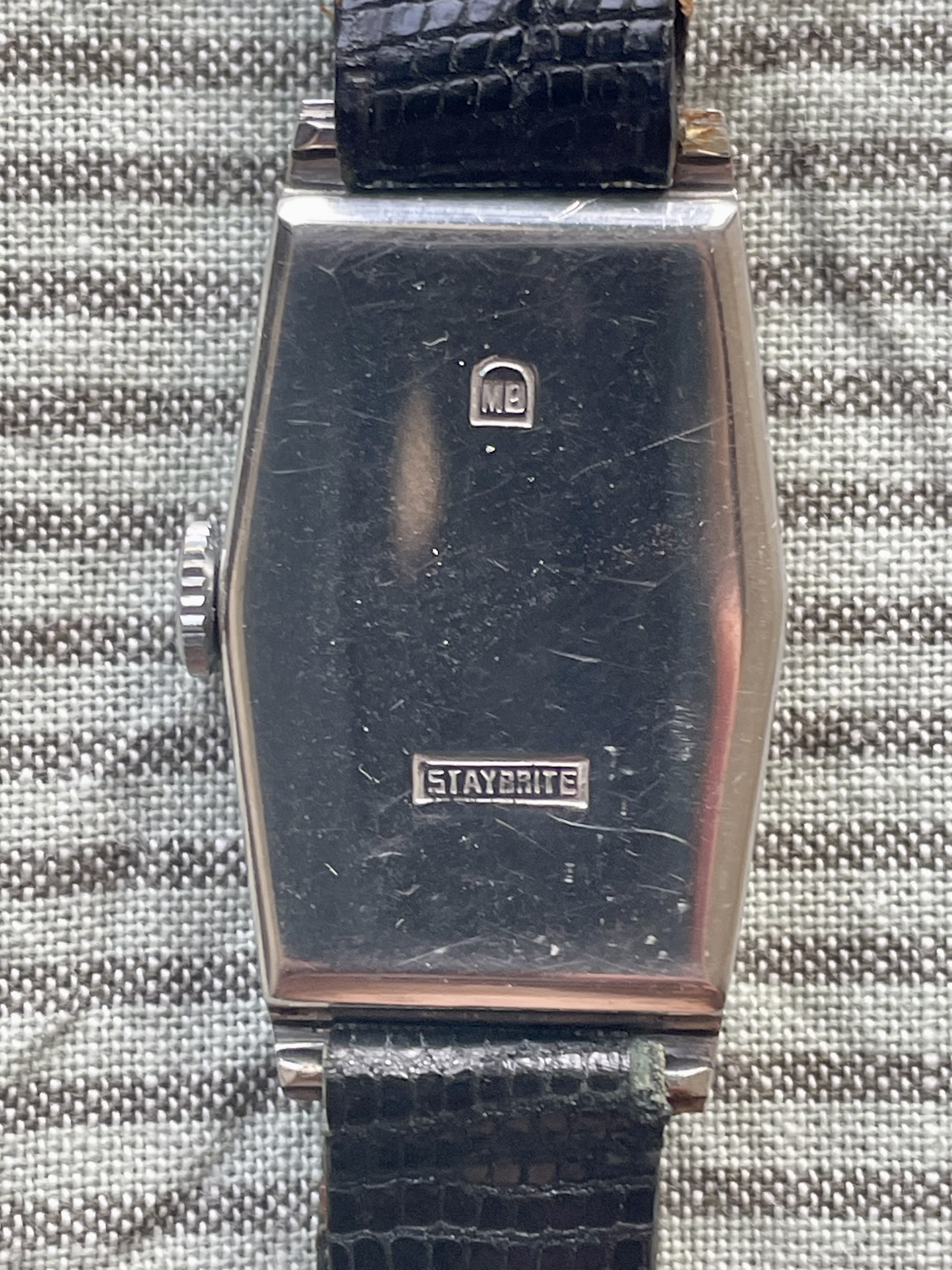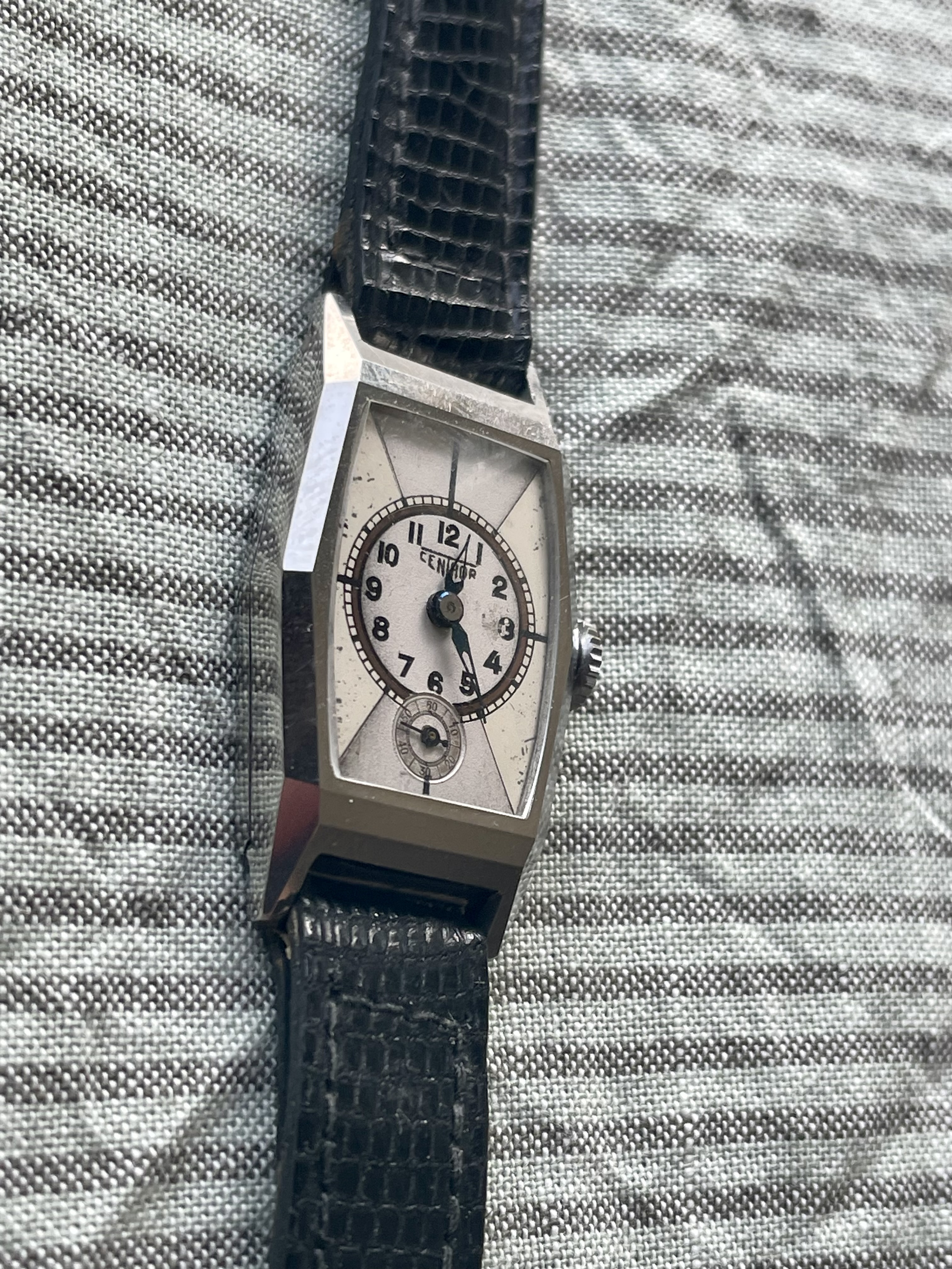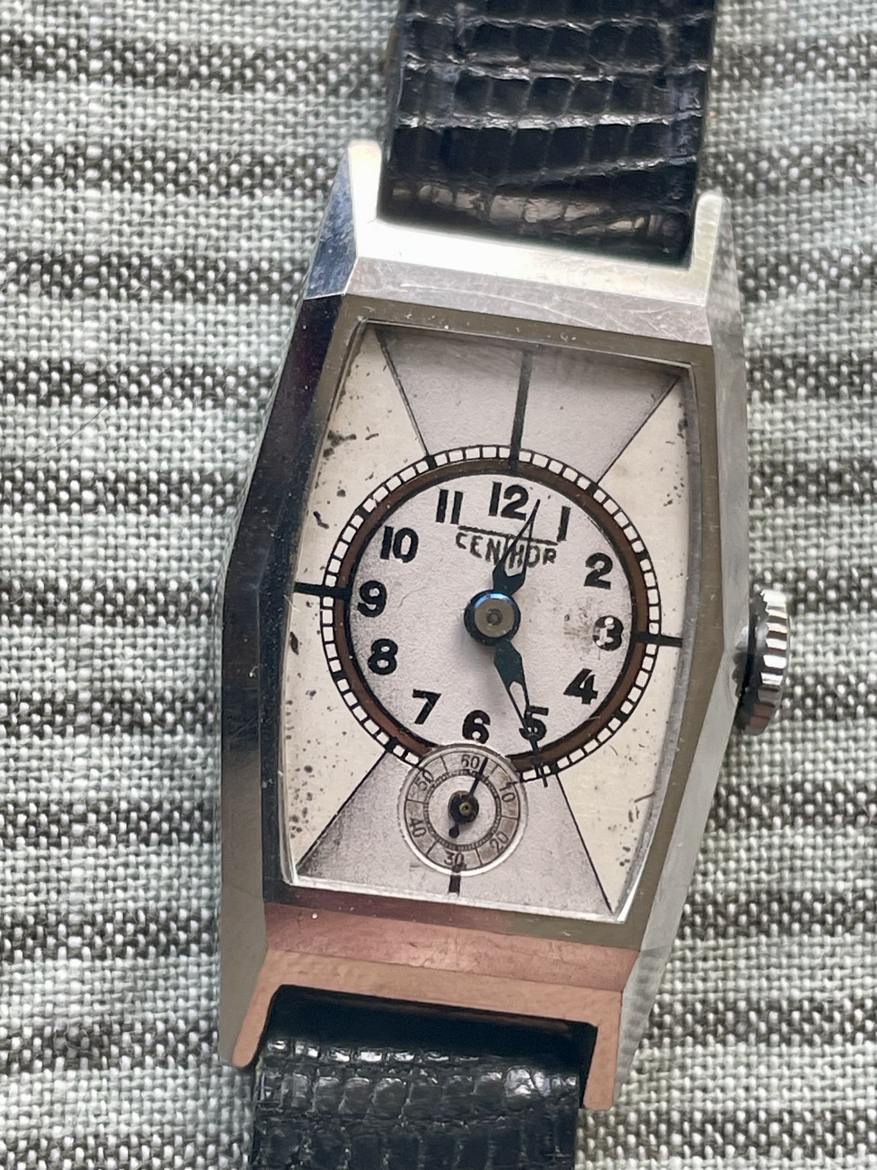 Conditie (krassen, werking etc): hele scherpe kast, zie foto’s. Bandje is zo goed als nieuw. Lichte patina op de wijzerplaat. Uurwerk loopt paar minuutjes per dag voor