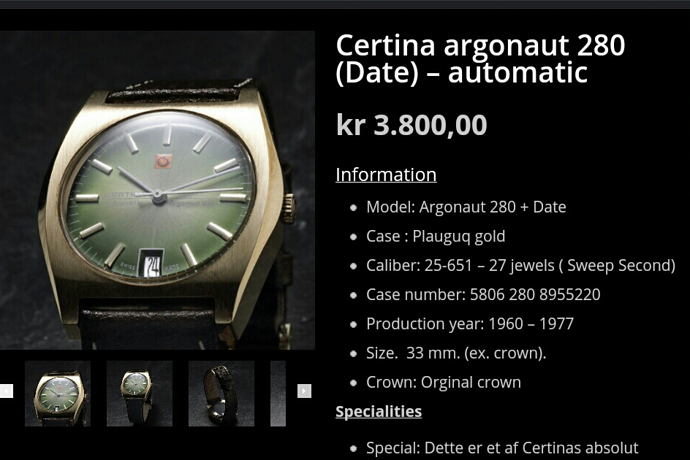 Afgelopen vrijdag mijn Certina Argonaut 280 opgehaald na een service- en opknapbeurt. Het horloge is van mijn grootvader geweest en lag al enige tijd in een doosje op zolder. Na een groeiende interesse in vintage besloten om dit (naar mijn mening) prachtige horloge op laten knappen (service, glasje vervangen, kast gepolijst).