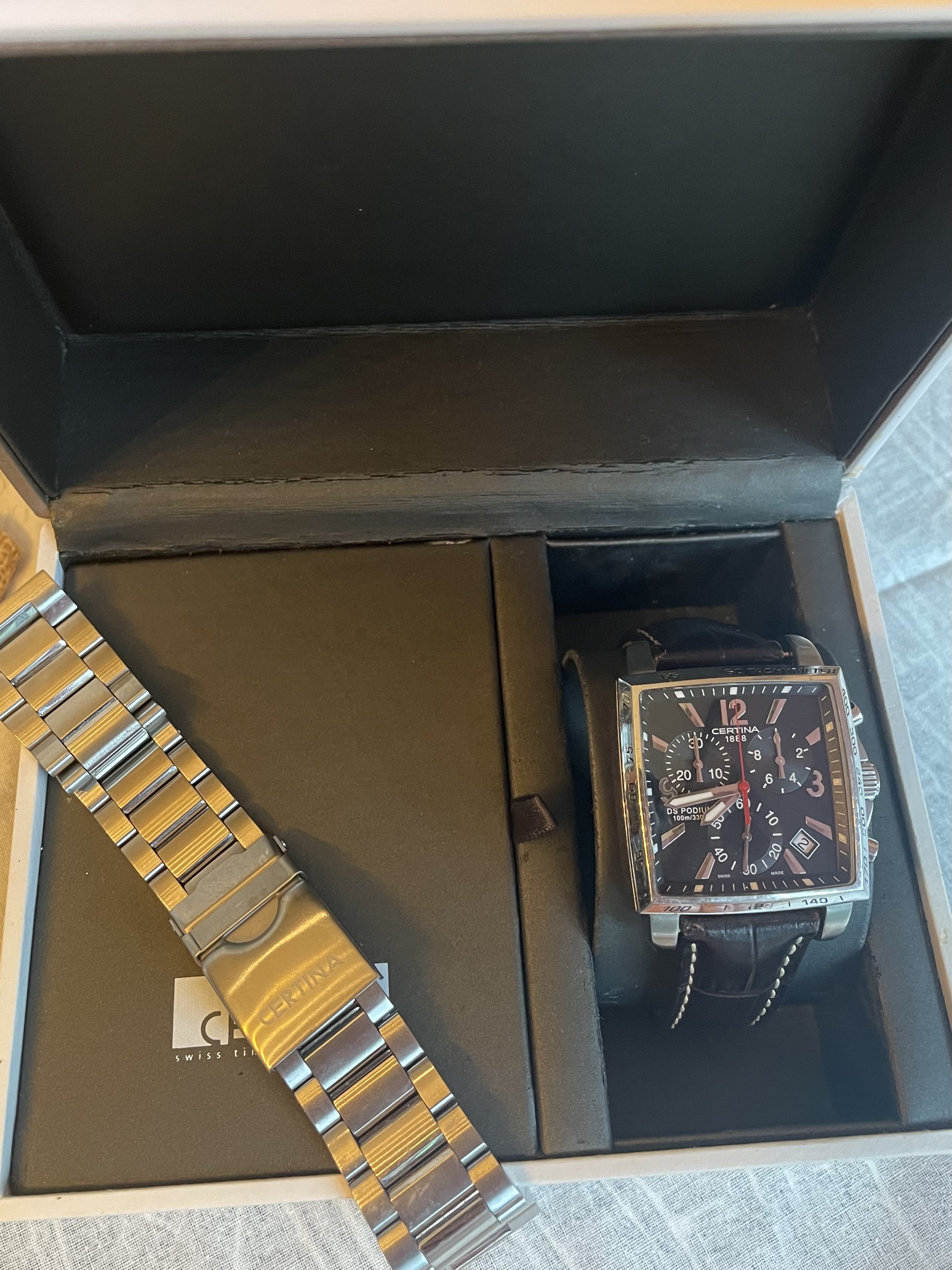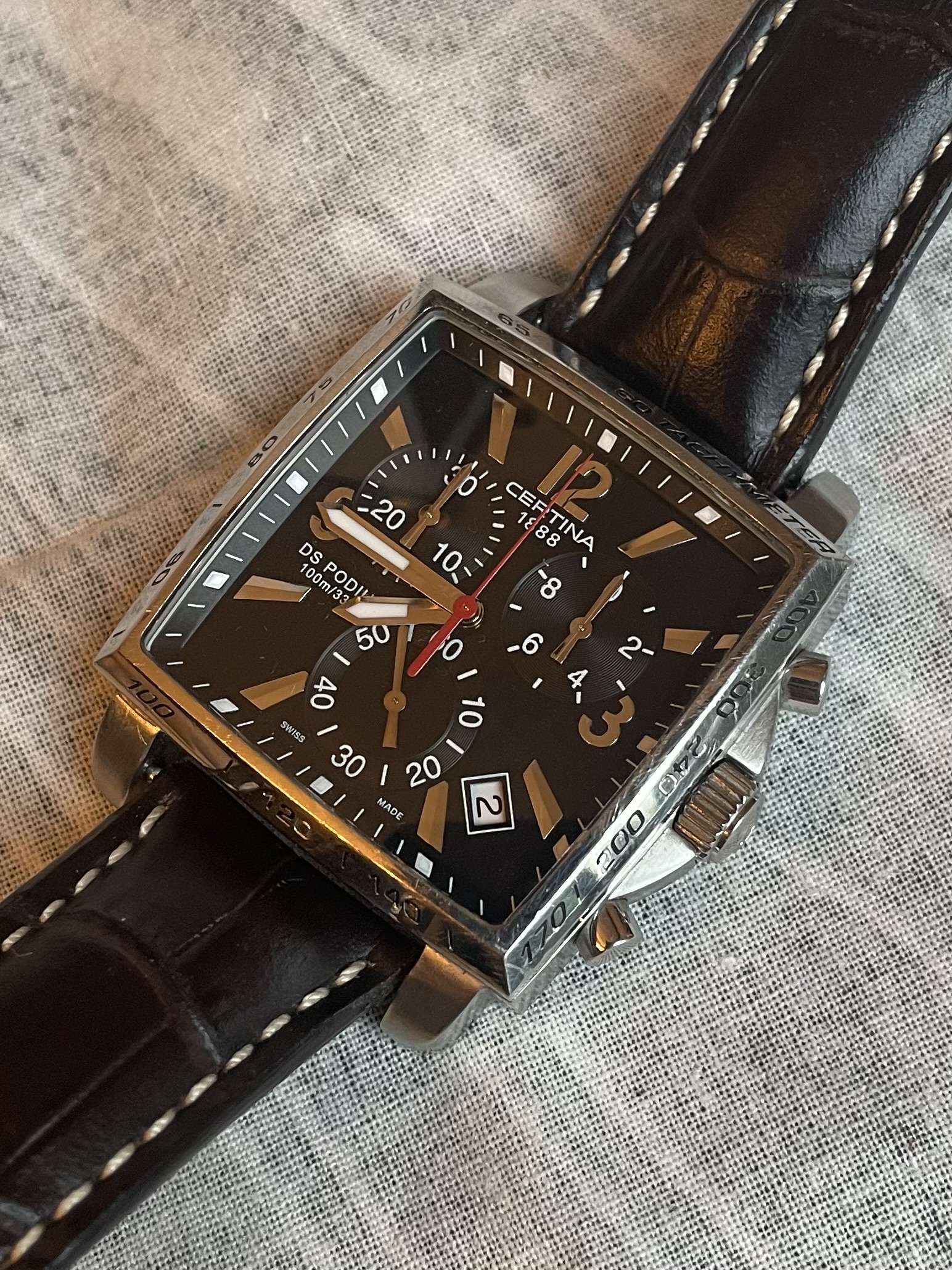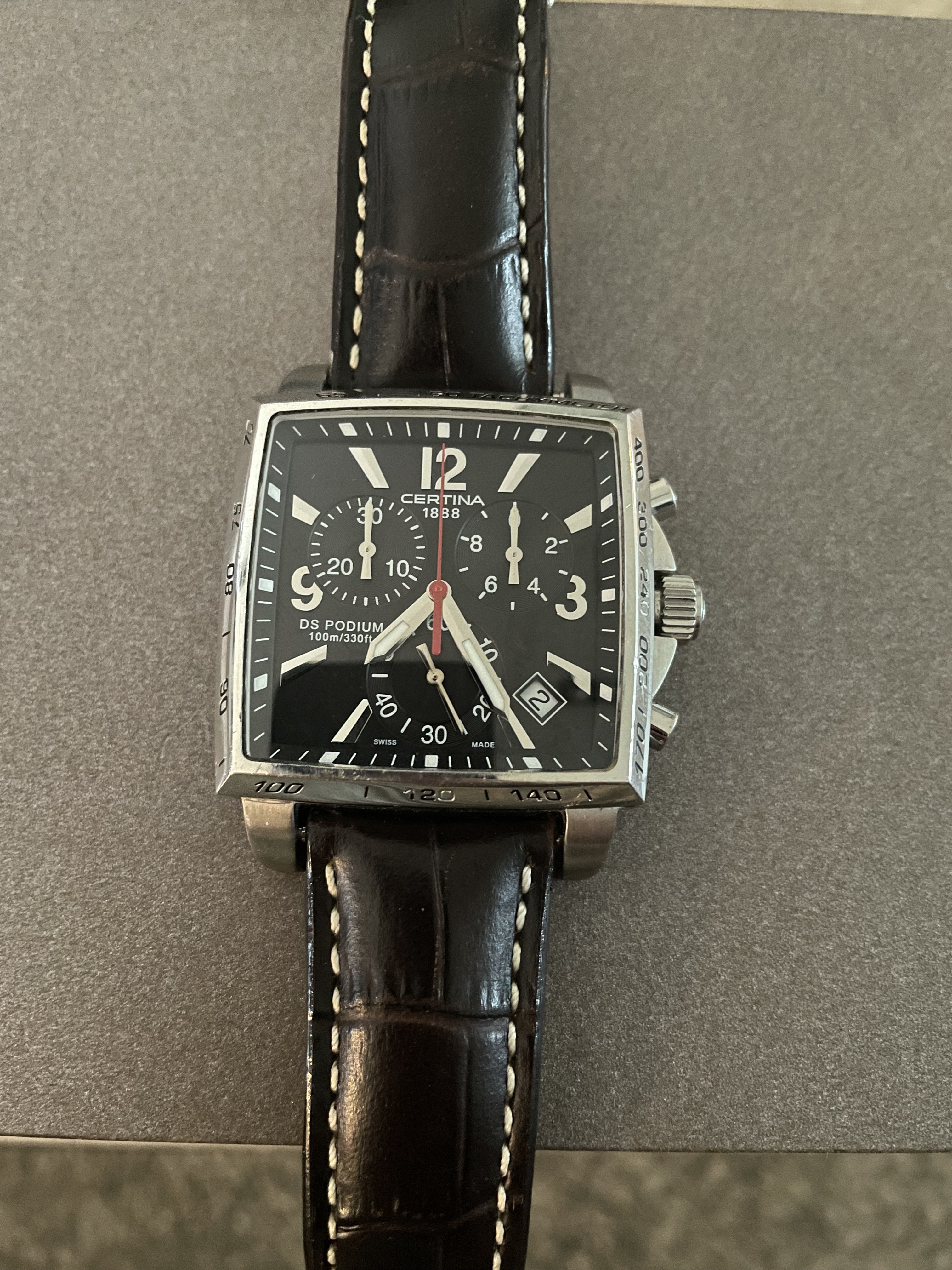 Deze prachtige en tegenwoordig zeldzame Certina DS Podium Square Chronograph quartz mag het nest verlaten wegens te weinig draagtijd. Deze dient ter verkoop.
