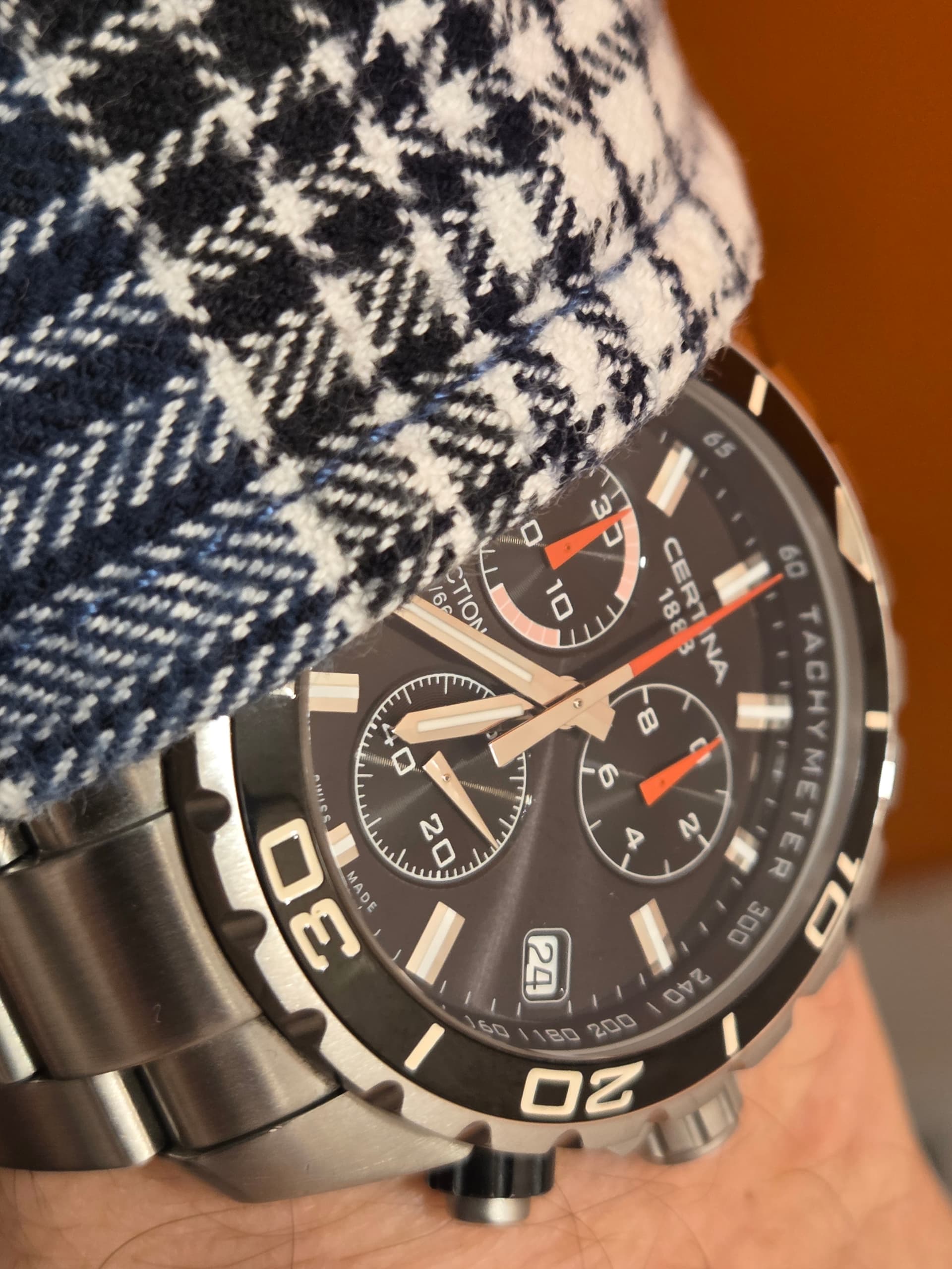 De Certina heeft een hele mooie, matte afwerking, met een glanzende rand en cijfers op de bezel.