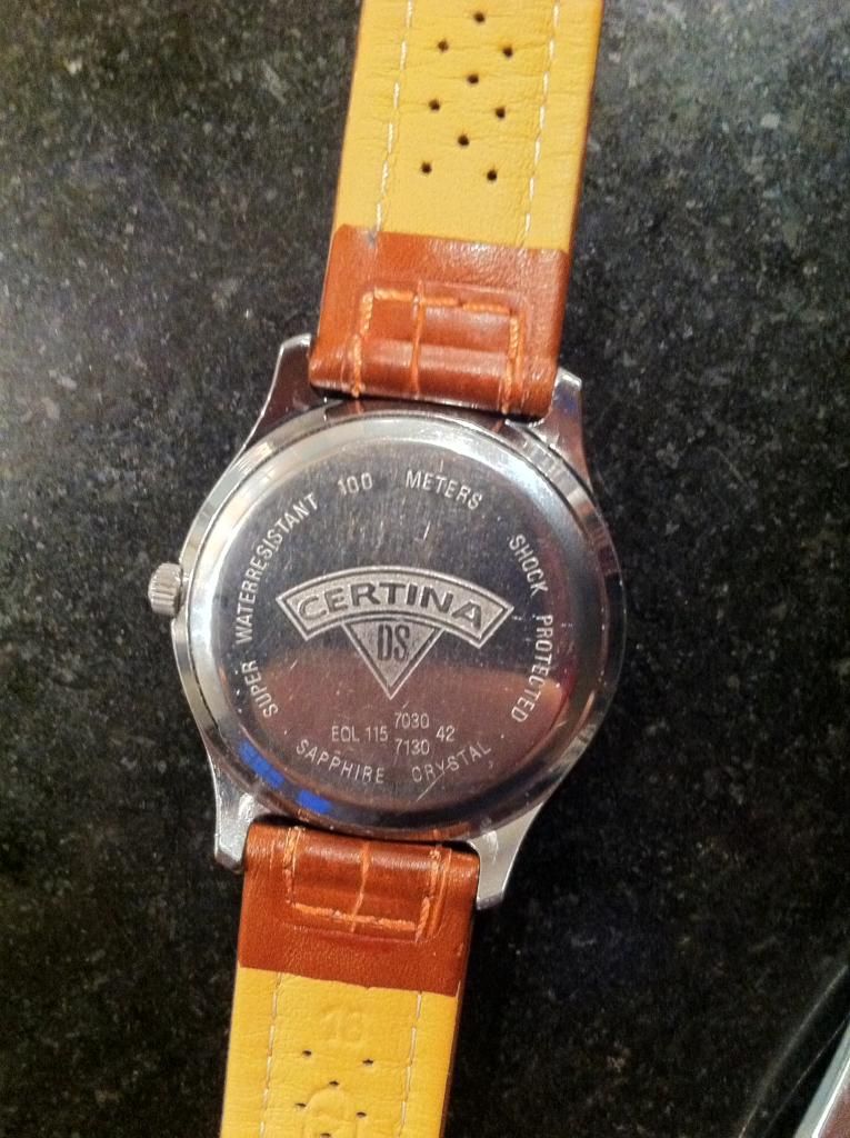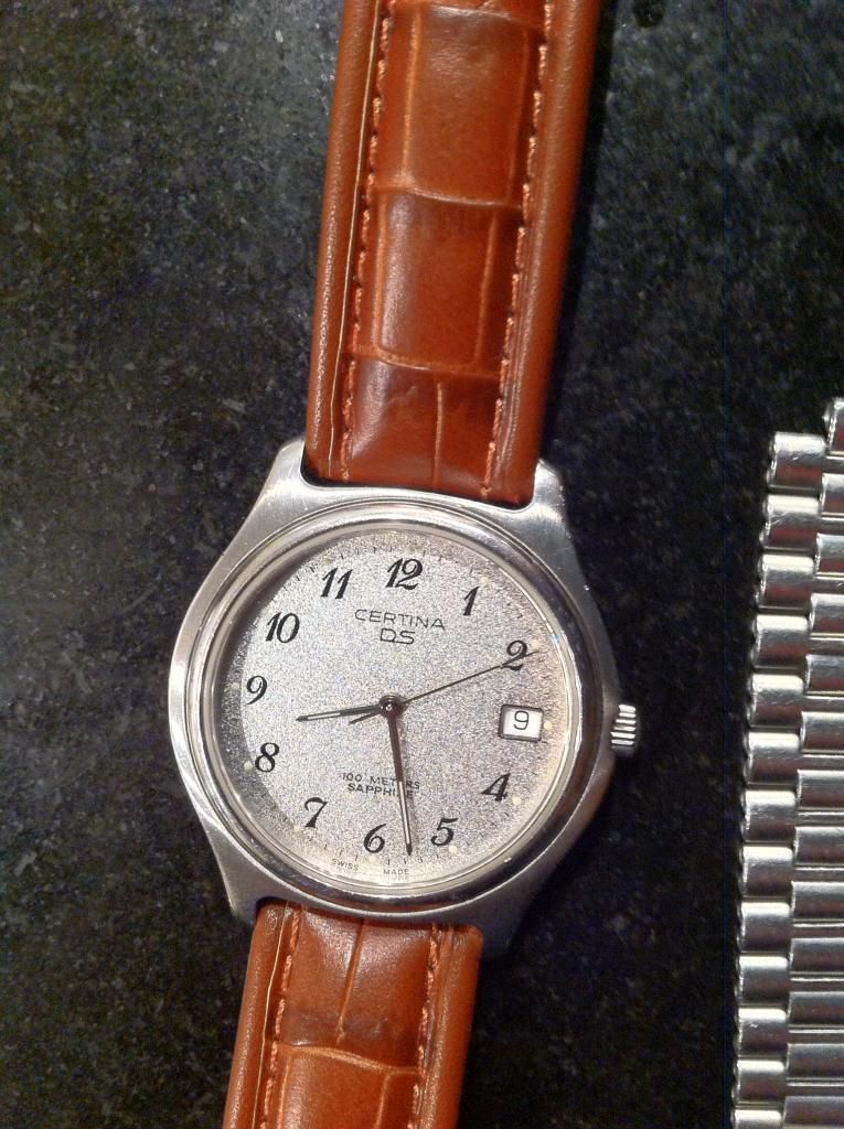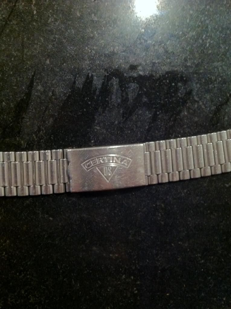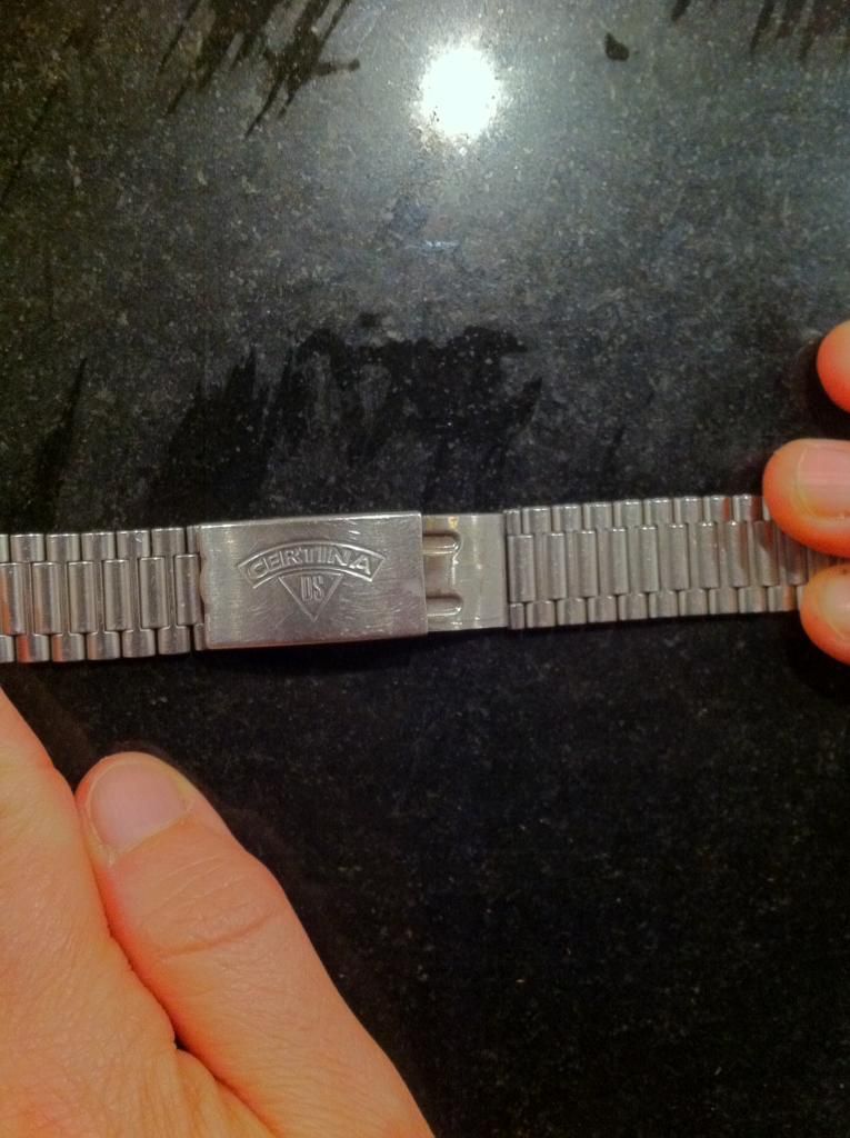 Eerst de buitengewoon smerig geworden metalen band verwijderd, een mooi leren bandje van Di-modell erop gezet met een Certina gesp die ik nog had liggen. De metalen band inmiddels gereinigd, is ook in prima staat en heeft een bijzondere verlenging, werkend met een veer.