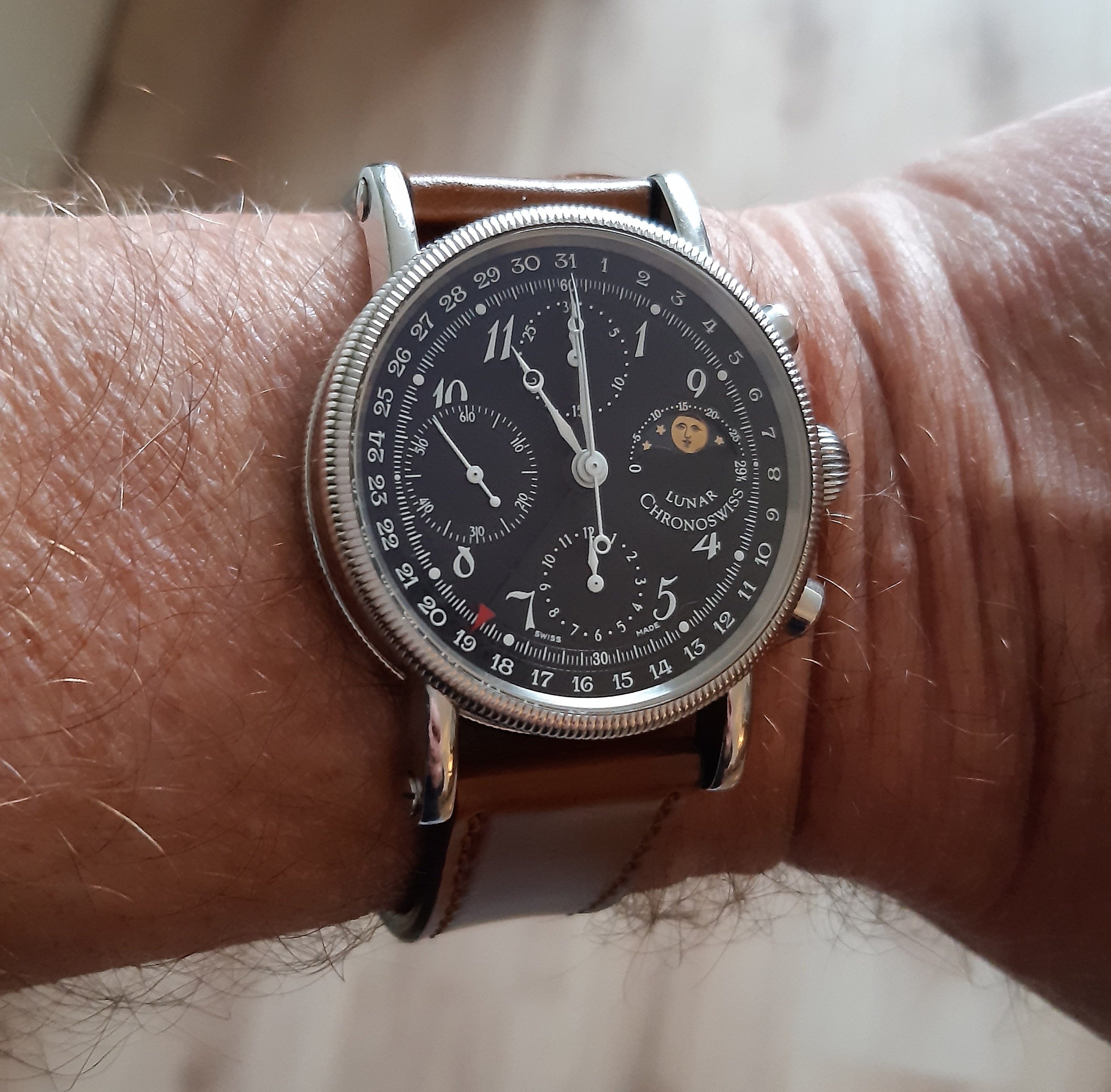 Zo eerste post hier op het forum, enkele maanden terug een Kairos aangeschaft! Ik liep een keer langs het House of Chronoswiss in Luzern en vond de geguillocheerde wijzerplaten en afwerking echt heel mooi. De nieuwe modellen zijn veelal wat over the top in mijn optiek maar de oude (waaronder die van mij uit omstreeks '93) kan ik wel erg waarderen. Dit model heeft wel (zoals de meeste destijds) een geslagen wijzerplaat ipv dat hij echt geguillocheerd is maar dat maakt hem niet minder fraai. Op leer vind ik ze iets te klassiek dus de originele band heb ik vervangen door een paar NATO’s. Normale banden zijn lastig te wisselen door de geschroefde pins dus deze zijn een prima alternatief en geven hem een wat modernere look. Na aanschaf heb ik hem gelijk voor een full service bij Timefix in Akersloot gebracht zodat hij voorlopig weer tegenaan kan. Ik ben er erg blij mee in elk geval!