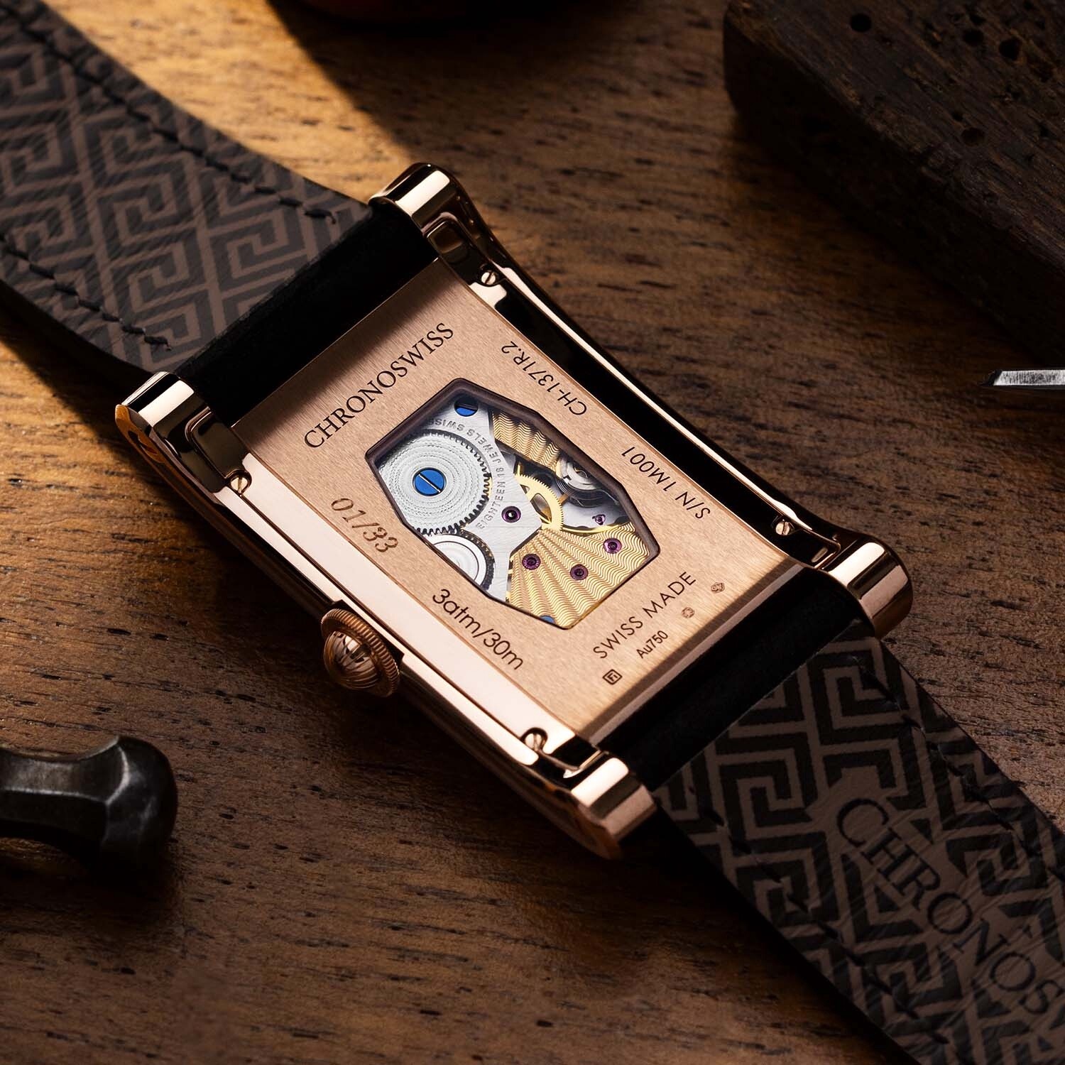 Maar waar het origineel een kaliber gebruikte dat perfect in de rechthoekige kast paste, zit de huidige versie met een duidelijk inferieur uurwerk, zowel qua afwerking als qua ontwerp. Het is in feite gewoon een rond kaliber, en door de vorm van het saffierglas probeert men de indruk te wekken dat het mooi in de kast past. Dat vind ik eerlijk gezegd wat pover.