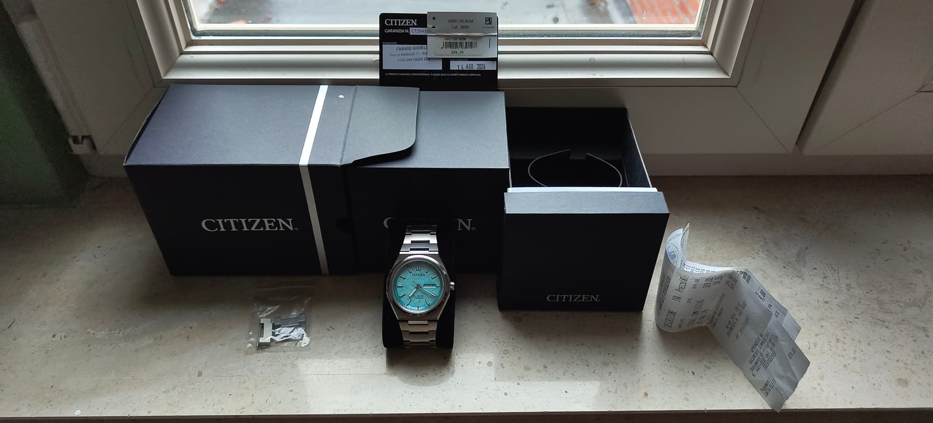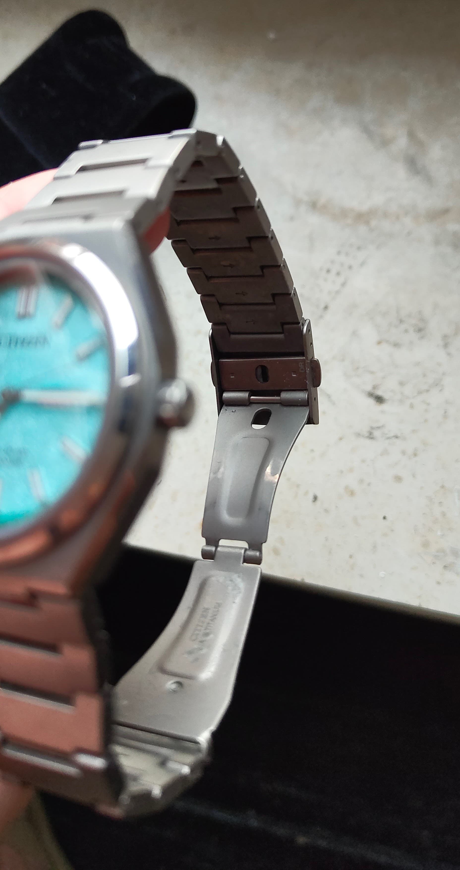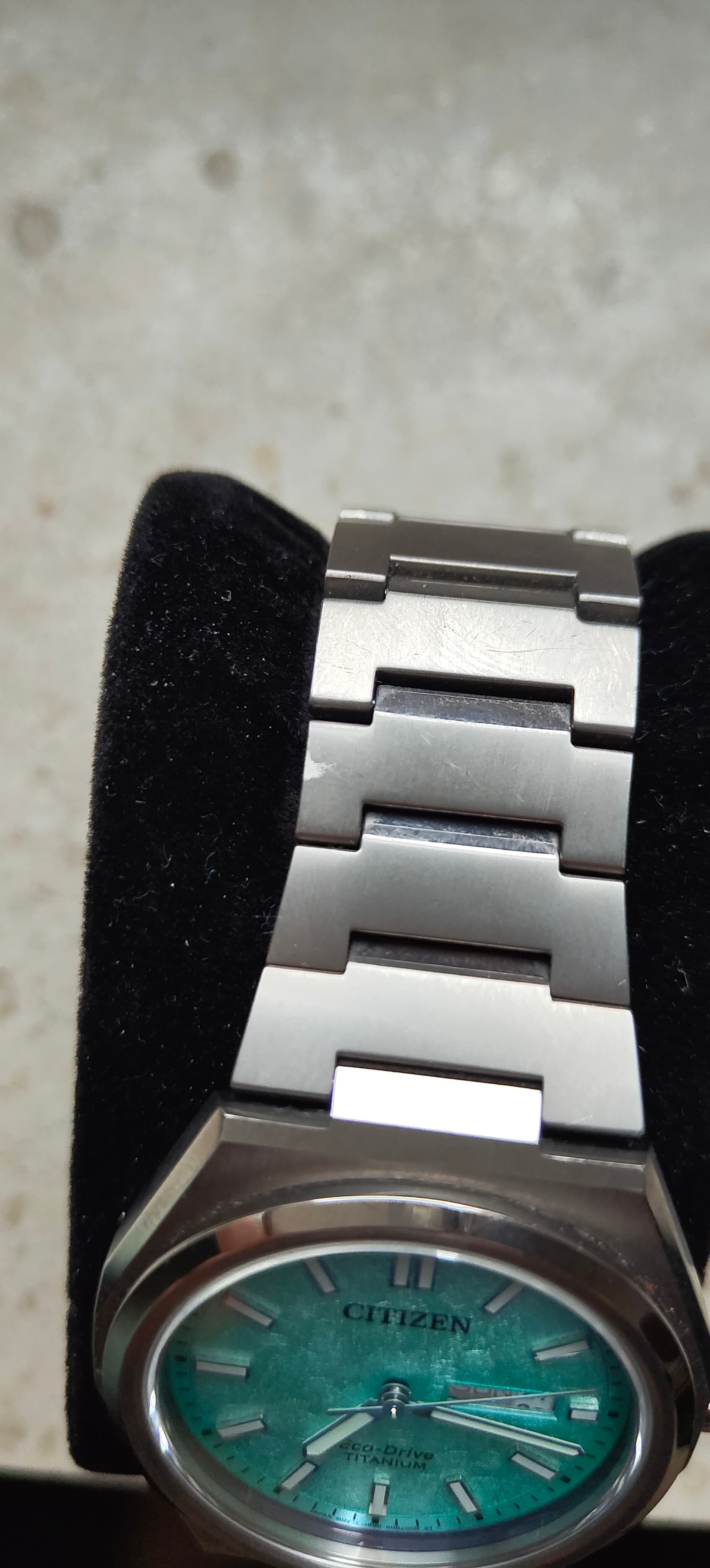 Conditie (krassen, werking etc): Ik zou zeggen 90/100? Ziet er goed uit, maar is wel gedragen geweest. Er zijn krasjes van het deskdiven tegen de onderkant van de band. De binnenkant van de clasp. En een schaafplekje op een link van de band; deze is zo duidelijk mogelijk weergegeven in de voorlaatste foto. Ik meen dat je deze link wel kan vervangen ook al staat er geen pijltje op.