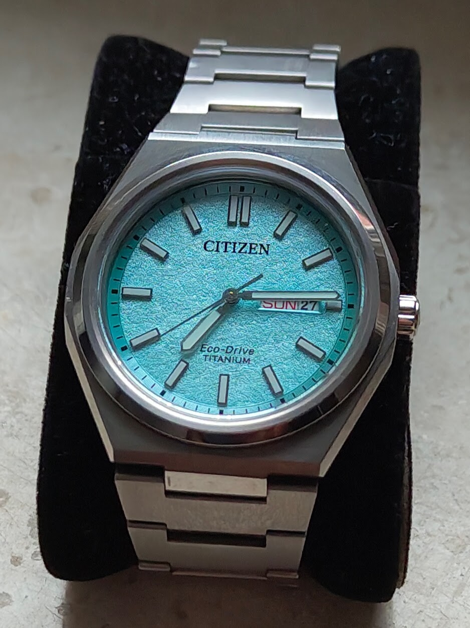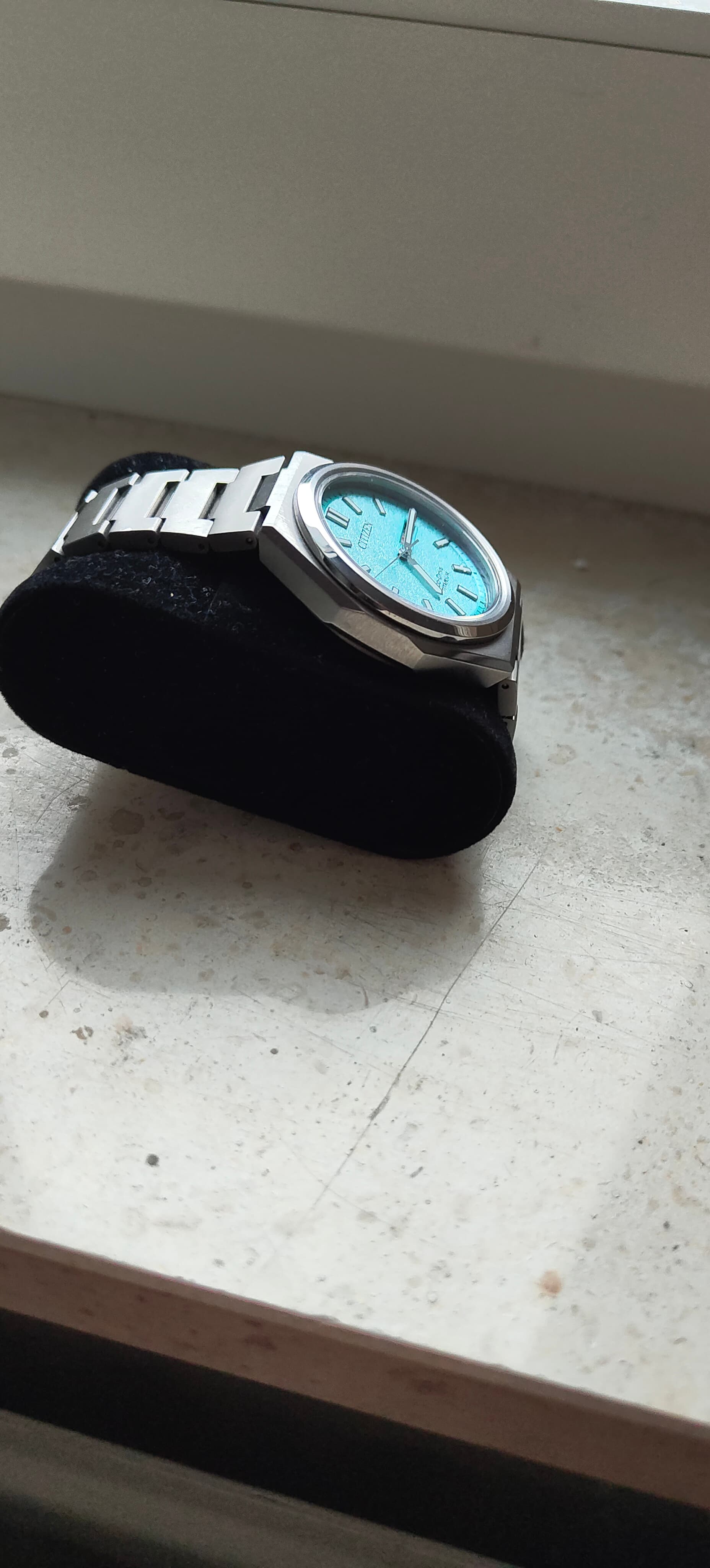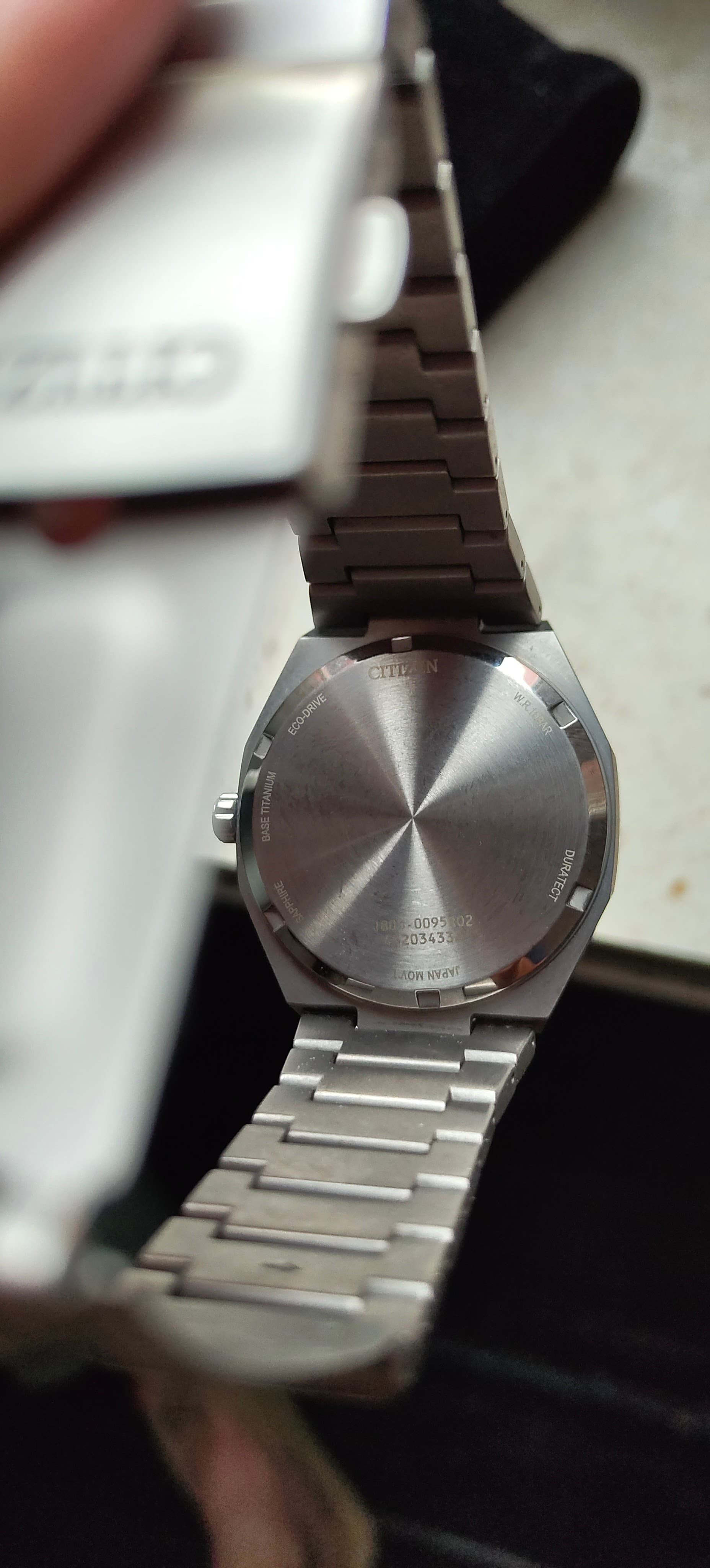 Conditie (krassen, werking etc): Ik zou zeggen 90/100? Ziet er goed uit, maar is wel gedragen geweest. Er zijn krasjes van het deskdiven tegen de onderkant van de band. De binnenkant van de clasp. En een schaafplekje op een link van de band; deze is zo duidelijk mogelijk weergegeven in de voorlaatste foto. Ik meen dat je deze link wel kan vervangen ook al staat er geen pijltje op.