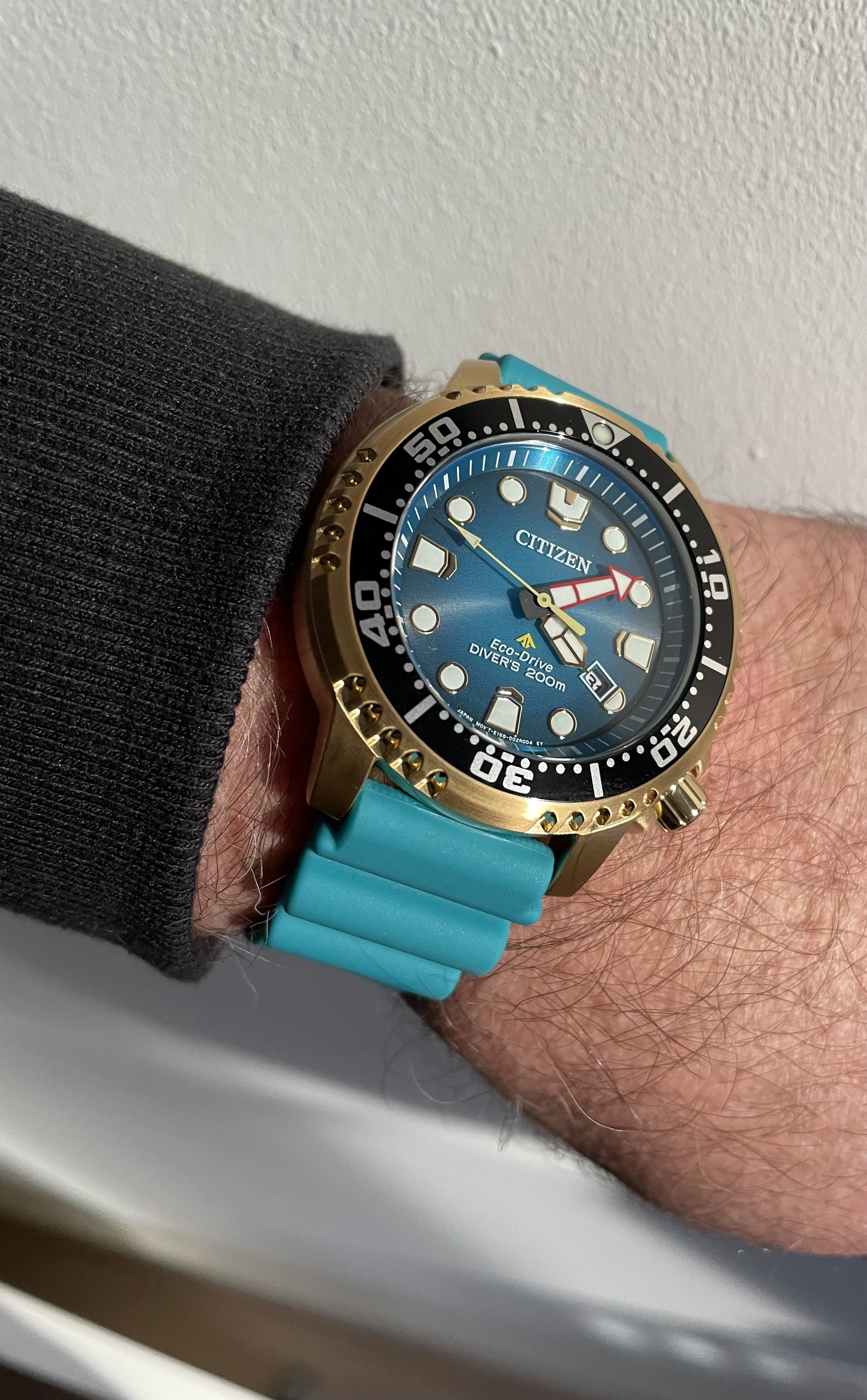 De band om de mijne is een Baltic Tropic strap die mooi slank tapert, past goed bij het tijdsbeeld van het horloge vind ik.