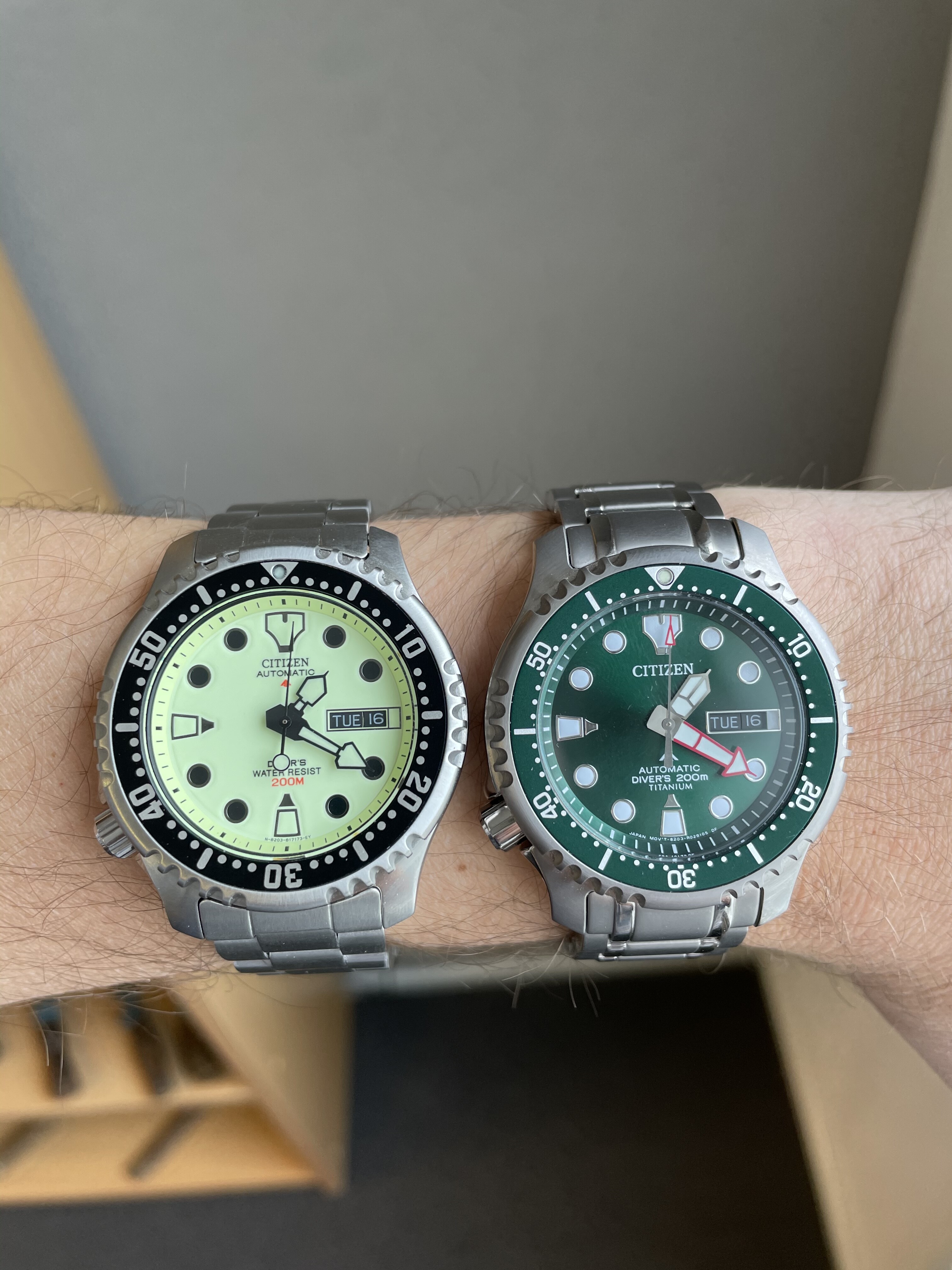 Rechts mijn full titanium (stiekem mijn meest gedragen horloge mede omdat ik midden in een fikse verbouwing zit) en links mijn NA full lume op staal.