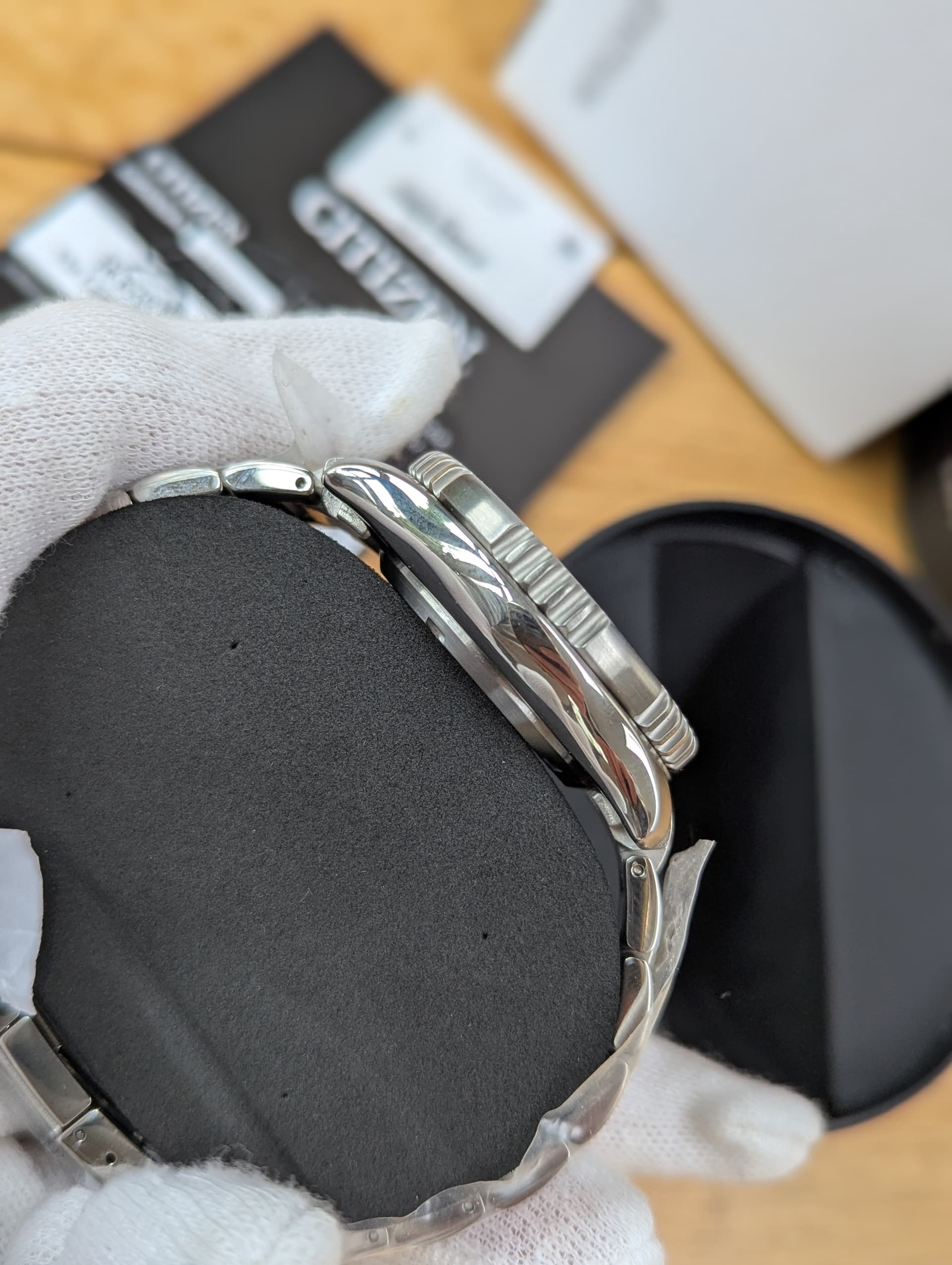 Originele doos en/of eventuele accessoires: Full set. Ingevulde garantiekaart. Extra ingedragen rubber strap. Originele, ongedragen stalen band zit nog in de folie.