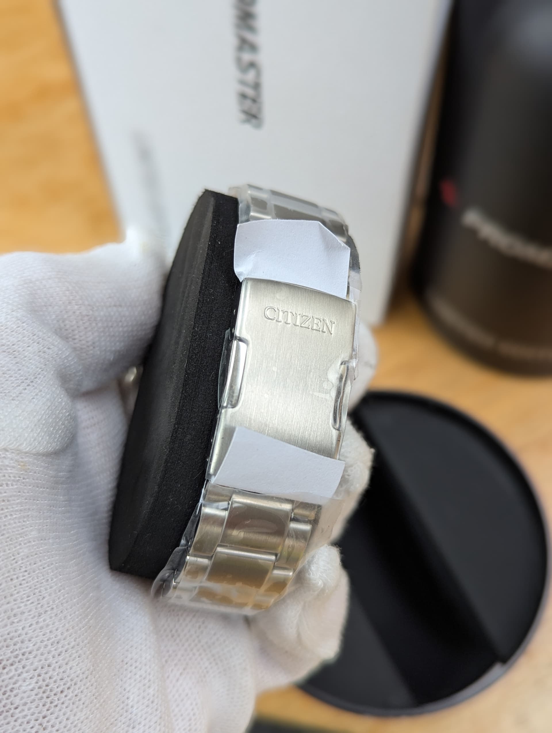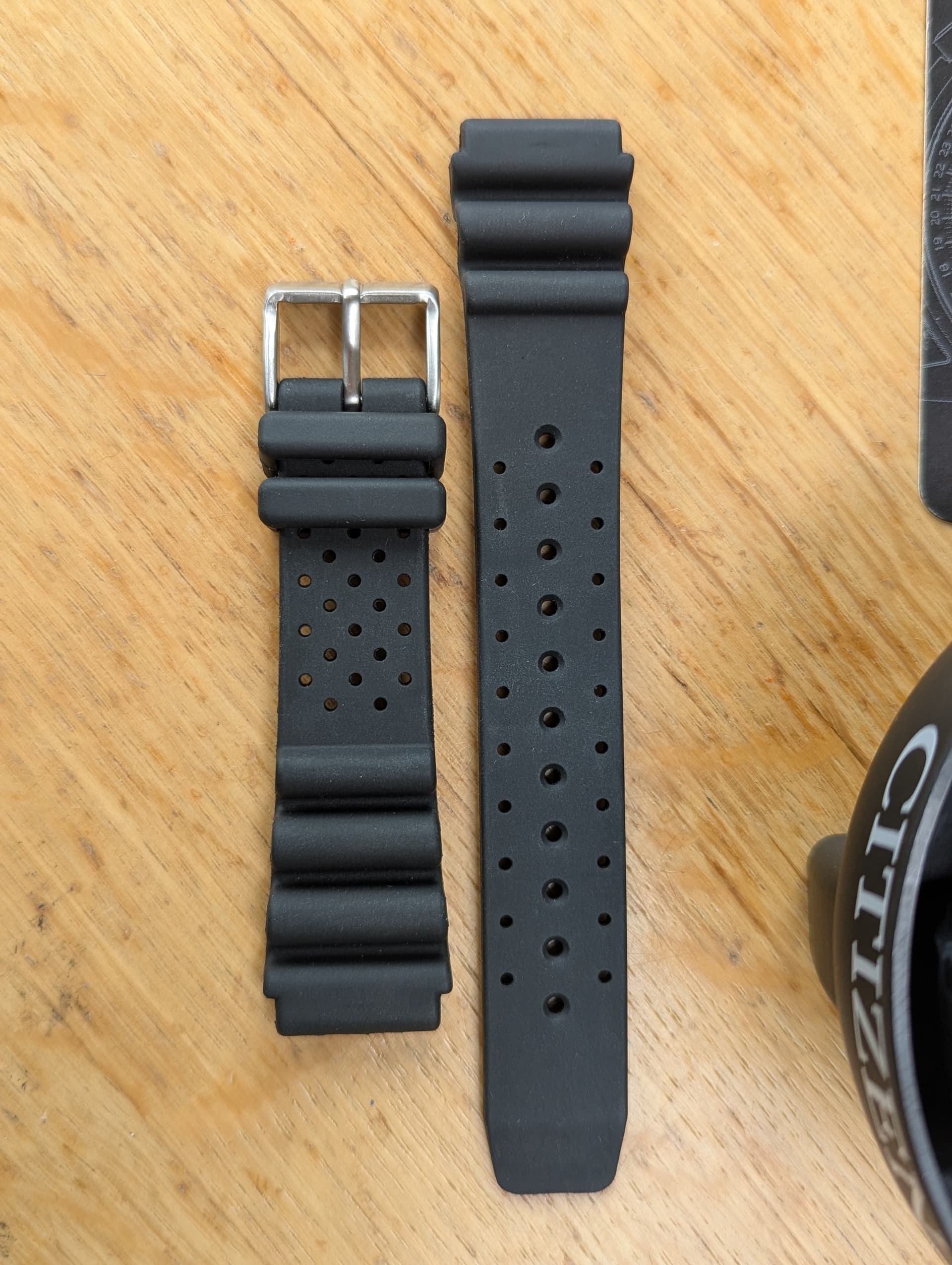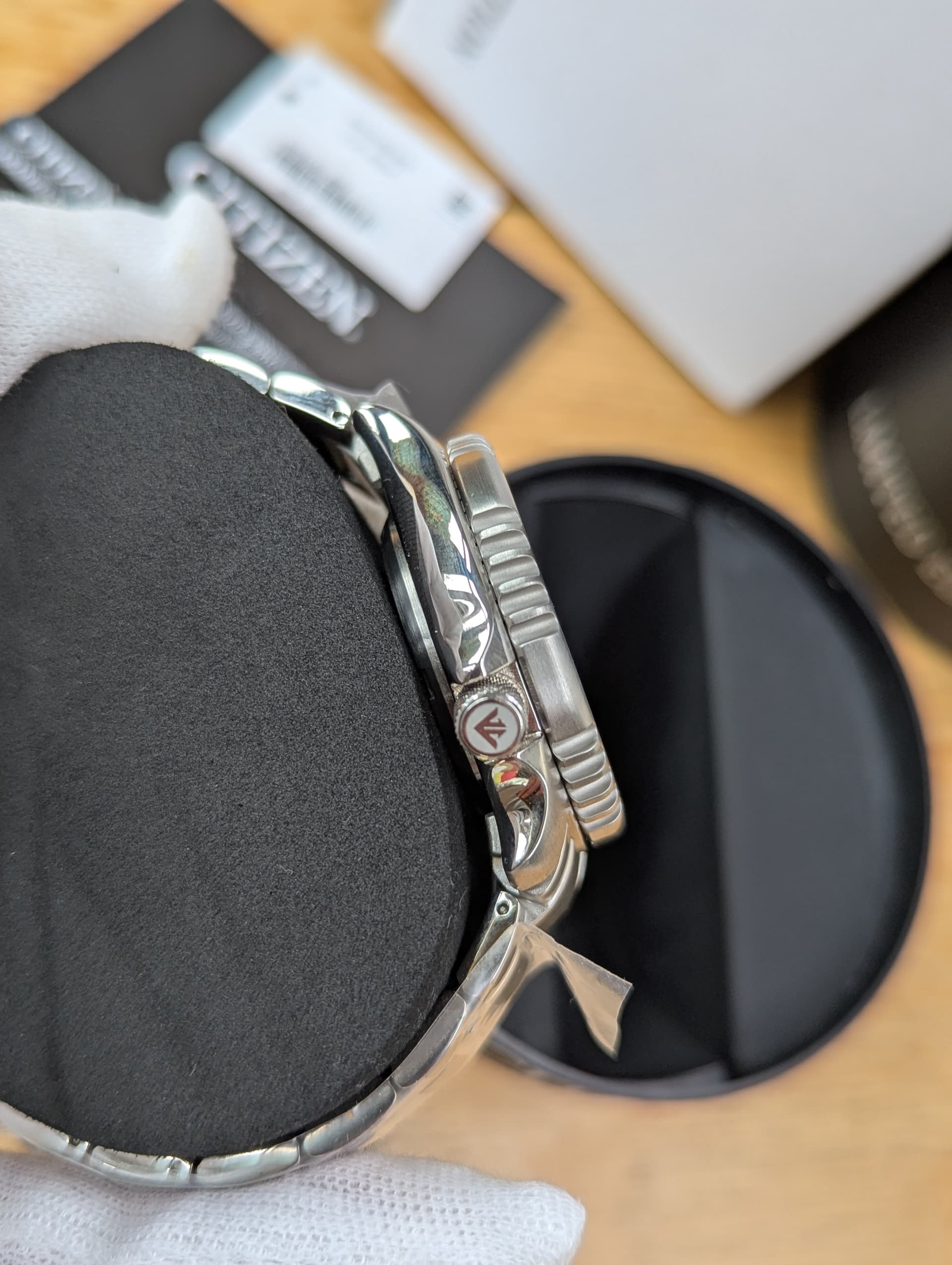 Deze Limited Edition Citizen is eigenlijk een pracht van een horloge. Maar ik voel nu al dat met al het geweld in de collectie ik hem toch steeds ‘net’ niet ga pakken. En dat is zonde. Het horloge is twee a drie keer thuis gedragen op een andere band. De stalen band zit nog in de folie/stickers en de rubberen band is heerlijk plat. Deze lijkt een stuk zachter dan andere Citizen banden trouwens.