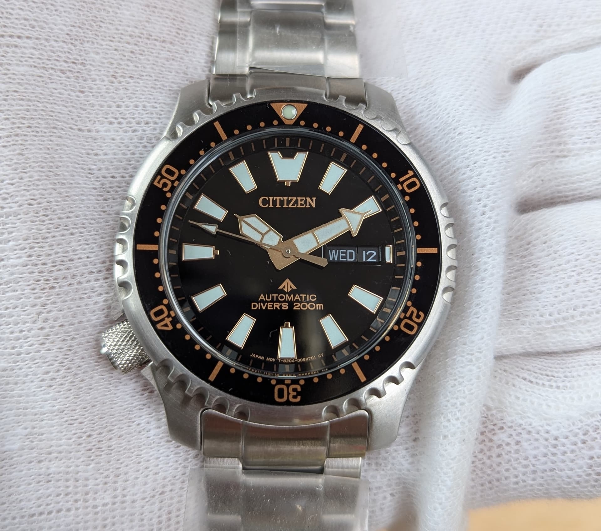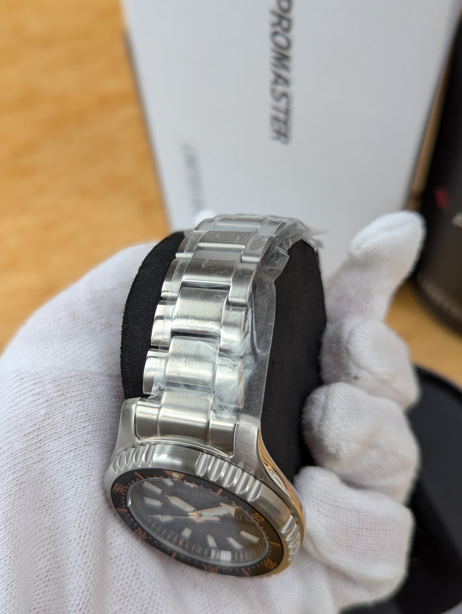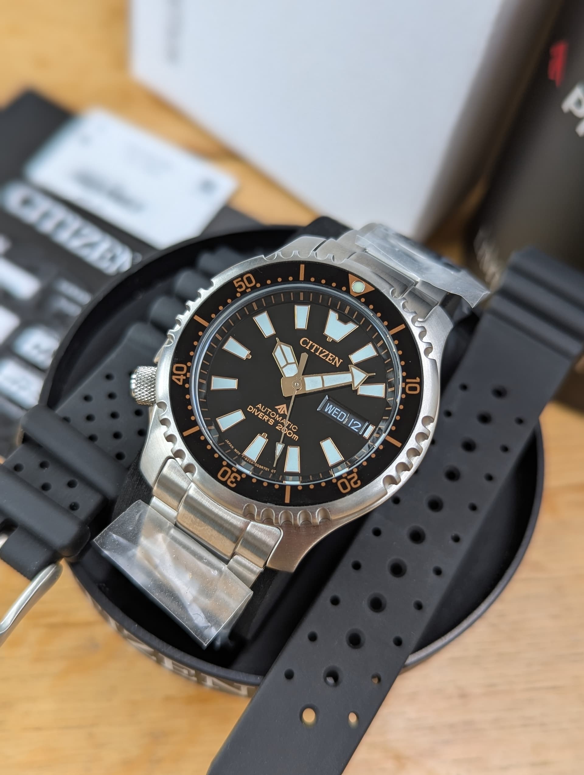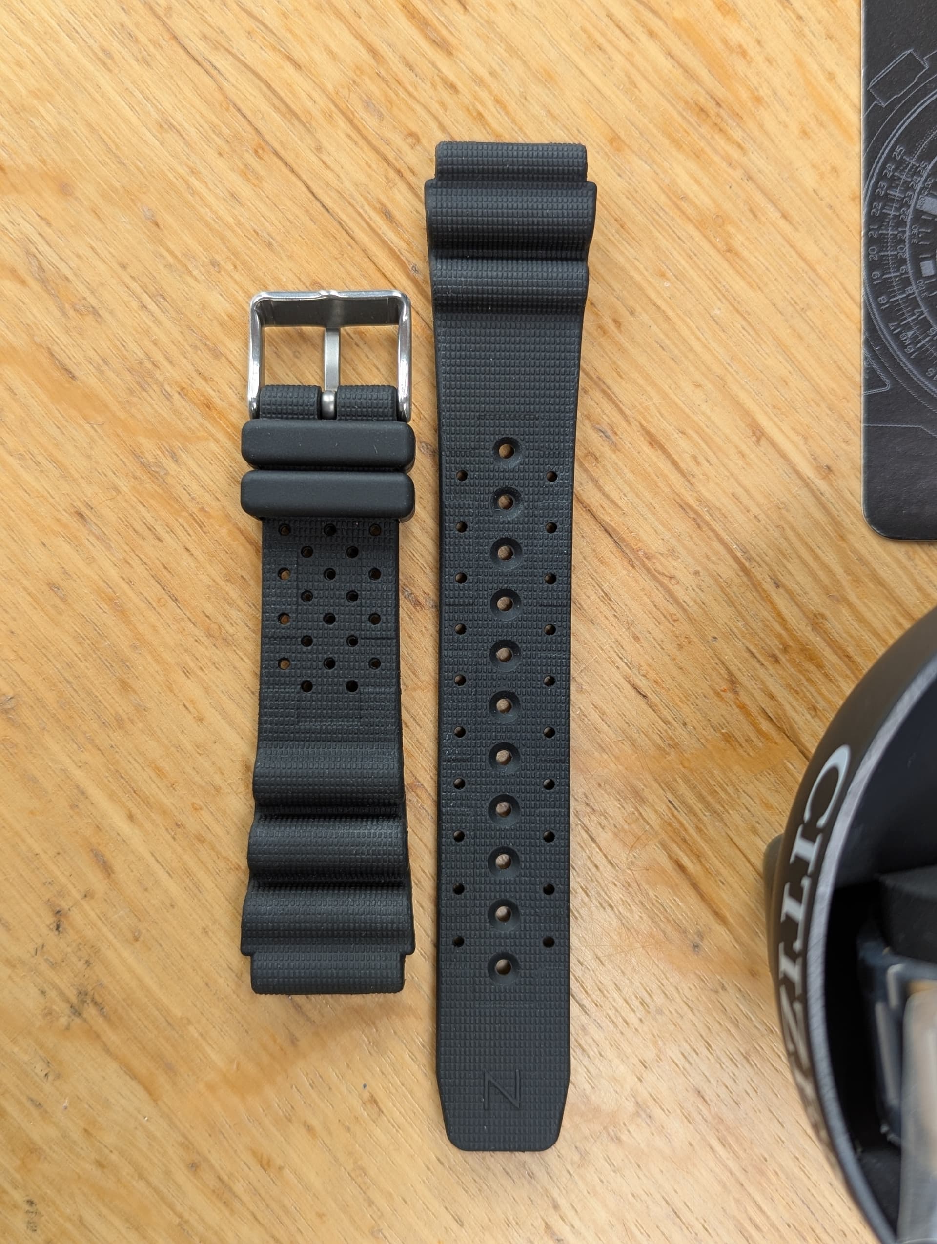 Deze Limited Edition Citizen is eigenlijk een pracht van een horloge. Maar ik voel nu al dat met al het geweld in de collectie ik hem toch steeds ‘net’ niet ga pakken. En dat is zonde. Het horloge is twee a drie keer thuis gedragen op een andere band. De stalen band zit nog in de folie/stickers en de rubberen band is heerlijk plat. Deze lijkt een stuk zachter dan andere Citizen banden trouwens.