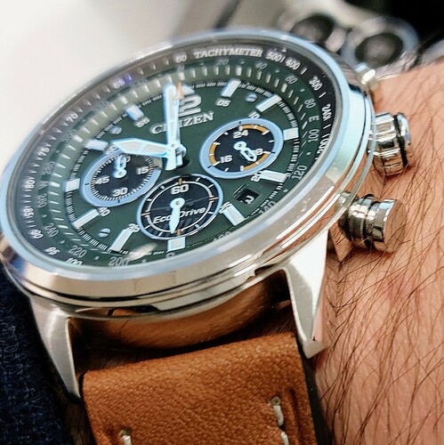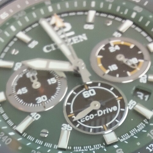 Een Citizen Pilot Watch met een groene wijzerplaat. Al zie ik het merendeel van de info op de wijzerplaat van die Citizen-pilotenhorloges niet meer zonder bouwlamp: gooi a.u.b. zoveel mogelijk erop. Dat maakt juist zo’n horloge charmant. Op deze uitvoering dus een tachymeter en een kompas. Best rustig dus voor Citizen begrippen.
