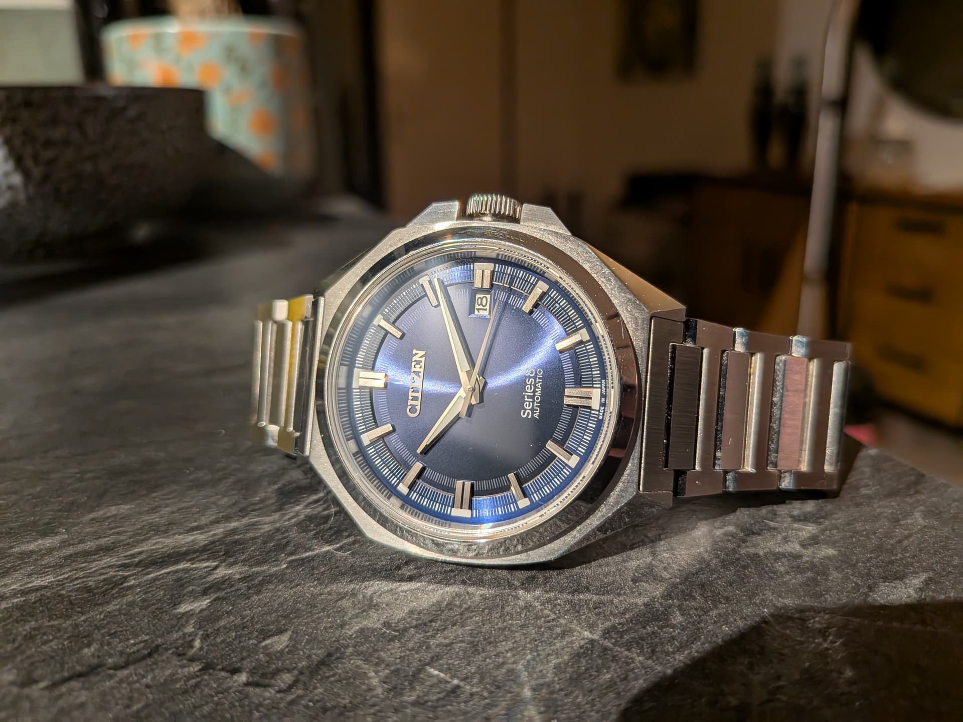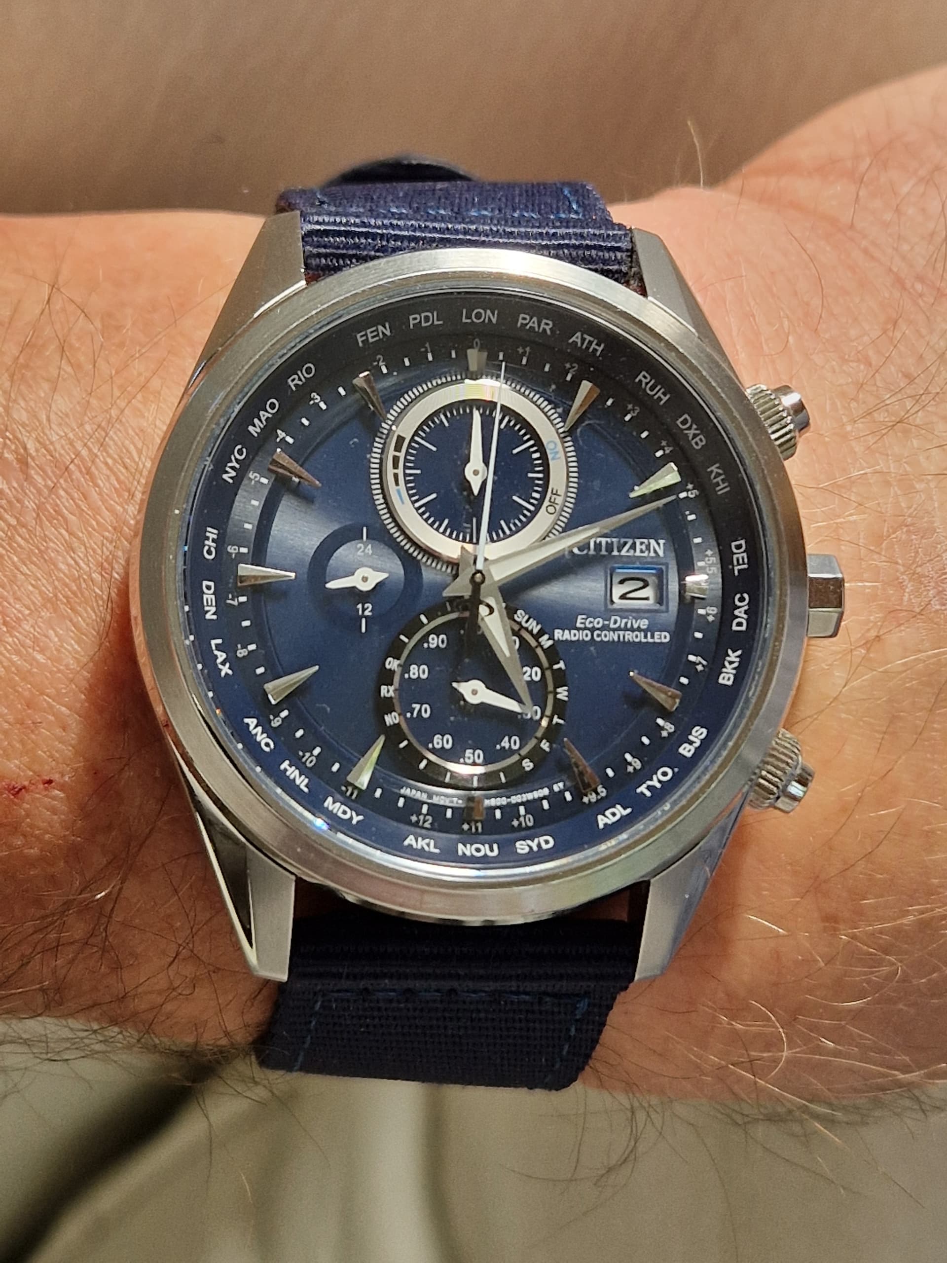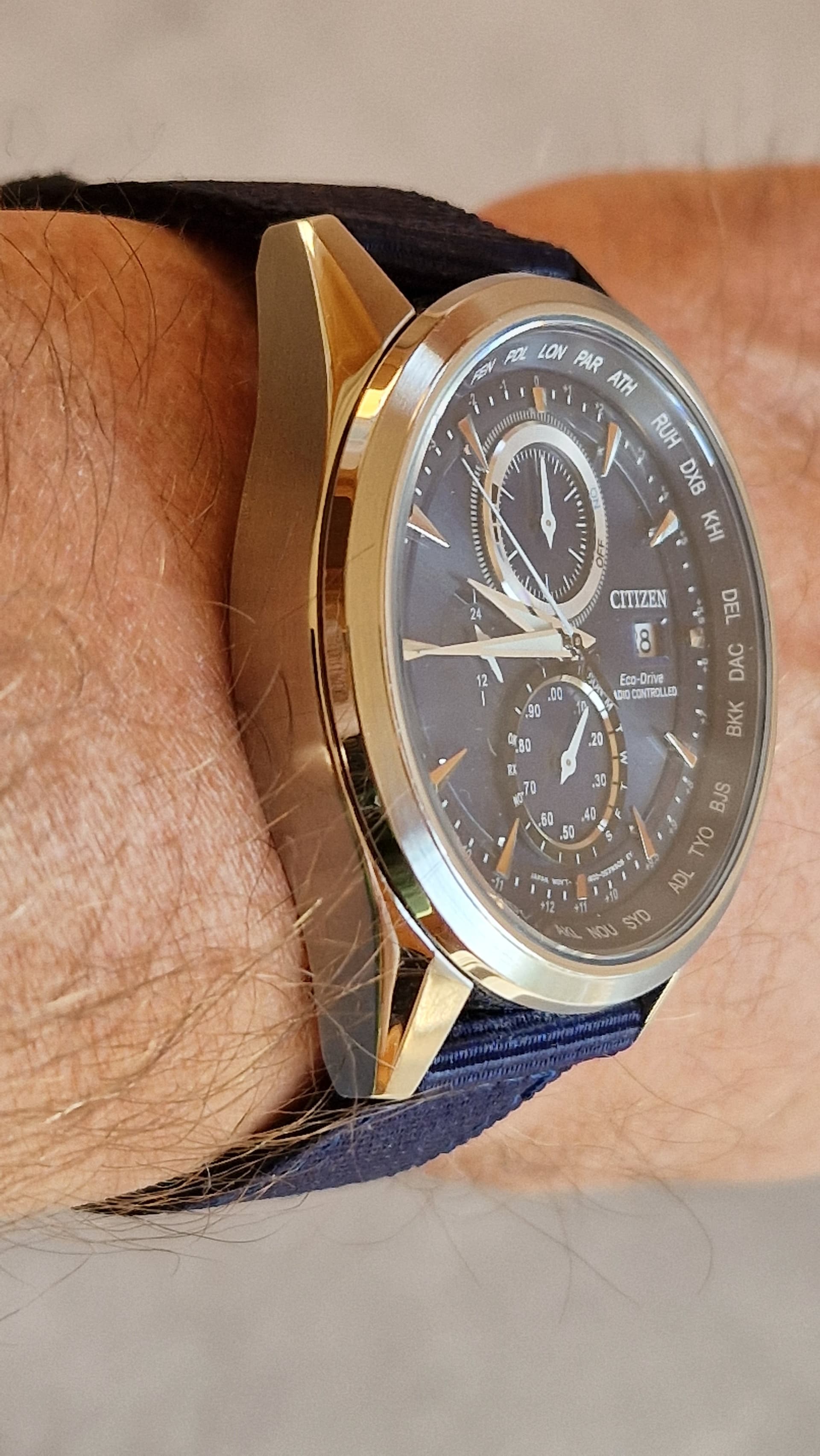 Pas een paar weken in bezit, deze AT8260. Altijd al liefhebber geweest van Japanse stijl GPS of radio controlled chronografen, waarbij opstaande randjes de subdials accentueren. Denk aan Seiko Astron, Casio Oceanus, Citizen Attesa, maar ook sommige minder kostbare Citizens zoals deze. Als er drie subdials sterk worden geaccentueerd op deze wijze, dan wordt het me te druk. Hetzelfde geldt voor afkortingen van wereldsteden/tijdzones op de bezelring; die zie ik liever iets minder opvallend aan de