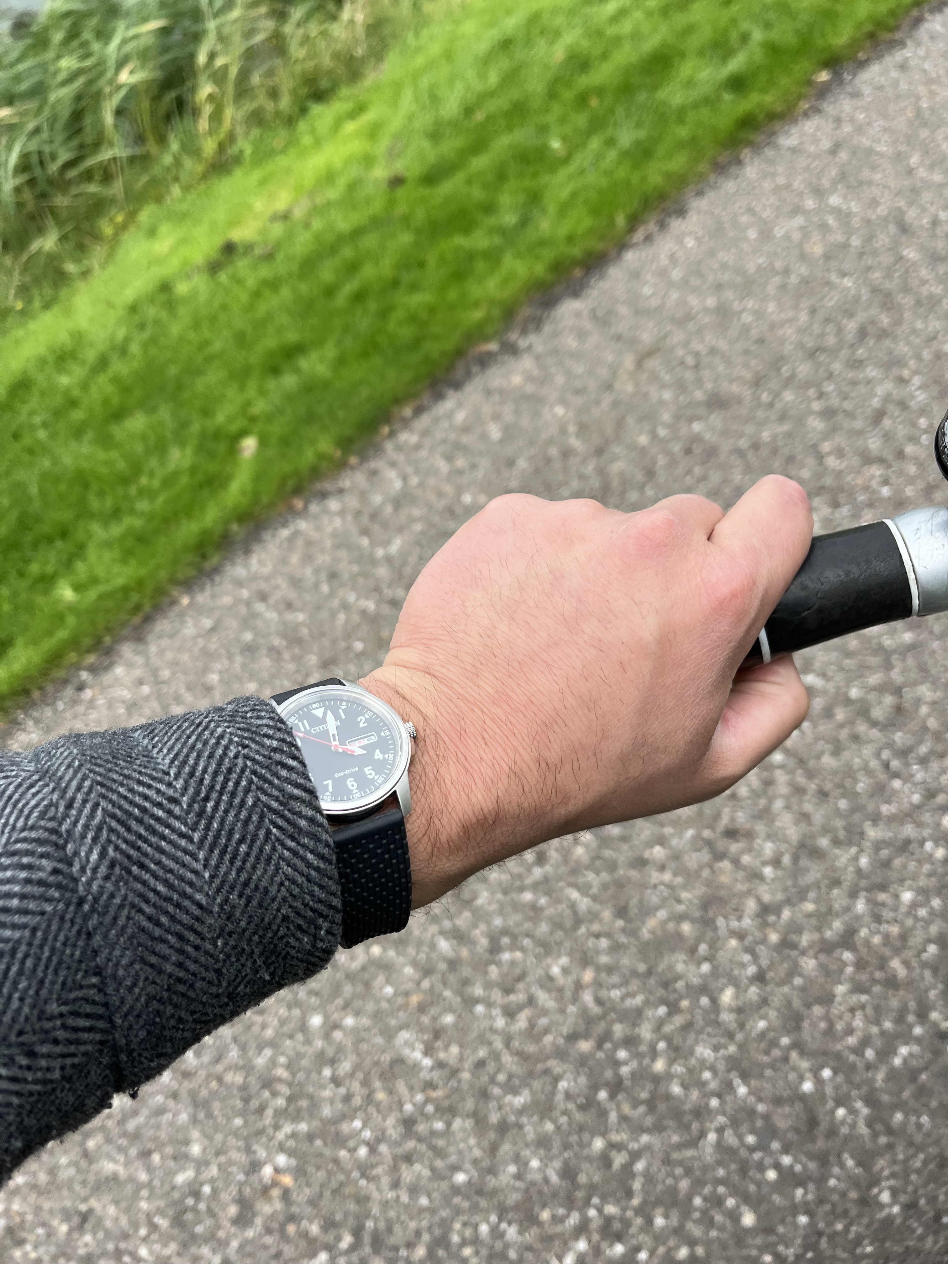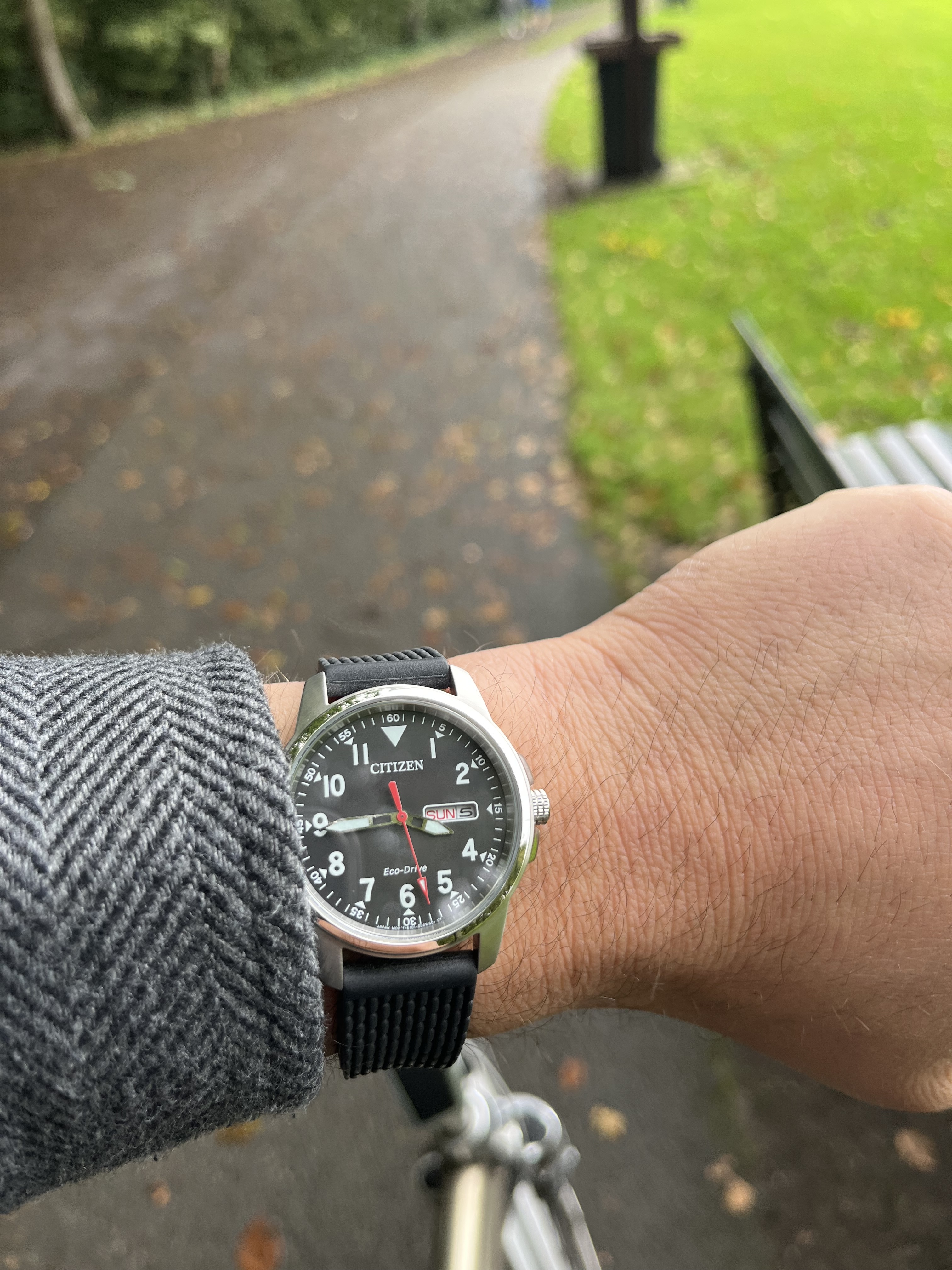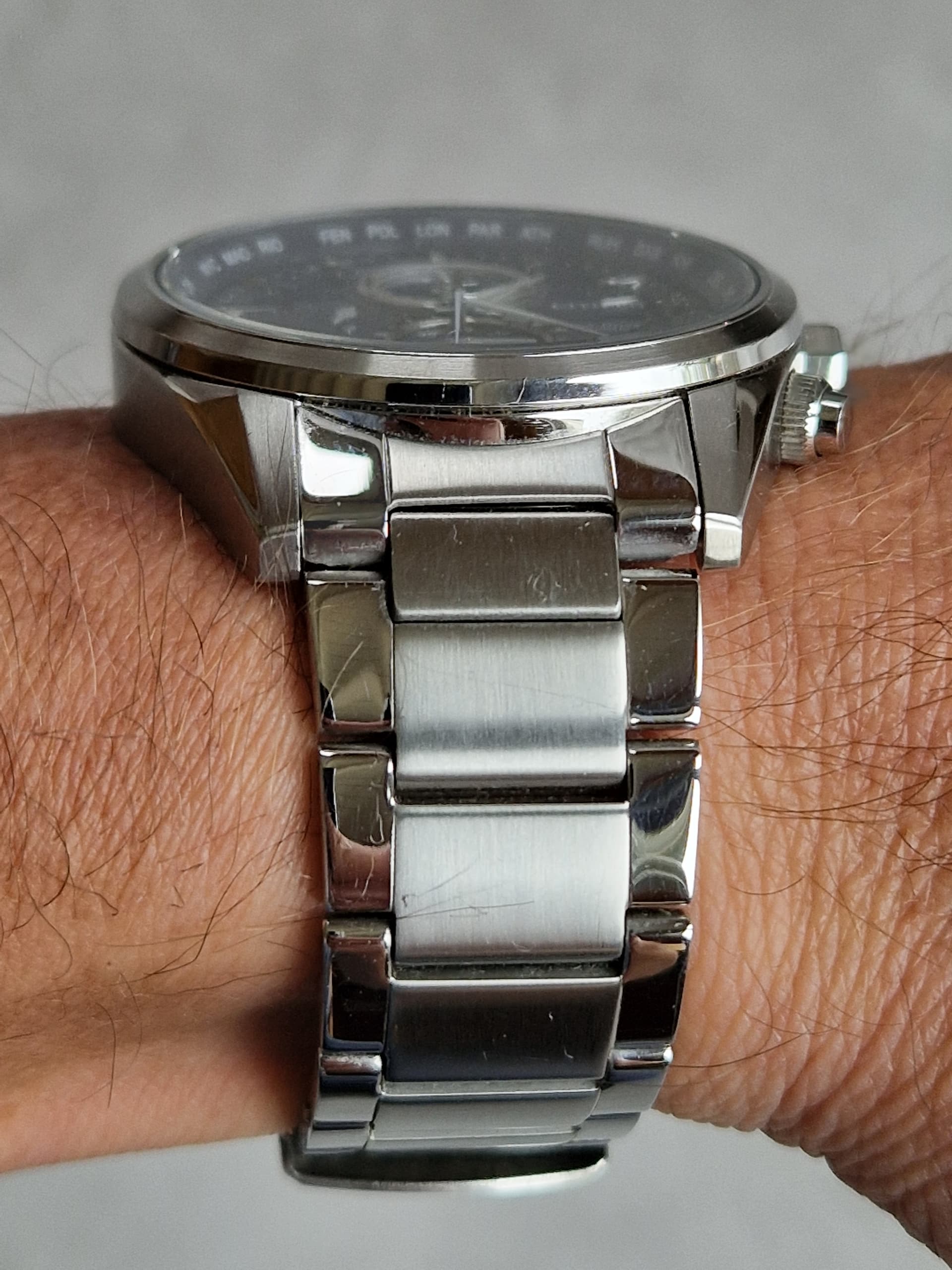grotendeels geborsteld RVS kast maken het plaatje compleet voor mij. Ik had vooraf wel een beetje twijfel over het formaat (43 mm), maar hoopte dat dat met de beperkte dikte van 10 mm mee zou vallen. Dat deed het dus niet. De RVS band aansluitend op de kast zorgt voor optische vergroting van die kast. Bovendien is die band met een flink deel hoogglans gepolijst RVS te nadrukkelijk aanwezig. Een 2 delige nato-stijl band (van horlogeforum sponsor horlogebanden.com) maakt voor mij het