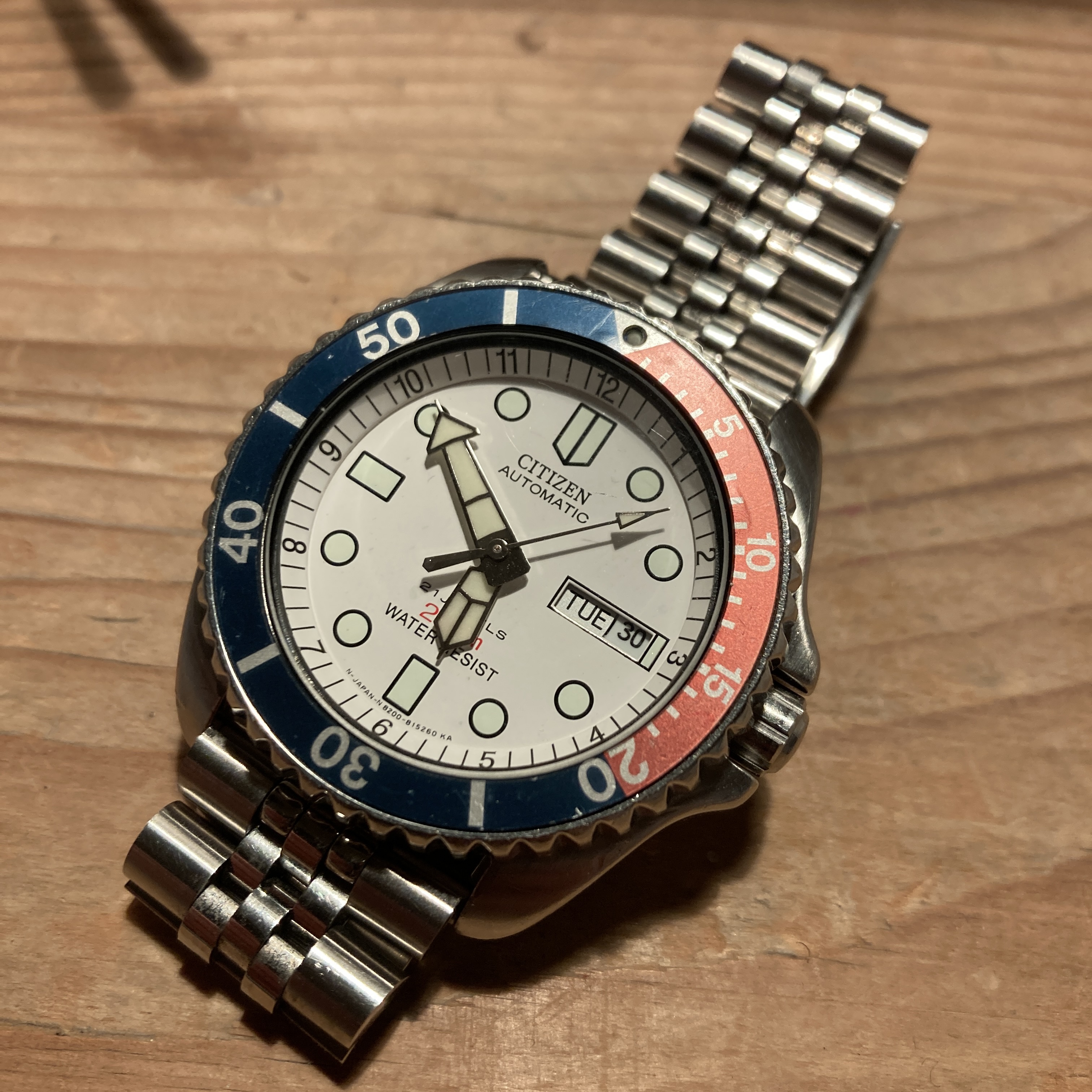 Het is een titanium Citizen uit 1985 met een speciale wijzerplaat voor metaalgigant Kobe Steel aka Kobelco (in Nederland bekend van hun graafmachines), met een inscriptie achterop ter ere van hun 80-jarig jubileum. Hij is lekker klein en plat, en zit me niet in de weg in tegensteling tot mijn gigantische Promaster Sky Pilot horloges. Overigens denk ik dat Citizen dit heeft gemaakt omdat Kobelco het staal en titanium voor ze levert, dat is mijn theorie in ieder geval. En het is meer dan een theorie, want ze hebben in 1999 samen twee titaniumlegeringen ontwikkeld speciaal voor horloges, maar die zijn vrij weinig toegepast (een paar Exceeds en Promasters). Het lijkt me in ieder geval logisch dat ze ook de reguliere metalen leveren, maar dat stond niet expliciet in de bron van Kobe Steel over de legeringen.