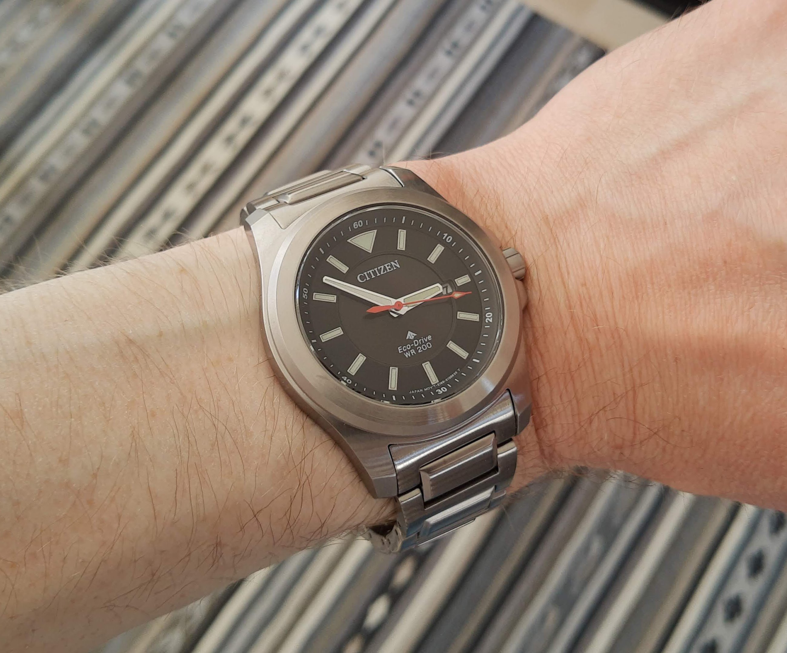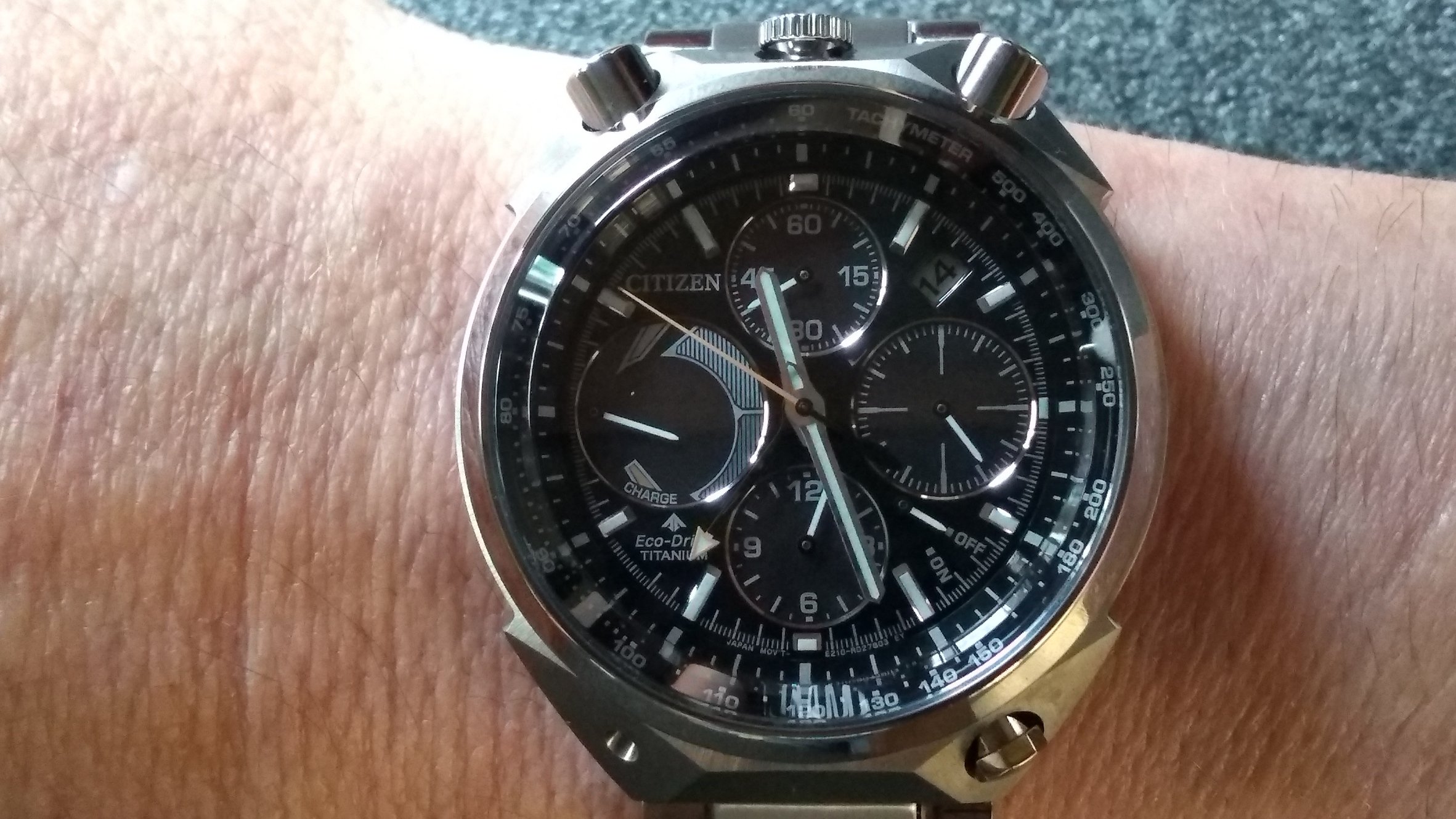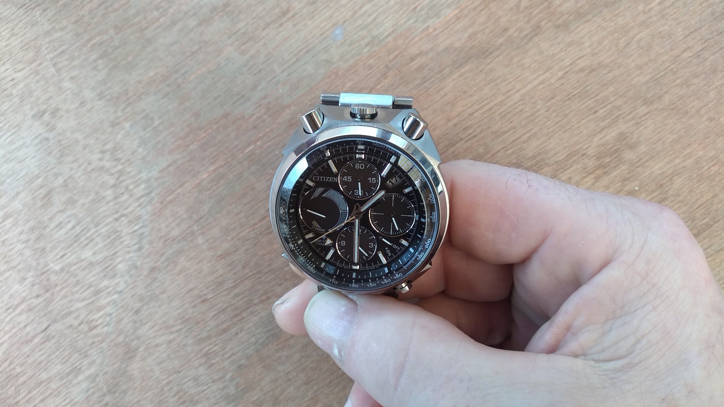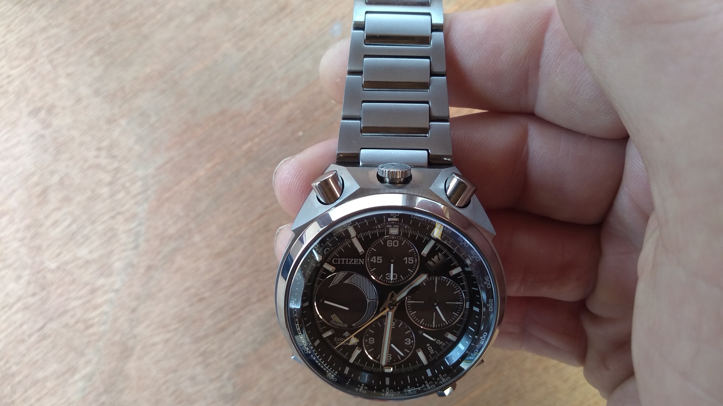 De verkoper had me al gezien en had het horloge reeds klaar genomen, meteen, met een grijns op mijn gezicht, het aangepakt en het eerste wat me opviel was hoe licht dat horloge was, aangenaam verrast, maar ik had het moeten weten (super titanium) weet je wel?