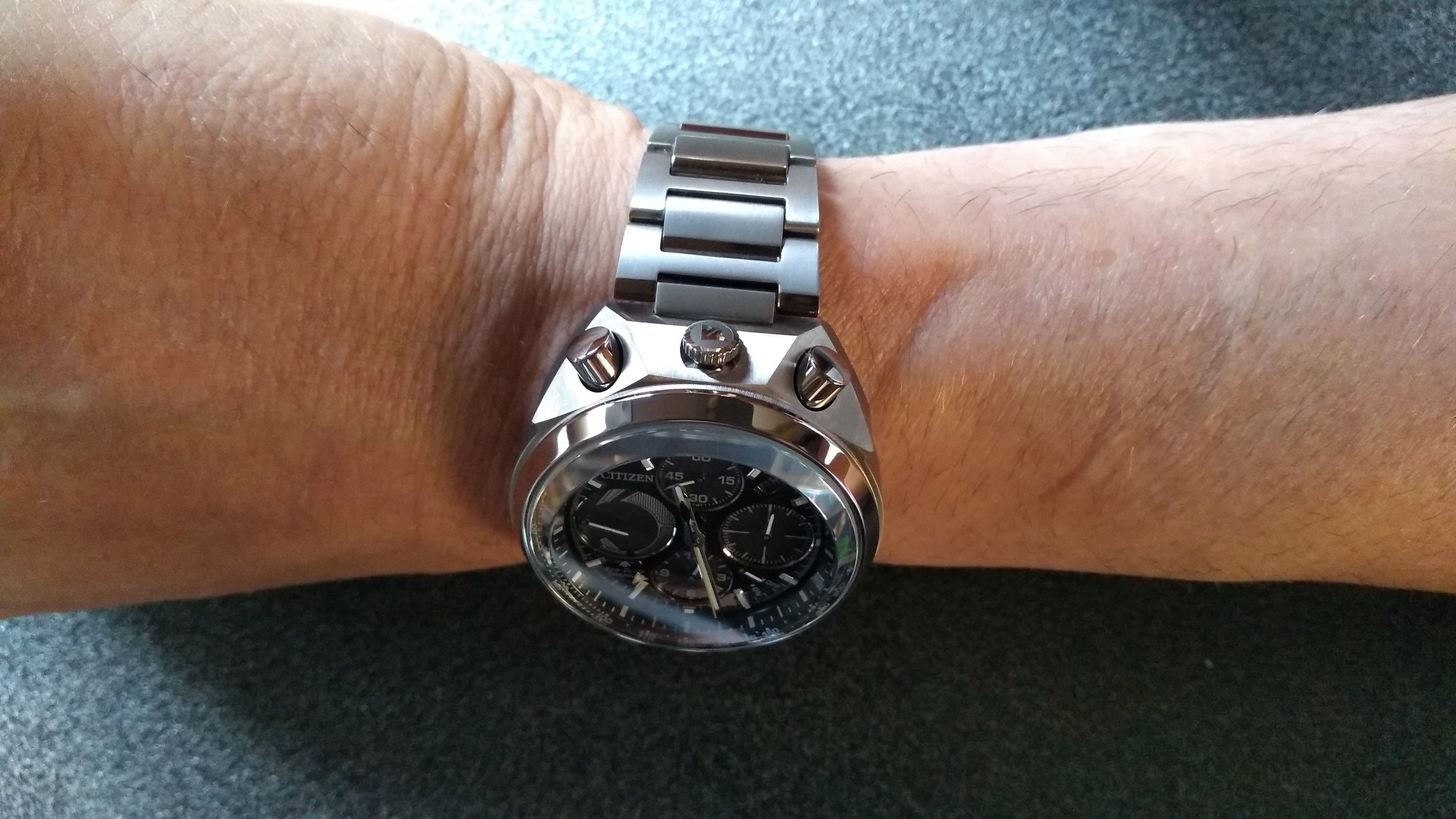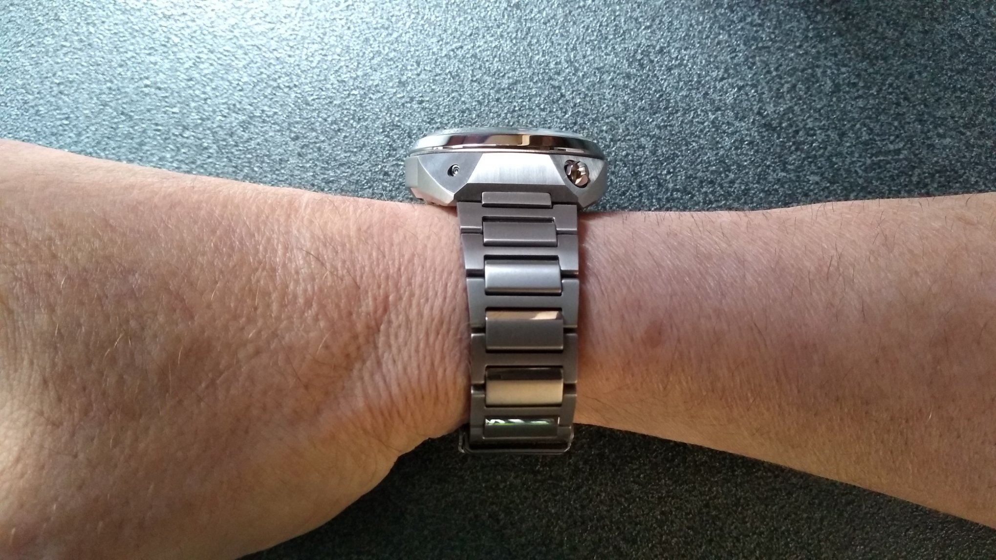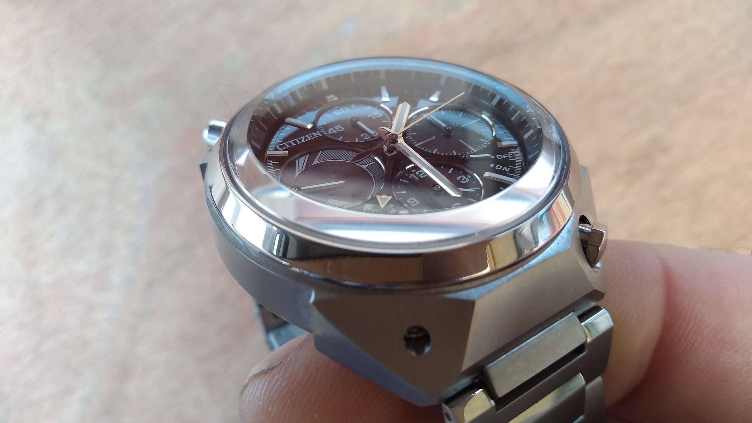 De verkoper had me al gezien en had het horloge reeds klaar genomen, meteen, met een grijns op mijn gezicht, het aangepakt en het eerste wat me opviel was hoe licht dat horloge was, aangenaam verrast, maar ik had het moeten weten (super titanium) weet je wel?