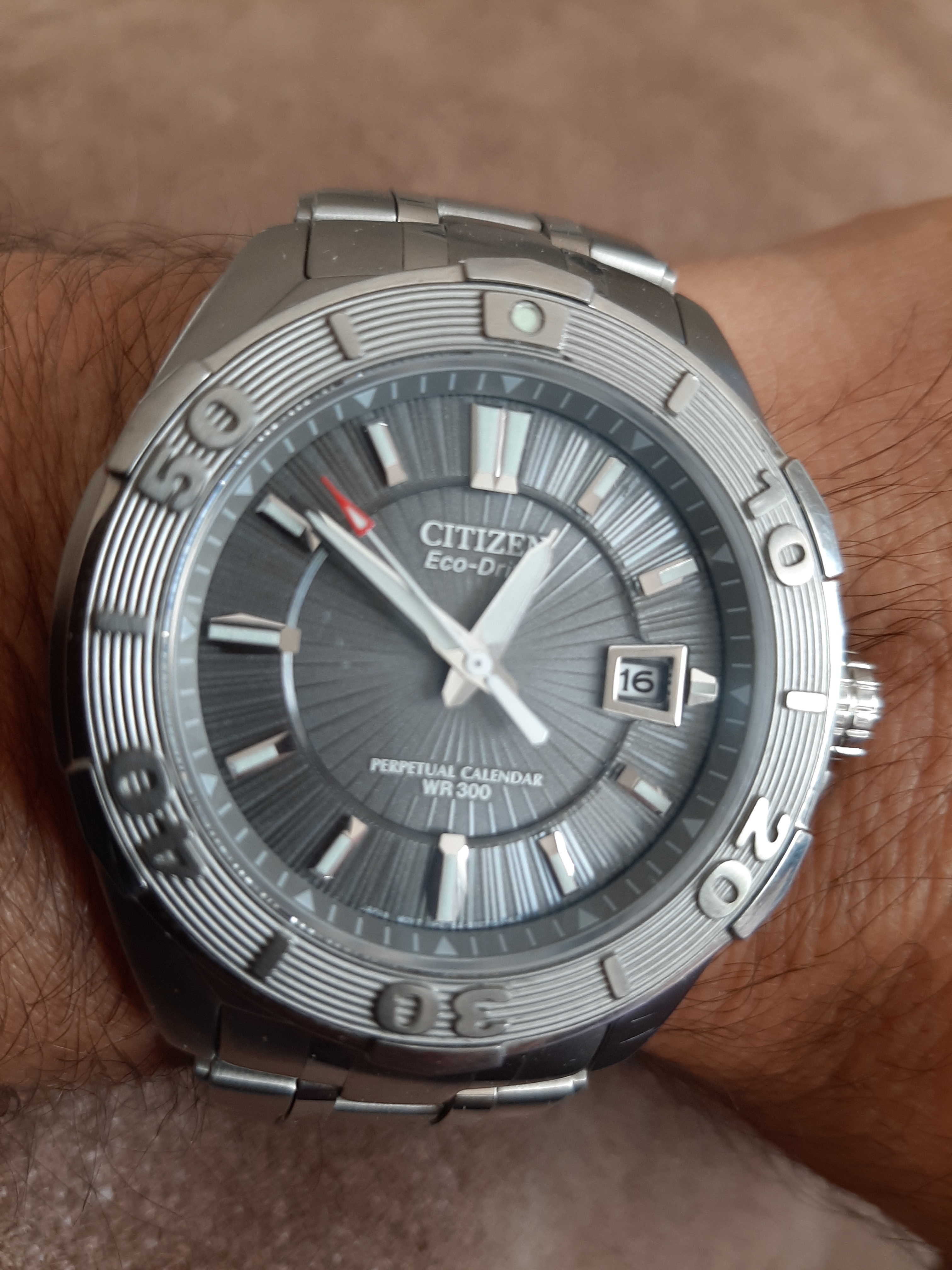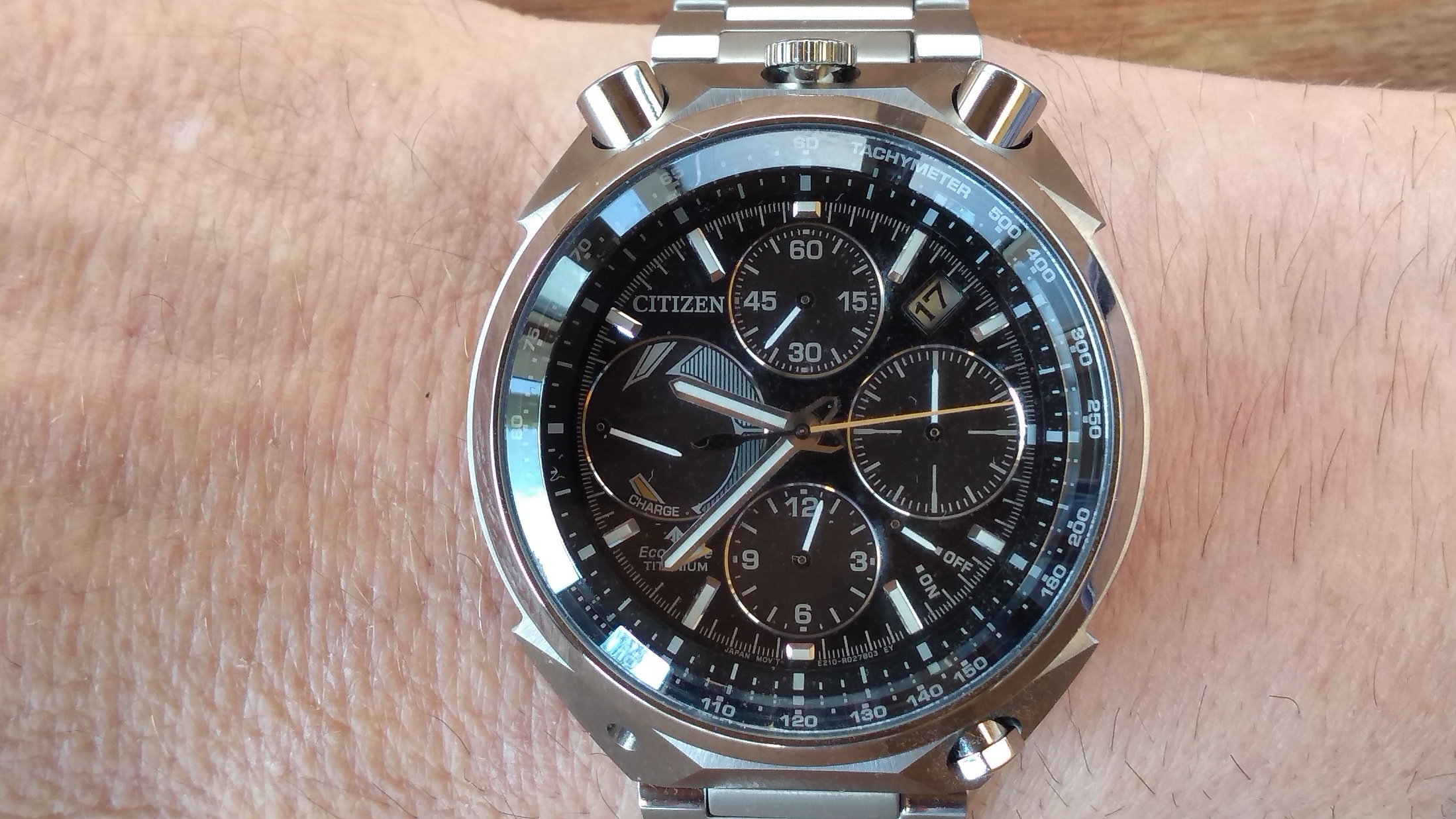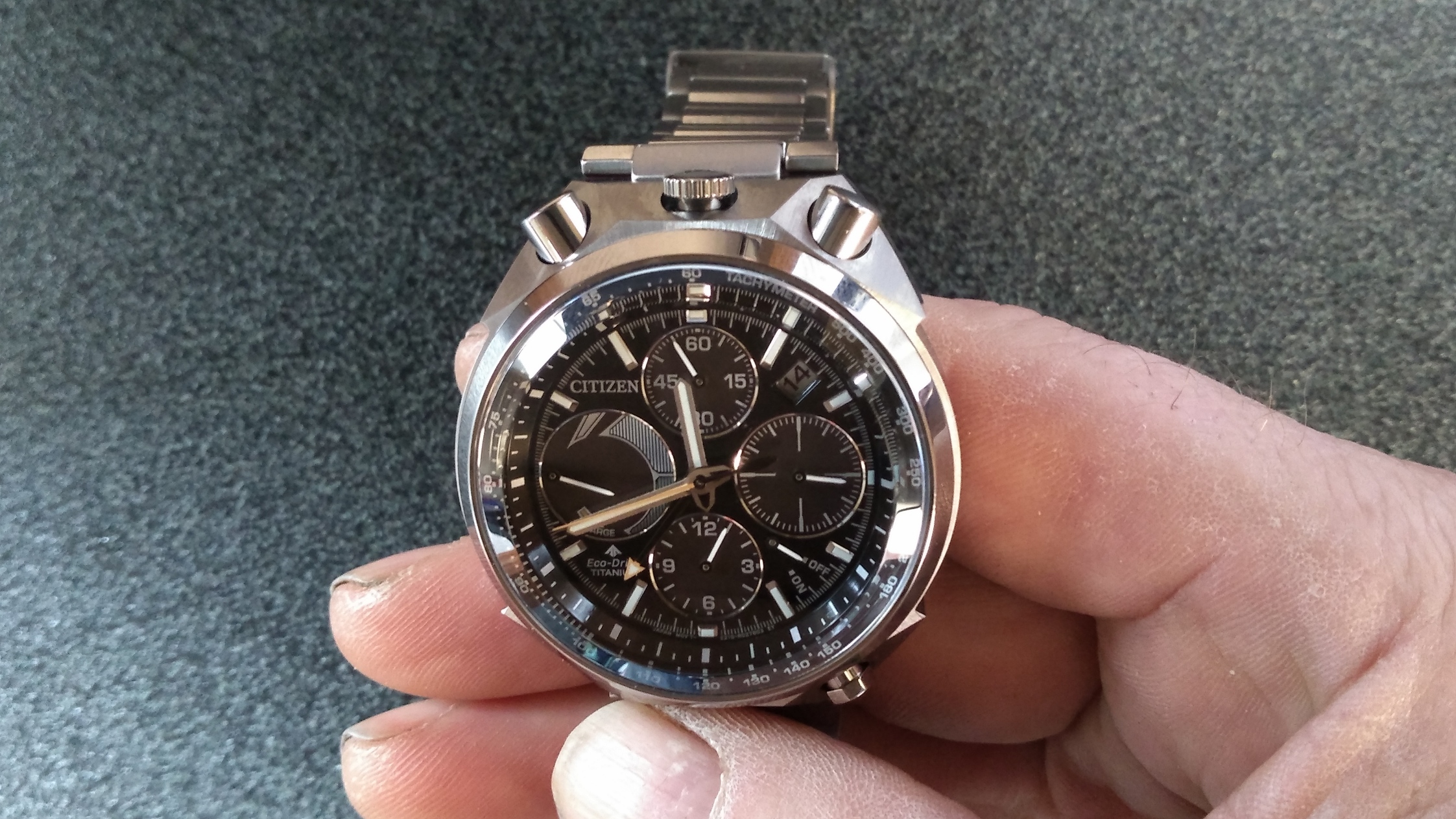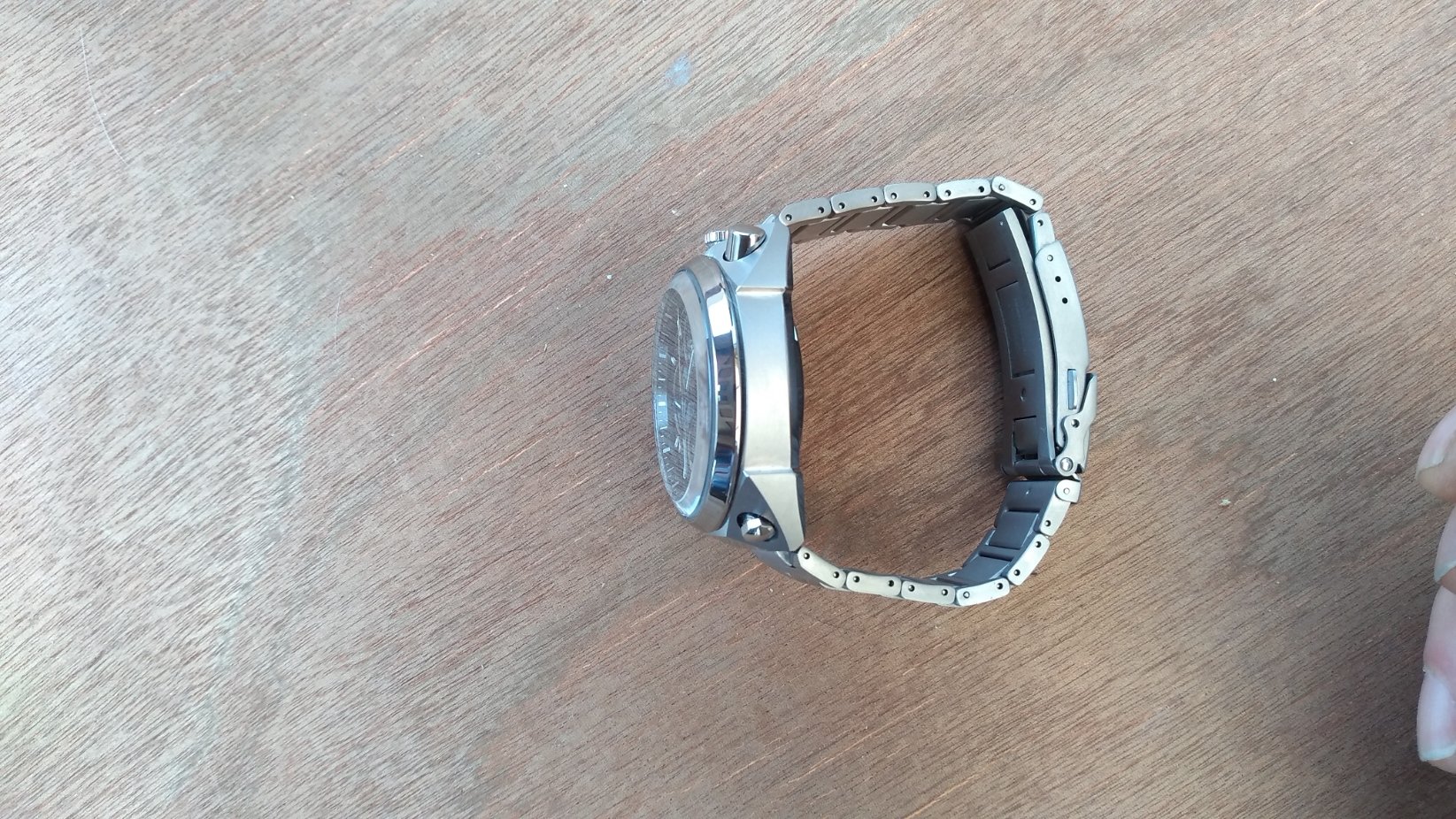De verkoper had me al gezien en had het horloge reeds klaar genomen, meteen, met een grijns op mijn gezicht, het aangepakt en het eerste wat me opviel was hoe licht dat horloge was, aangenaam verrast, maar ik had het moeten weten (super titanium) weet je wel?