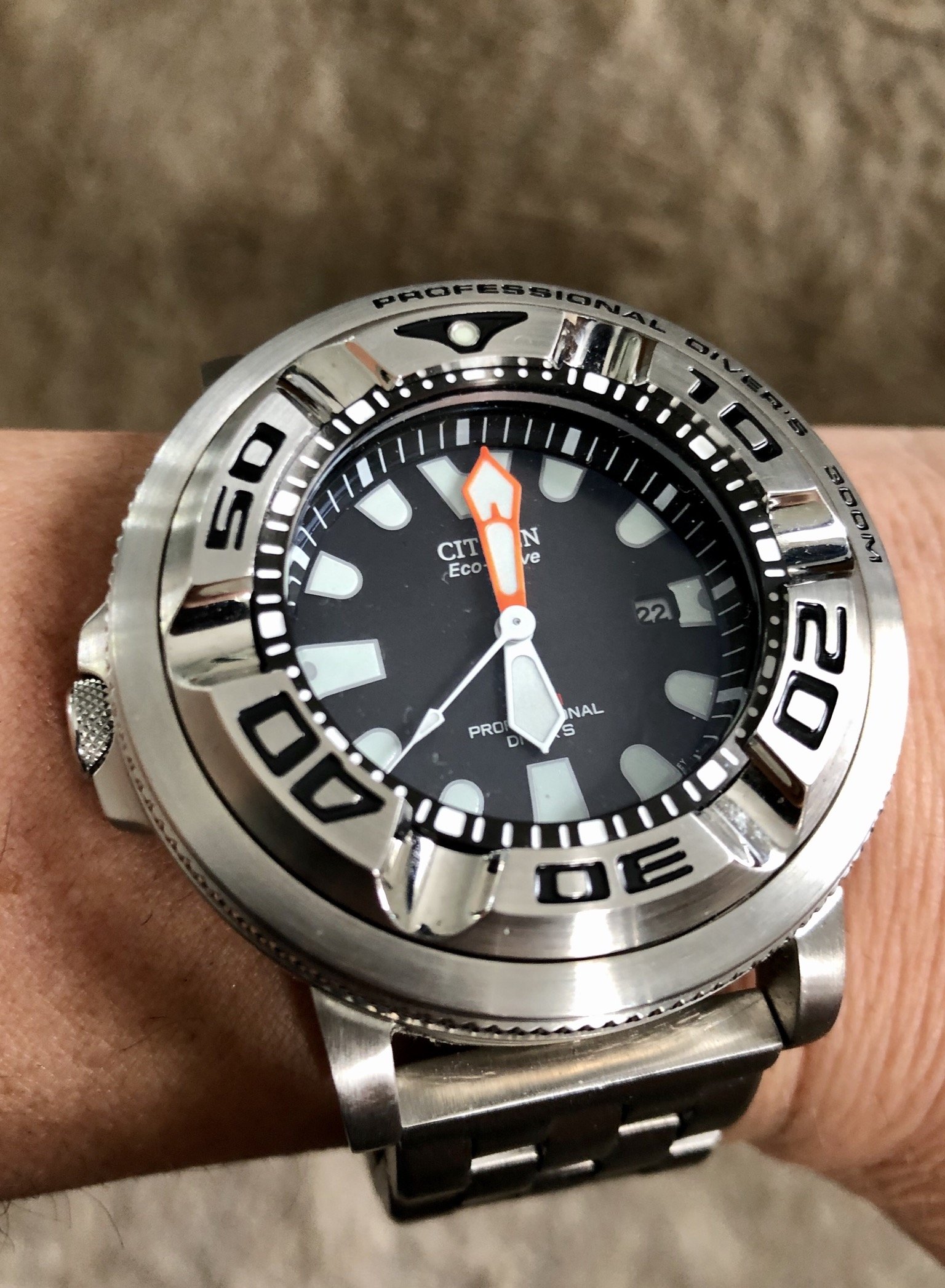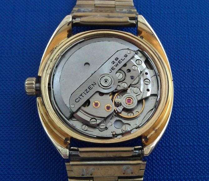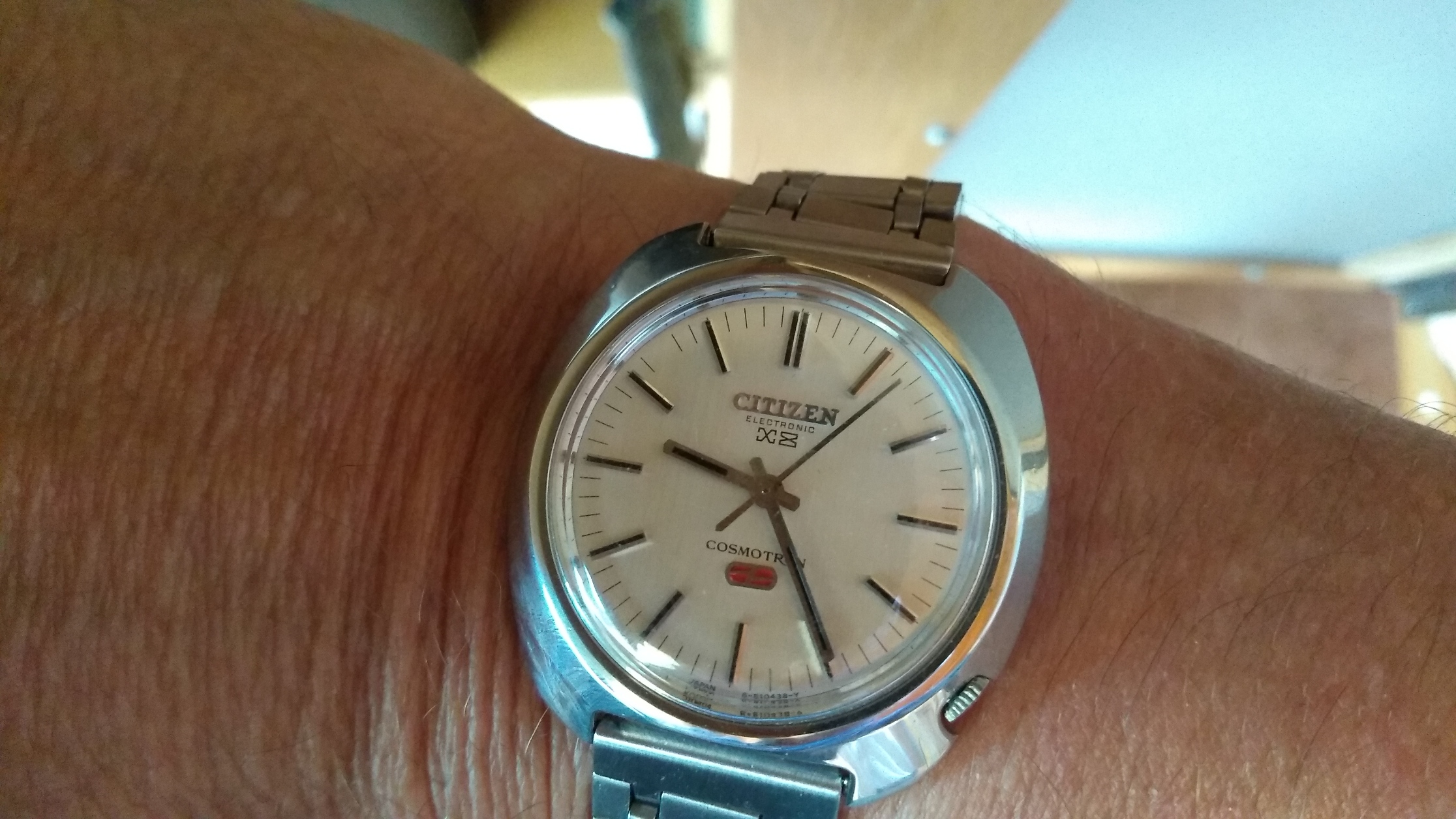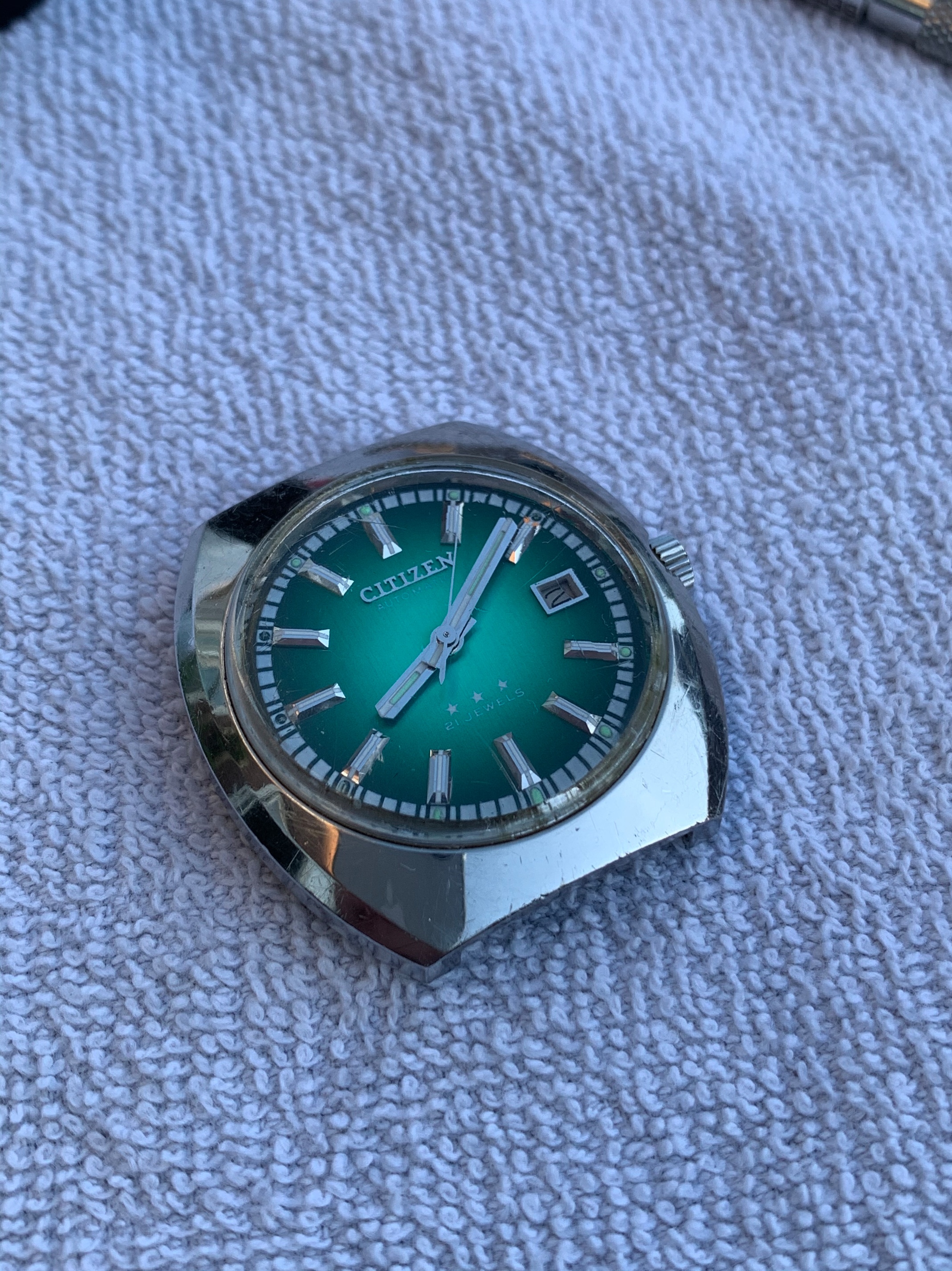 Mijn eerste Citizen. Het is een 72-6052. Het was een gokje voor weinig geld. Helaas bleek hij toch een service nodig te hebben. Glaasje en kast vervolgens een beetje gepoetst en voilà, op en top seventies! De wijzerplaat gaat afhankelijk van het licht van donker naar verblindend groen, wat nog versterkt lijkt te worden door het facet in het glaasje.
